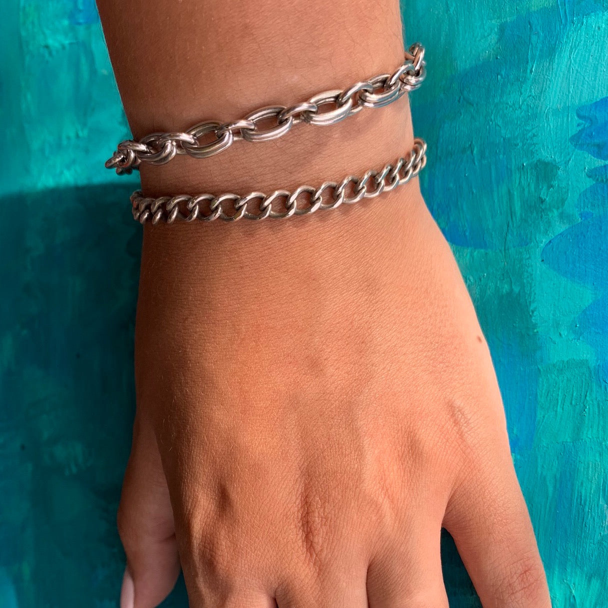 This sterling silver bracelet is composed of double oval links connected with sterling rings. It closes with a chunky lobster claw clasp. This bracelet makes an edgy statement worn alone or in a stack. It would also make a lovely charm bracelet.