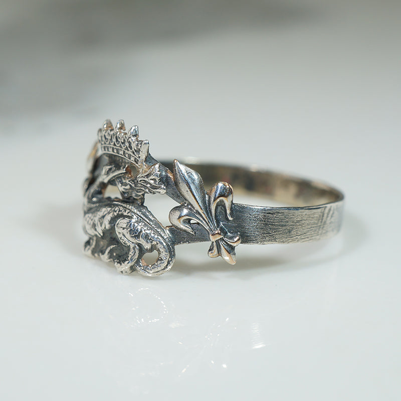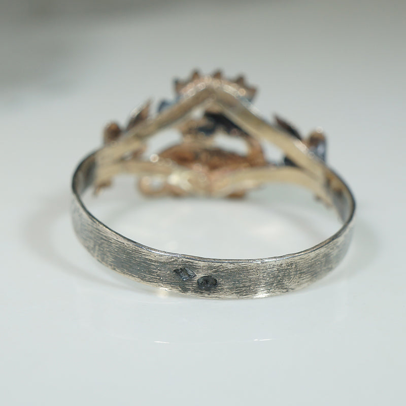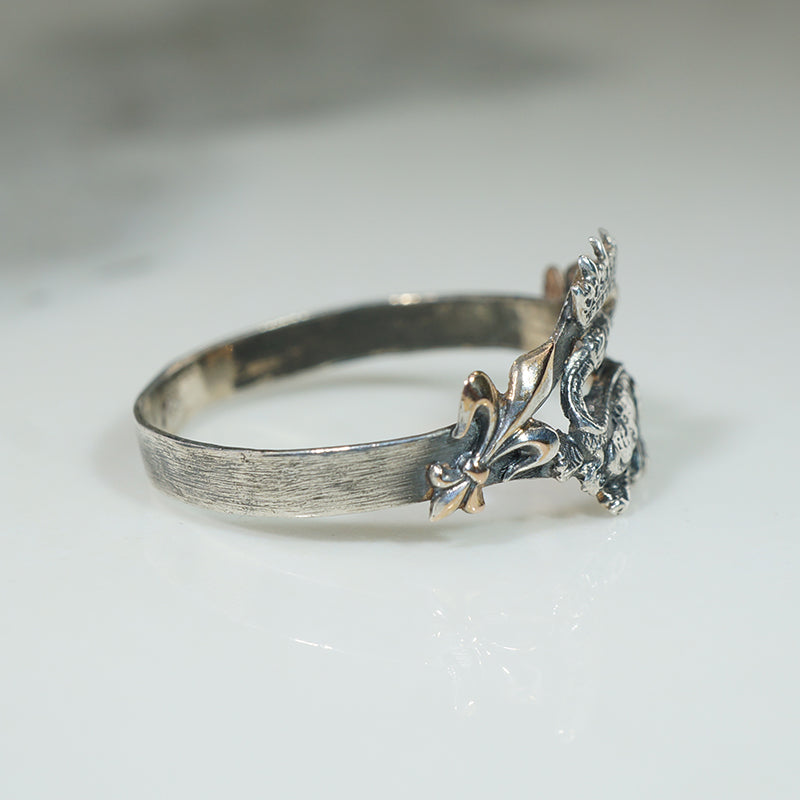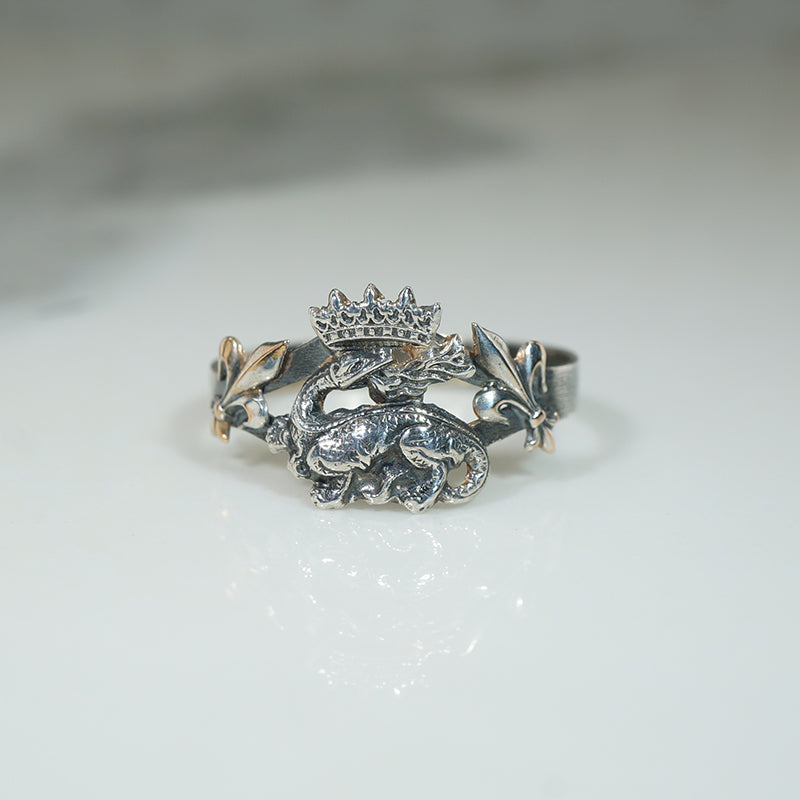 This fun French ring was likely a souvenir. The front has a dragon breathing fire into a crown with a gold tinted fleur-de-lis to either side. Circa 1900, this ring is more for admiring than wearing.