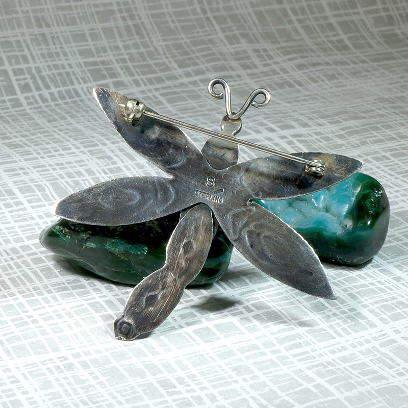 A delightful dragonfly brooch ready to alight upon your jacket. The sterling silver body of this whimsical insect is bezel set with an oval blue turquoise and a teardrop of green turquoise. Her wings and tail are stamped with elaborate rocker designs resembling feathered shields and, perhaps, snakes. "Sterling" and the maker's mark "S" are stamped on her back. This charming brooch is generous in size and ideal for wear on a heavier fabric. Circa 1960.