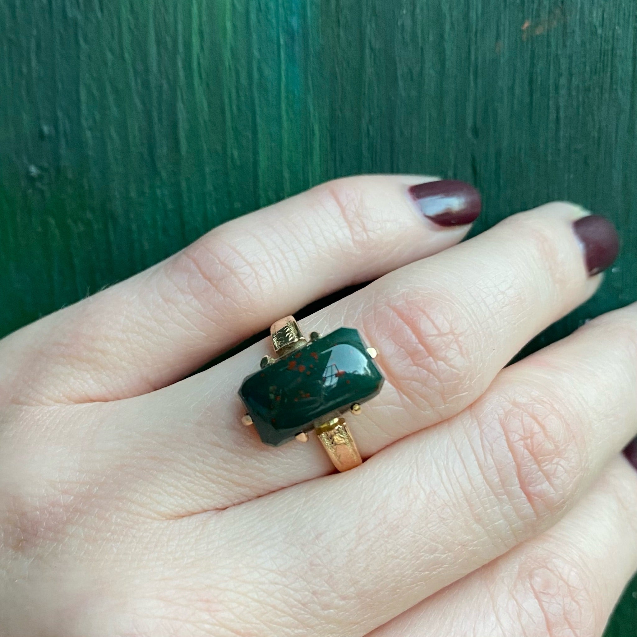 Applied Prongs and engraved shoulders give this 19th century beauty some drama. The deep forest green blood stone with just the right amount of red is a gorgeous thing, high domed and loaf shaped. Blood stone is said to aid in protection, purification, and courage. The gold is 14k in that mellow color old gold has, less garish than modern gold. Circa 1880.