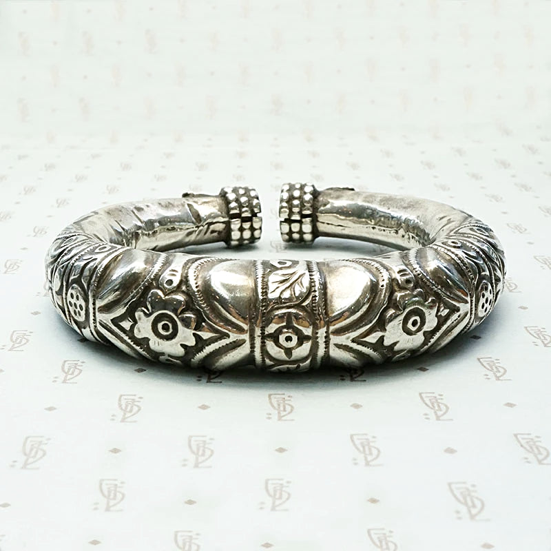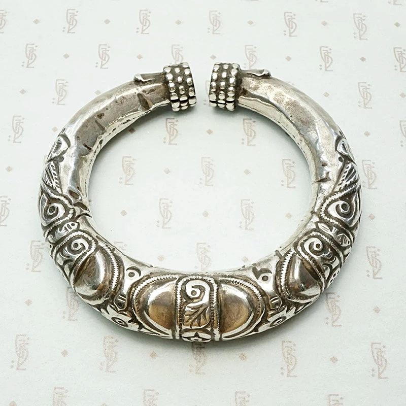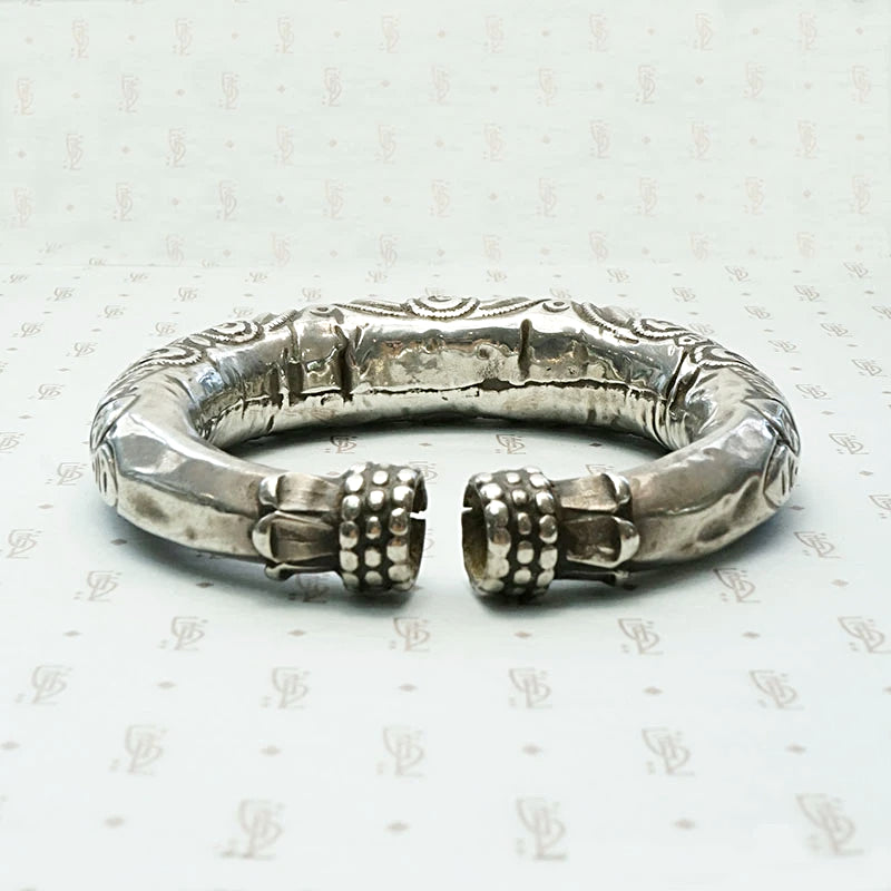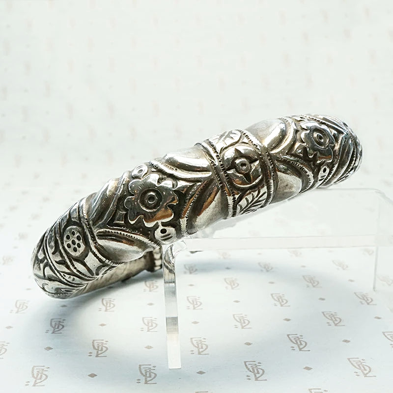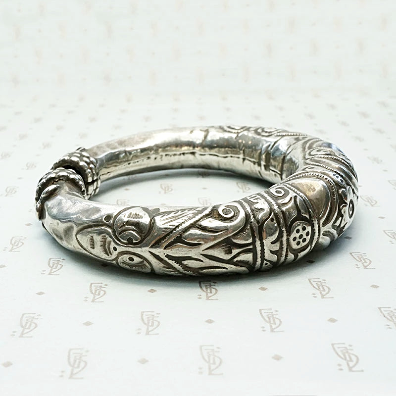 This dramatic silver bracelet was made in Burma in the late 19th Century. The hand made bracelet is elaborately decorated with geometric leaves and flowers using the three dimensional repoussé metal working technique. The cuff is quite wide in the front and tapers down to lotus leaf motif terminals. The interior of the cuff shows pleats and a seam. An incredible statement piece. Circa 1890.