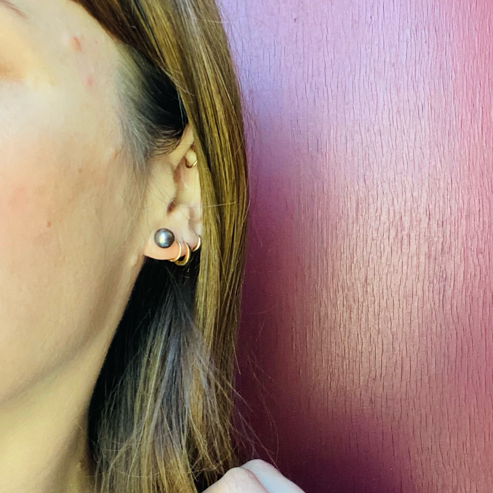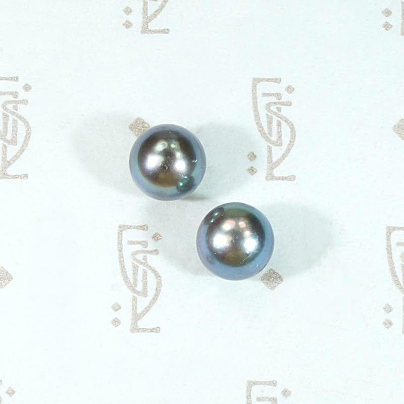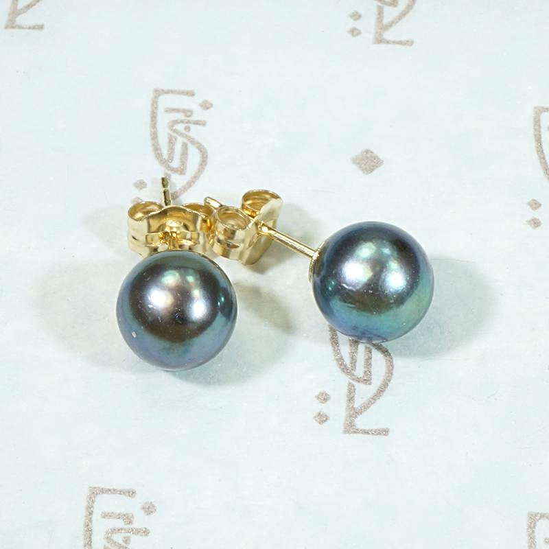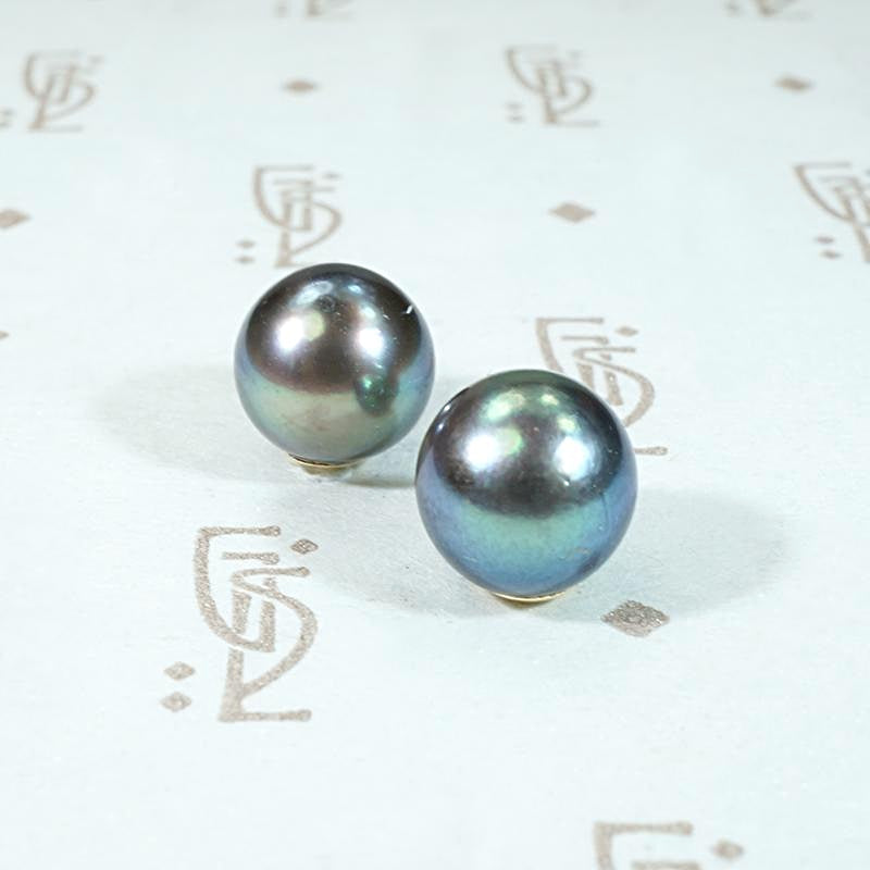 Everyone needs a pair of pearl stud earrings, they are a timeless wardrobe essential. These studs are the most glamorous option. Moody and dramatic peacock pearls flash with rich iridescent tones. The play of light on these pearls brings out deep hues of purple, magenta and green. The gorgeous vintage pearls sit in 14k yellow gold cups, with friction posts and tension backs.