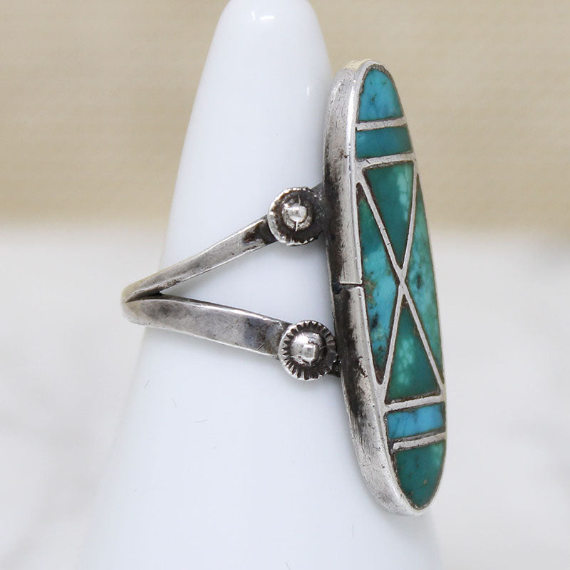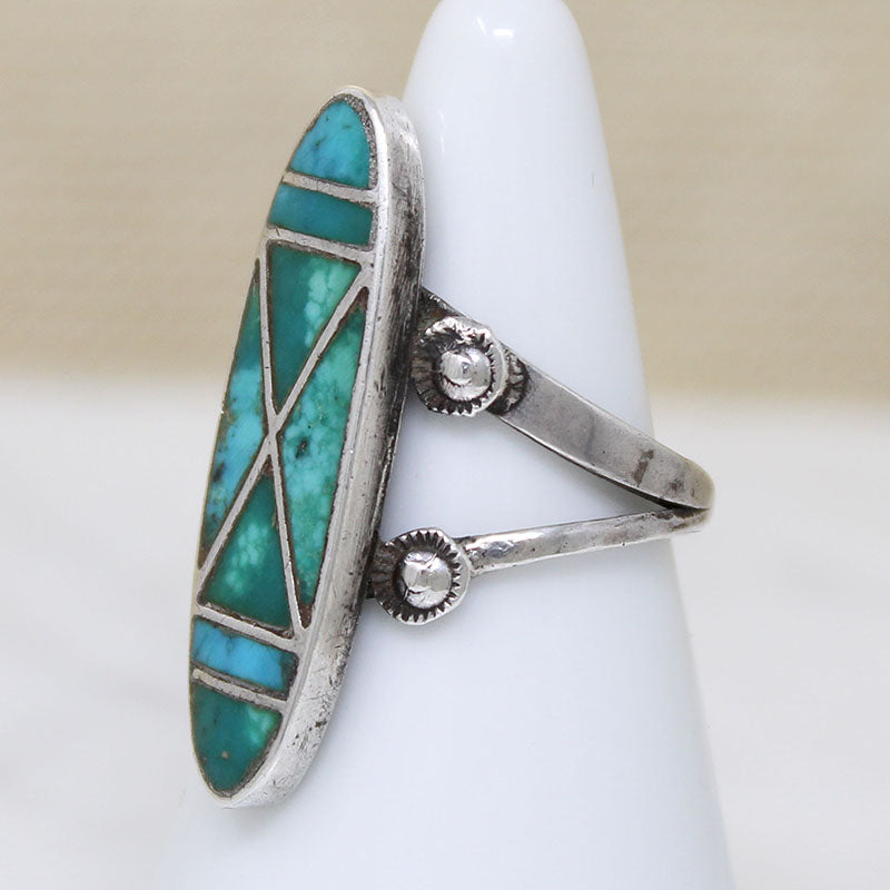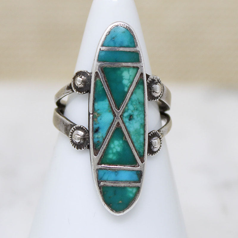 Brilliant turquoise lapidary work gives this navette ring its dramatic appeal. Intersecting sterling silver lines creates a pattern of crisp geometric inlay. Every hue of saturated teal and aquamarine mottle the carefully cut turquoise. Wide split shoulders applied with decorative bosses taper into the slender sterling silver band. The perfect accessory for your favorite summer dress. Circa 1960.