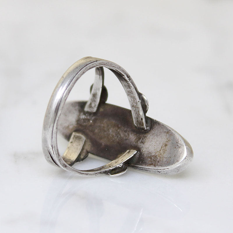 Details.....Currently a size 6.25. The top of the ring measures 9.2mm by 30.4mm, and the band is 2.4mm wide. In Very Good Vintage Condition. You should always expect some wear on your vintage and antique jewels; we consider it a part of their charm.