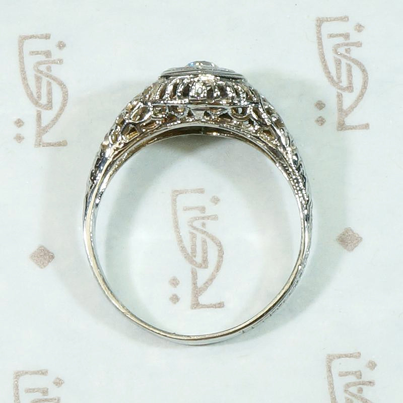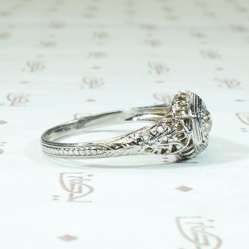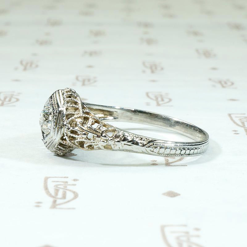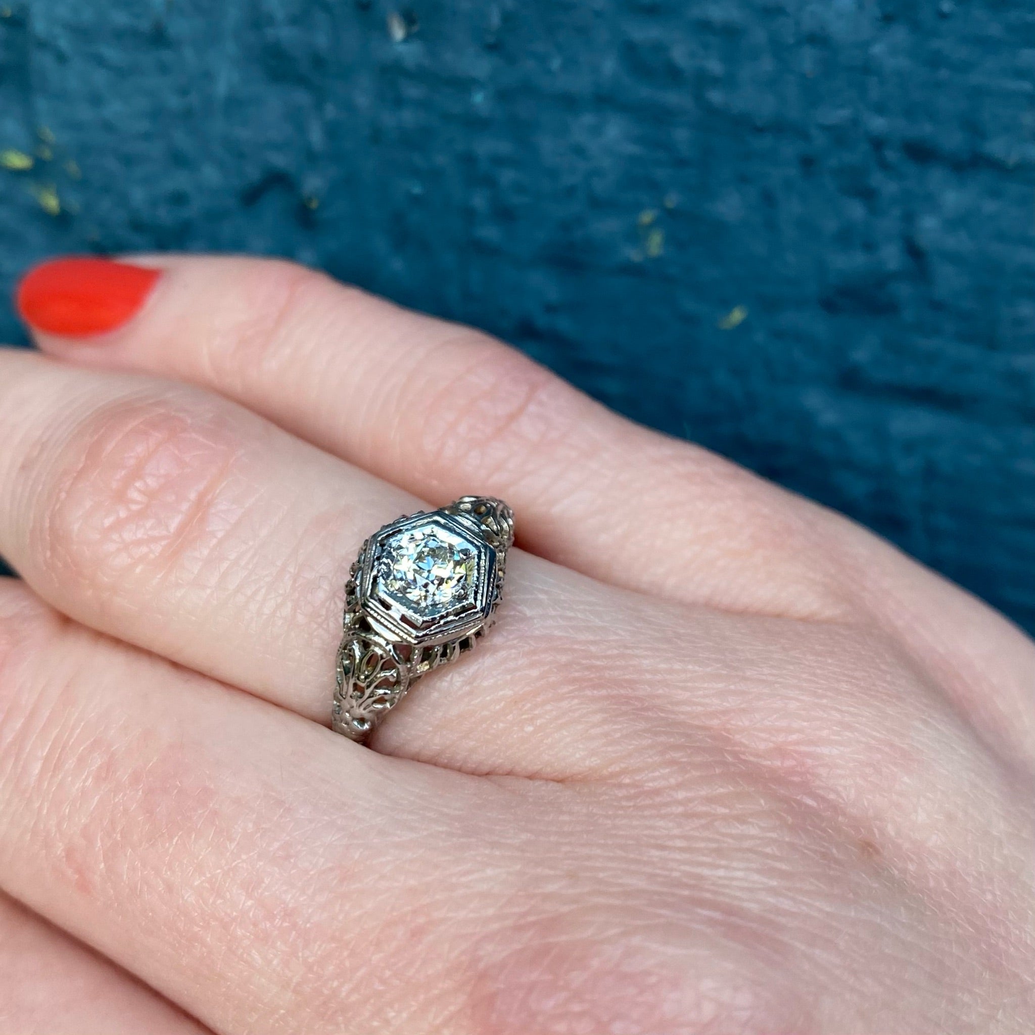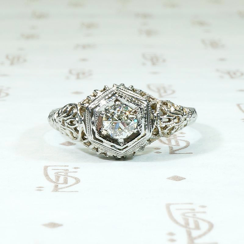 Dreamy curves and lacy metalwork make this Art Deco engagement ring special. A sparkling 0.25ct old European cut solitaire diamond sits in an 14k white gold filigree setting. The diamond is set in a classically Deco hexagonal head. The lacy shoulders are engraved with forget me not flowers and they taper back to a decorative band. The elegantly arched gallery is rich with wonderful filigree detail. Puffy filigreed engagement rings like this one pair beautifully with our Recycled Revival curved wedding bands. Circa 1920.