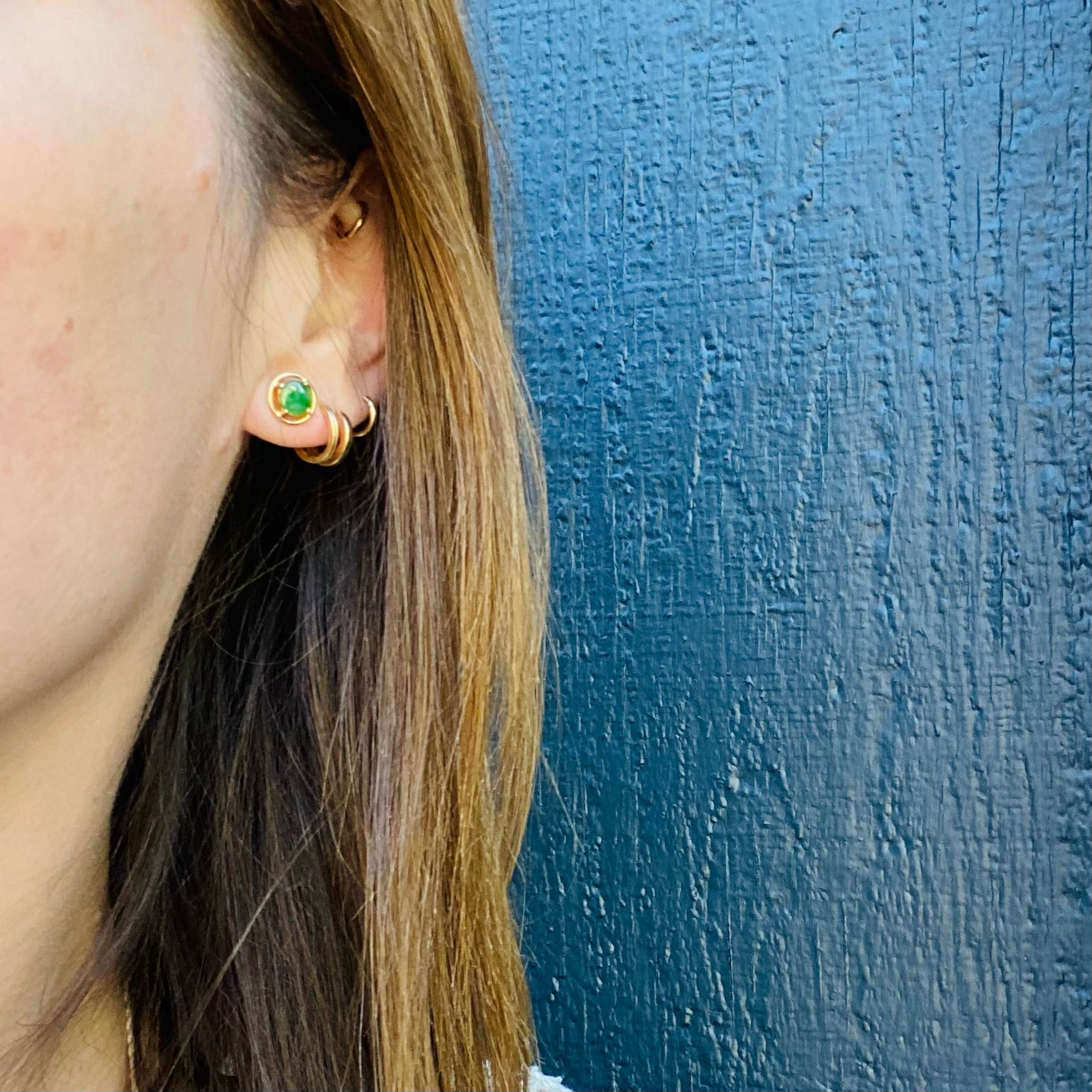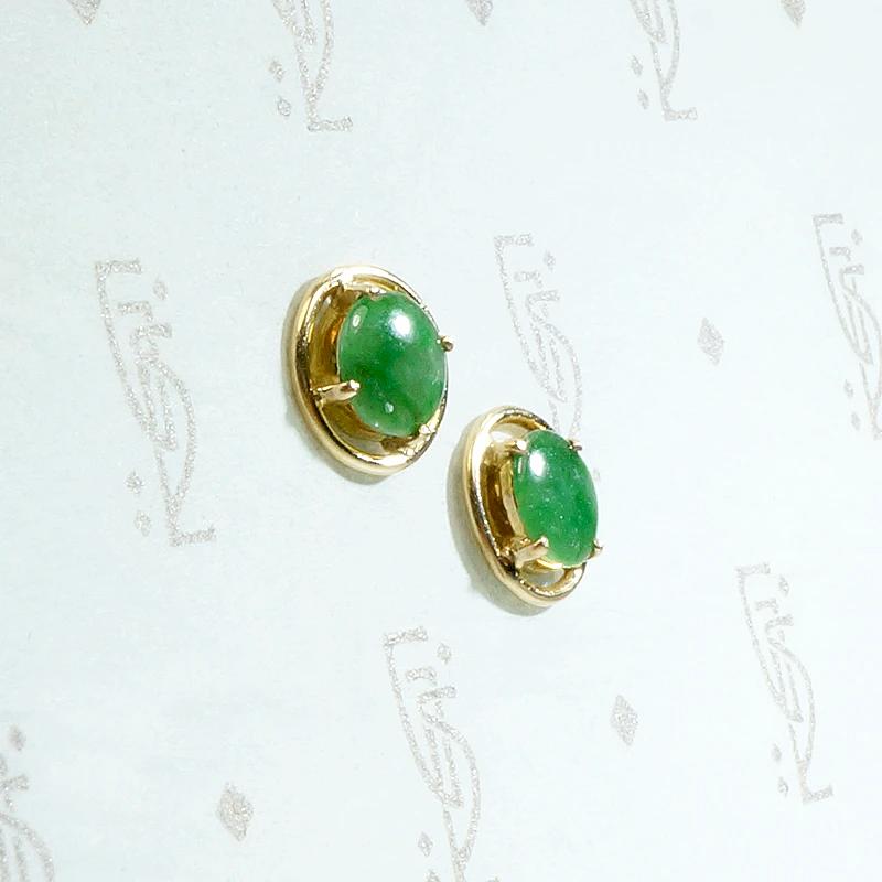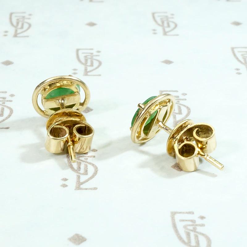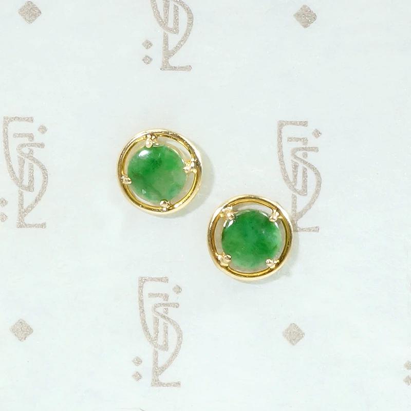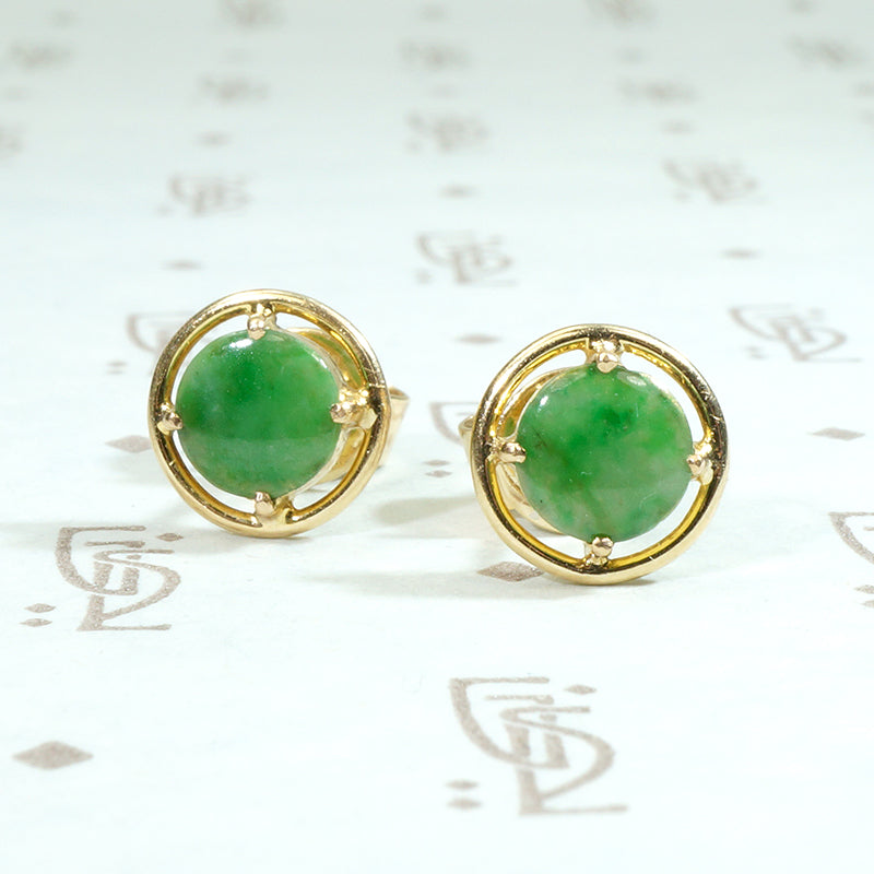 Gorgeous discs of jade are prong set in halos of gold. The dreamy green of the jade pairs perfectly with the rich 14k yellow gold. These elegant stud earrings are a lovely choice for daily wear. Circa 1950.