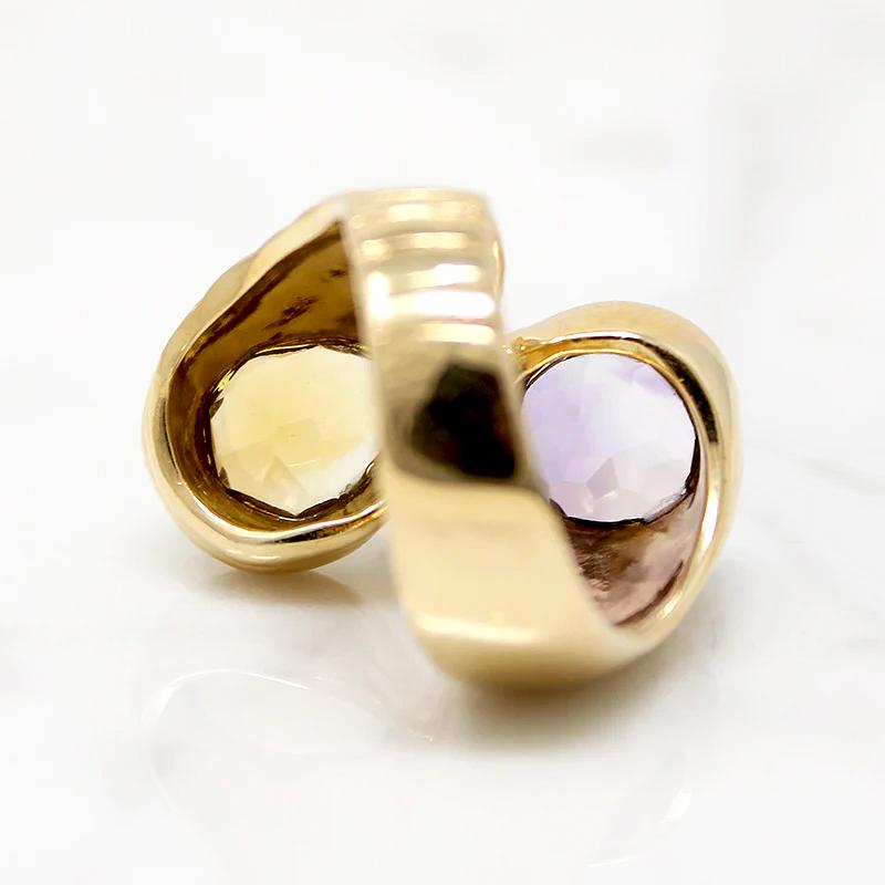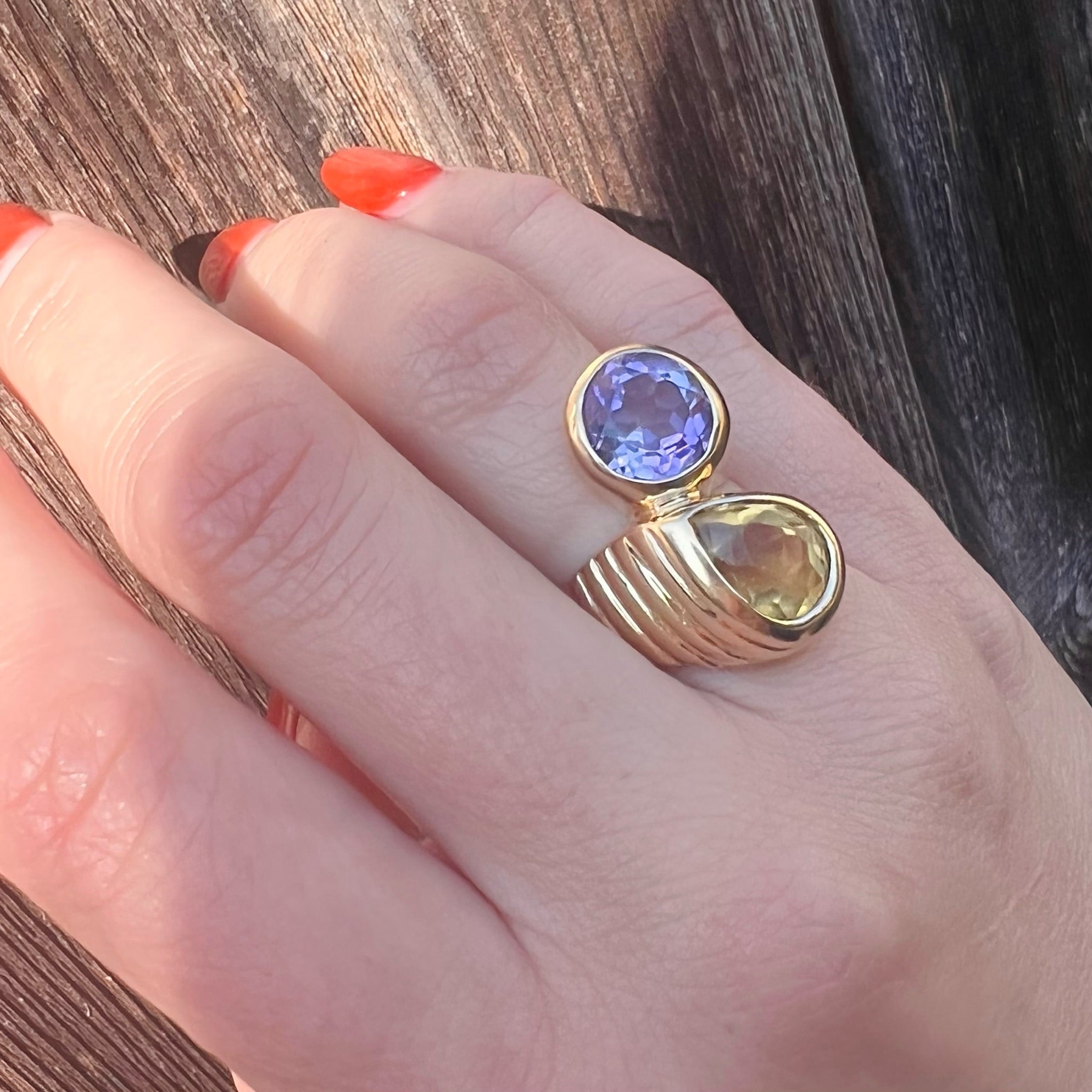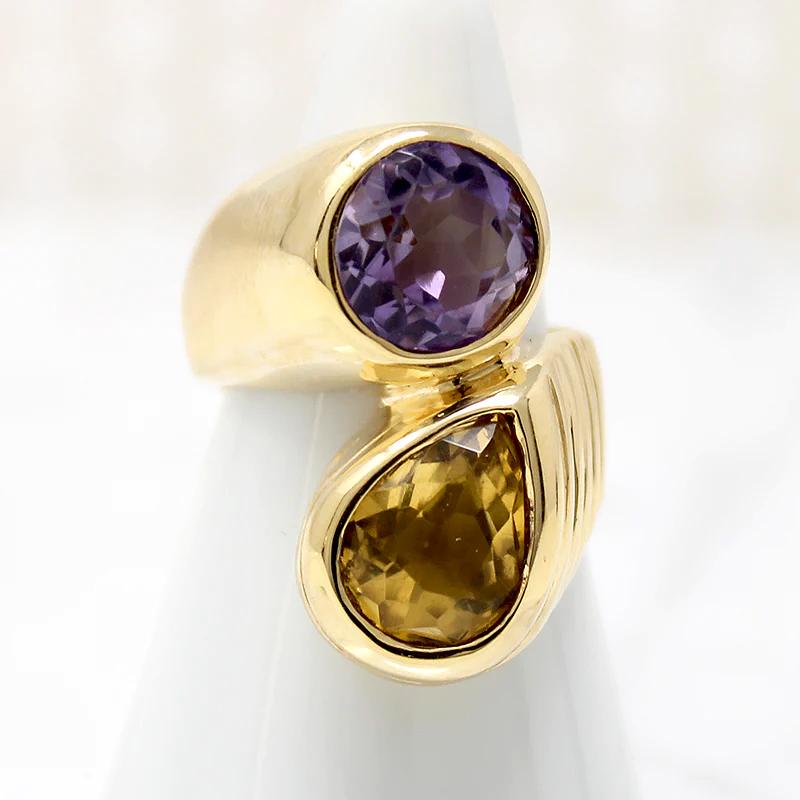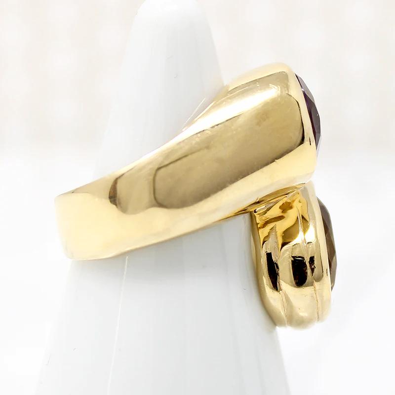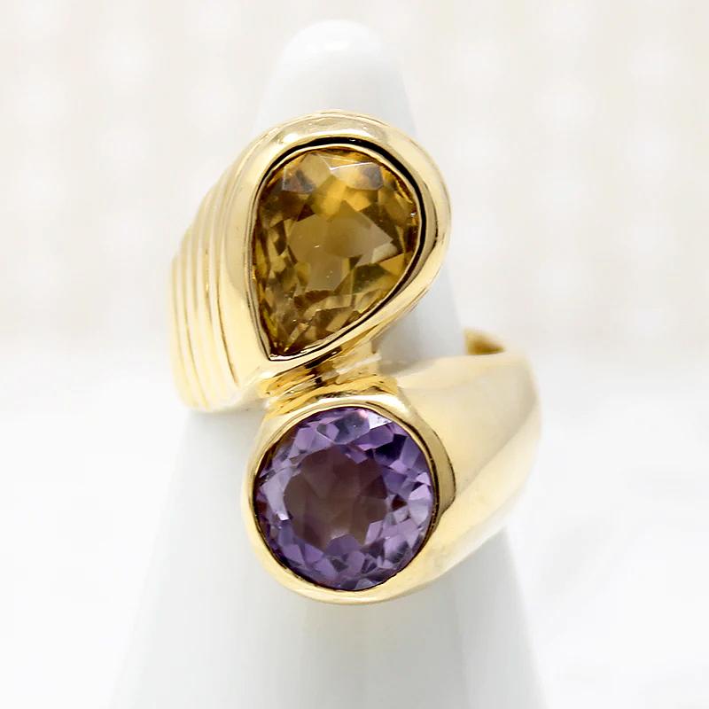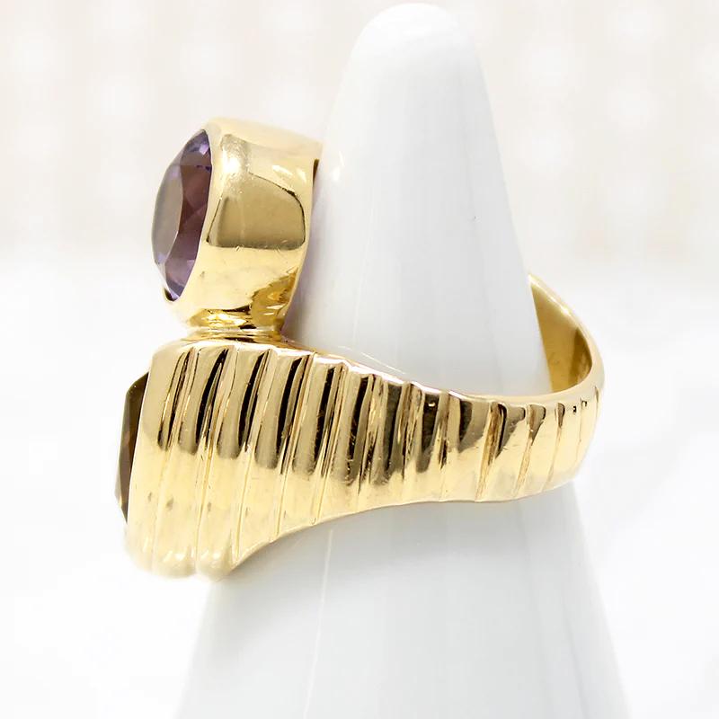 This dynamic 1980s statement ring is, at its heart, a romantic Toi et Moi ring. Colored gemstones are bezel set at each end of an oversized 14k yellow gold crossover ring that wraps around the finger with maximum coverage. The 2.25ct round amethyst and 2ct pear cut citrine are a bold, complimentary color combination. The citrine end of the band is deeply ridged while the amethyst end is smooth and polished. This incredible ring will always dominate the room. Circa 1980.