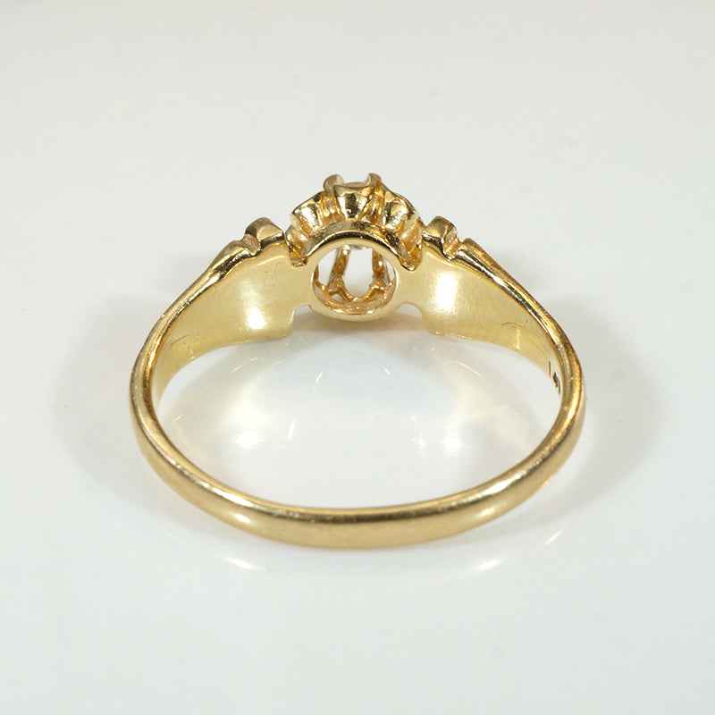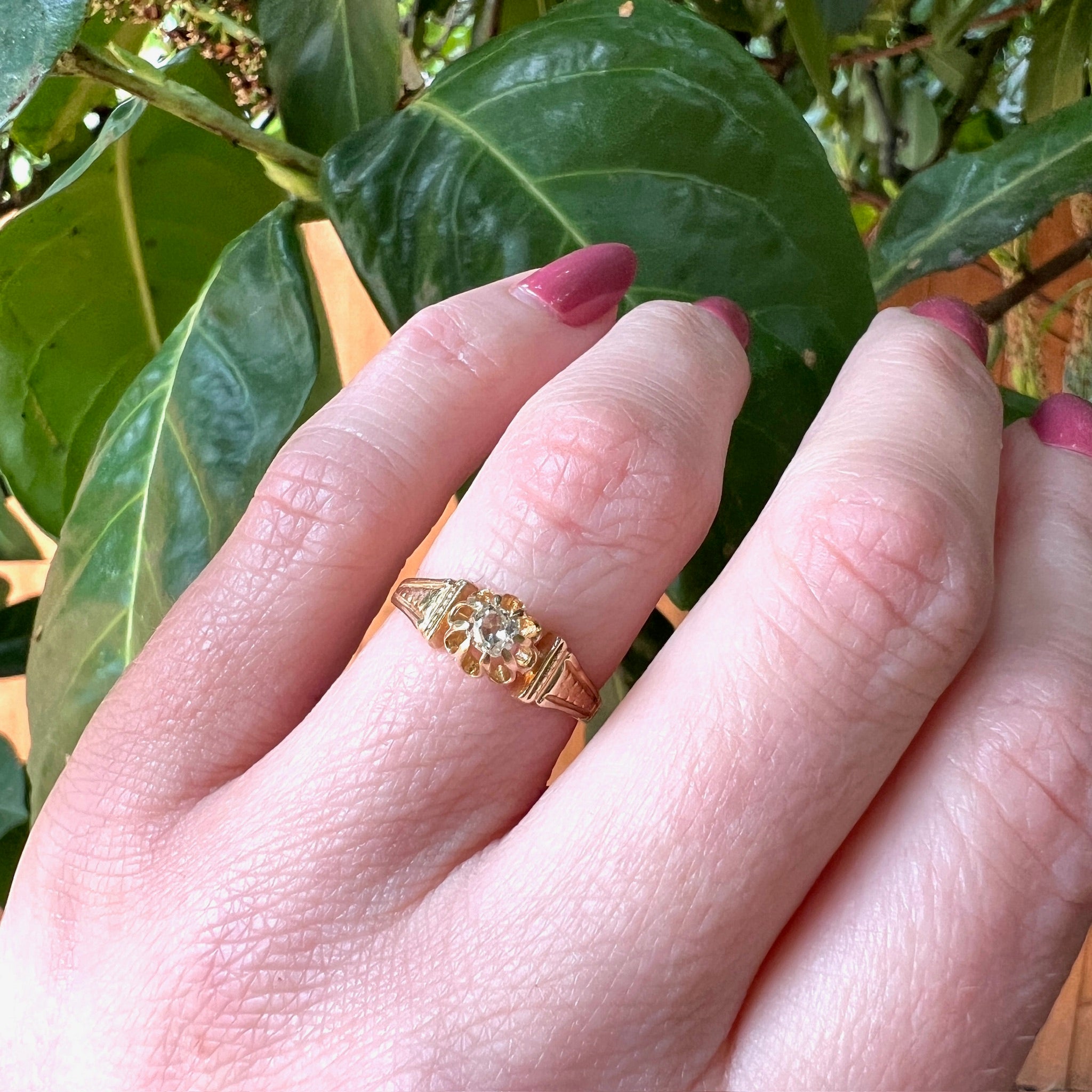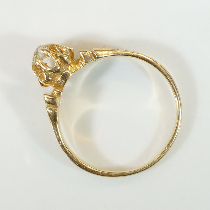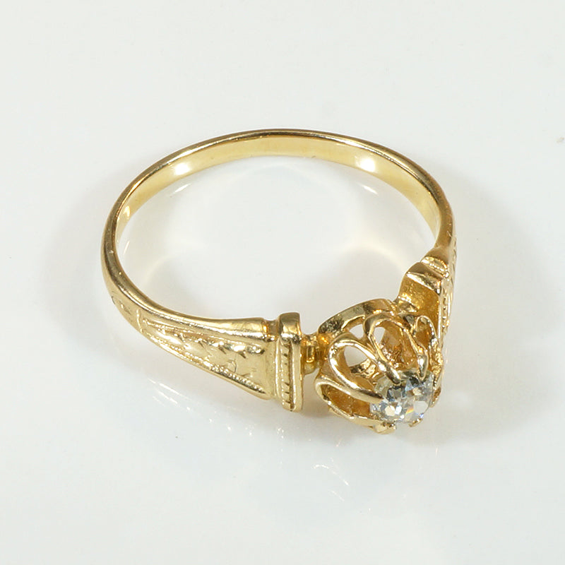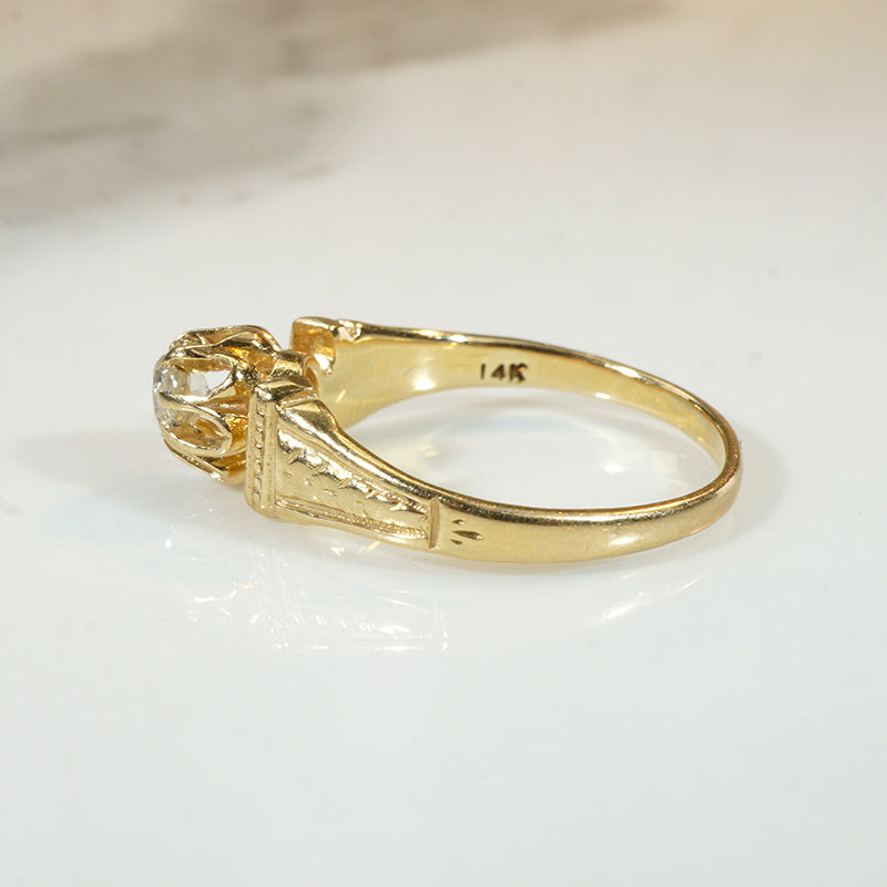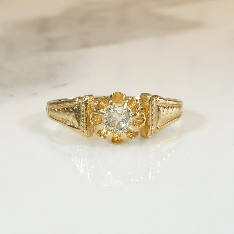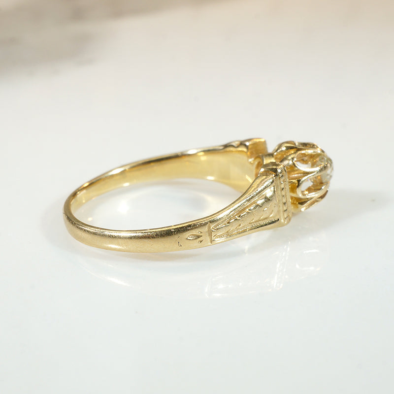 Charming details and an eccentric diamond set this antique engagement ring above the fray. The .24ct old mine cut diamond has an SI clarity and K color, with an asymmetric, chunky crown and a fat open culet. This unique diamond is displayed in a petal-like eight-prong belcher head, flanked by tapered shoulders engraved with a laurel leaf motif. This Turn of the Century solitaire is sweet and feminine, imbued with Edwardian romance. Circa 1900.