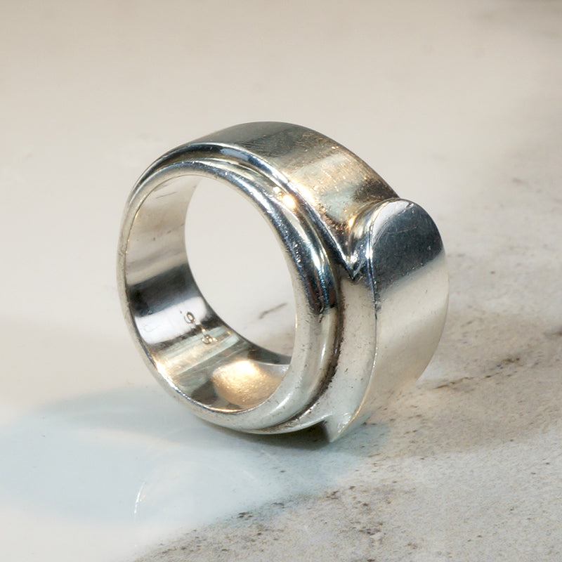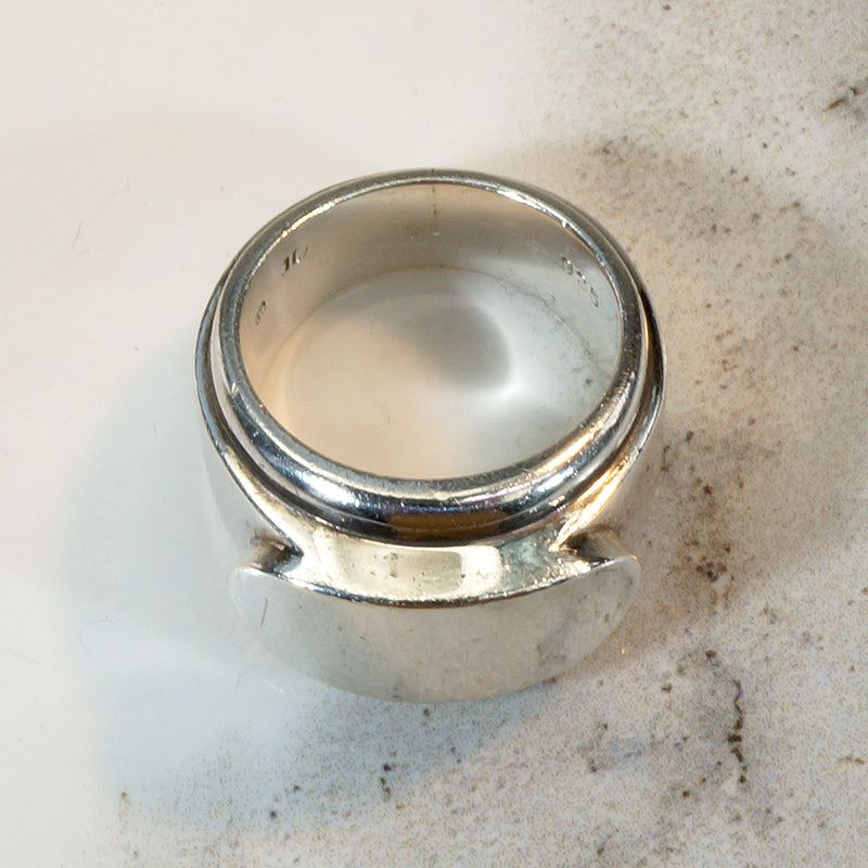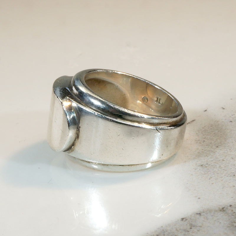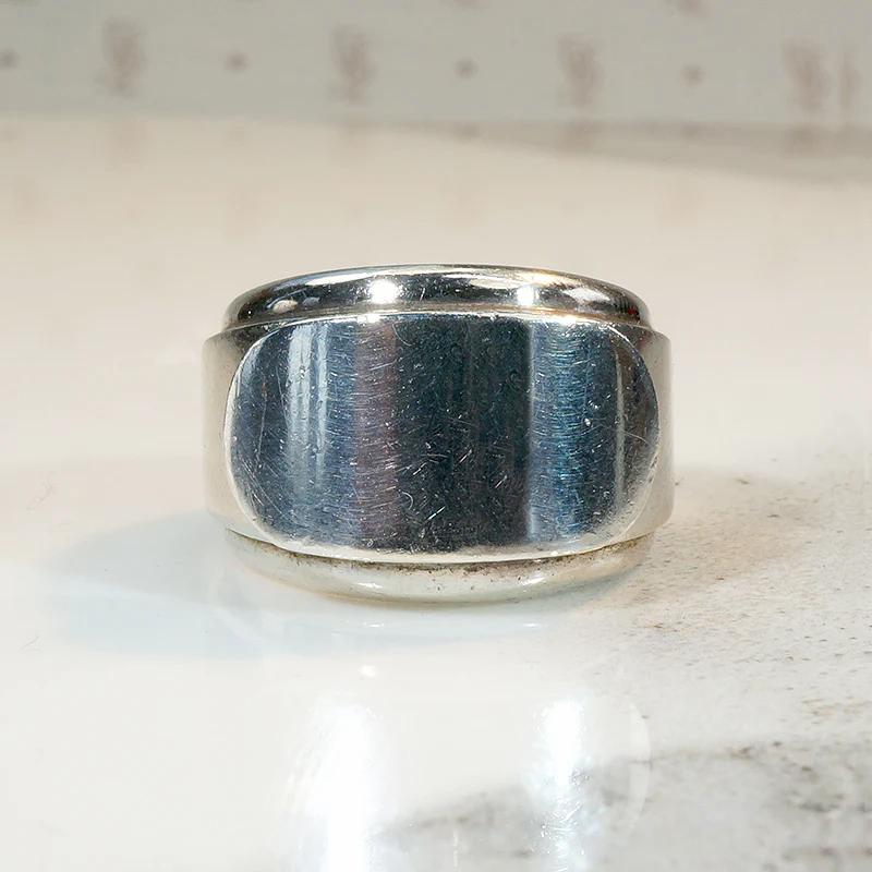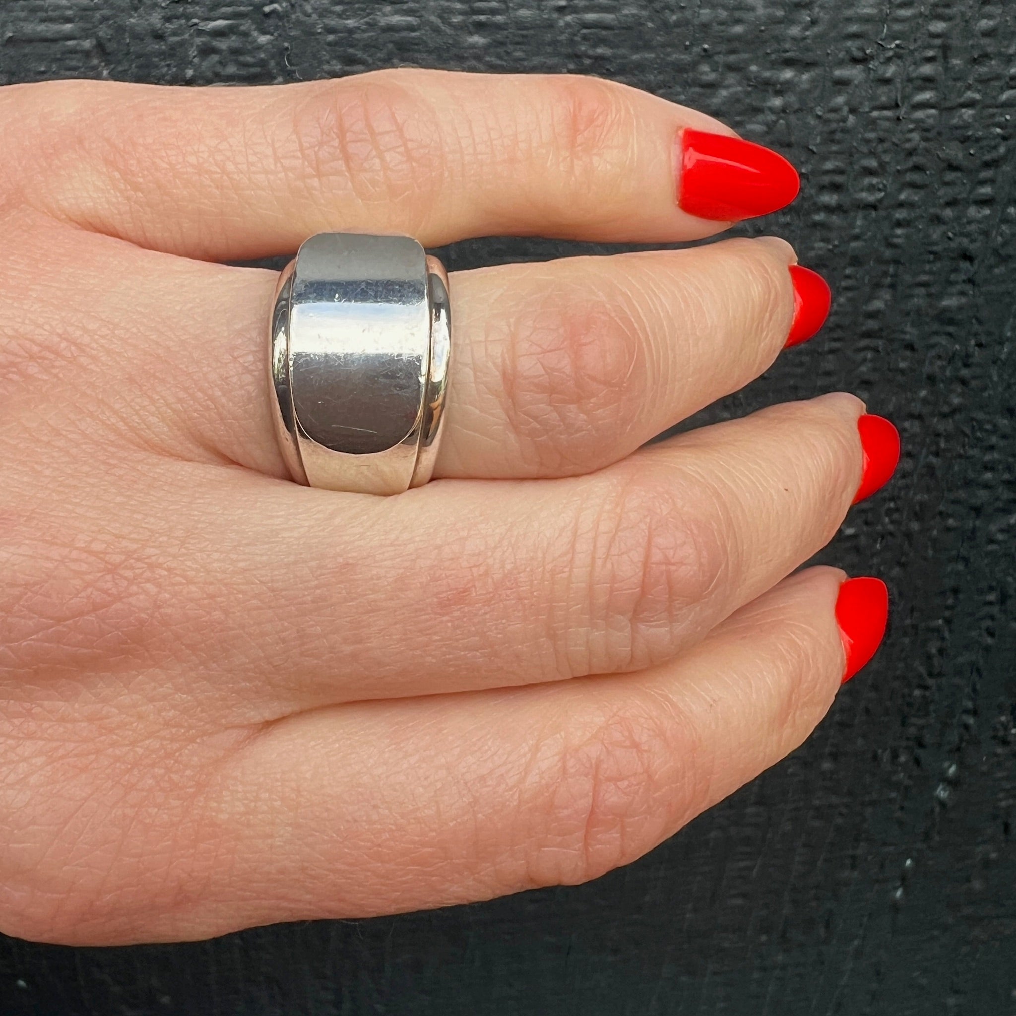 This edgy sterling silver signet ring has a cool, modern design. A heavy, wide silver band with a stepped edge tapers to a substantial shank. A raised oval plaque curves across the top of the ring. The plaque is blank and ready to be engraved should you choose to do so. Circa 1980.
