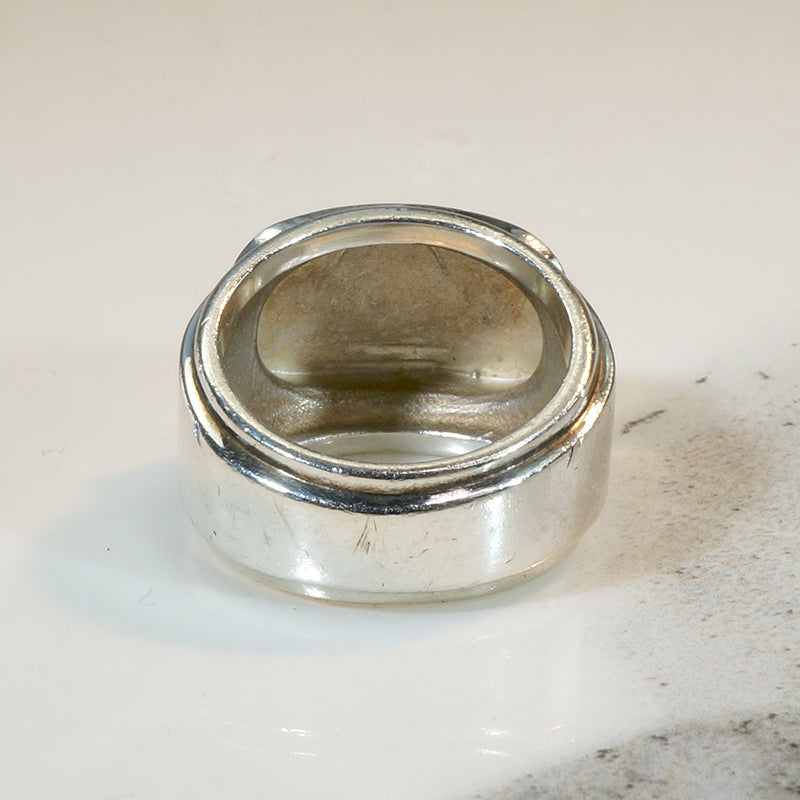 Details.....Currently a size 5.5. Please remember that a band this wide will fit more tightly than usual. For a fee, silver rings can usually be sized within two sizes. Contact us for sizing information about this ring. The top of the ring measures 13.8mm wide and tapers to a 7.2mm band. The plaque measures 17.7mm by 10mm. In Very Good Vintage Condition. You should always expect some wear on vintage and antique jewels; we consider it part of their charm.
