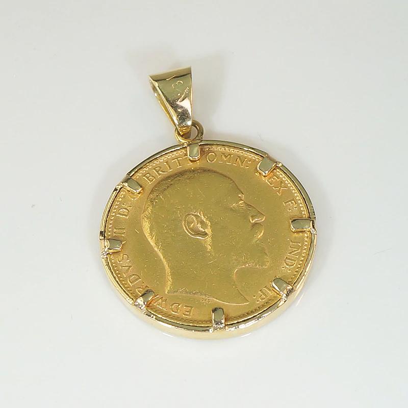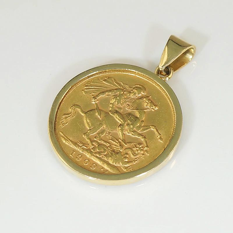 A rare 1909 22k gold sovereign featuring King Edward VII and St. George and the Dragon is displayed in an 18k gold pendant frame. The obverse, or "heads," of the coin depicts King Edward VII in profile and the legend "EDWARDVS VII D: G: BRITT: OMN: REX F: D: IND: IMP:" around the edge. The reverse, or "tails," depicts St. George and the Dragon with the year "1909." It's a beautiful coin, the depiction of St. George on horseback slaying the Dragon is dynamic and exquisitely rendered. The pendant frame has a large bale, making it easy to wear the coin any way you like.