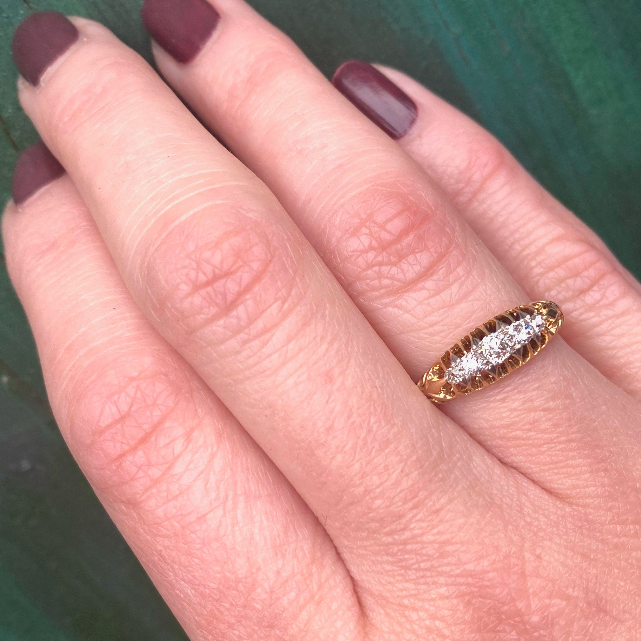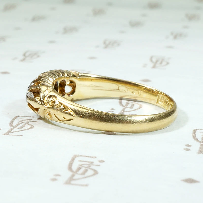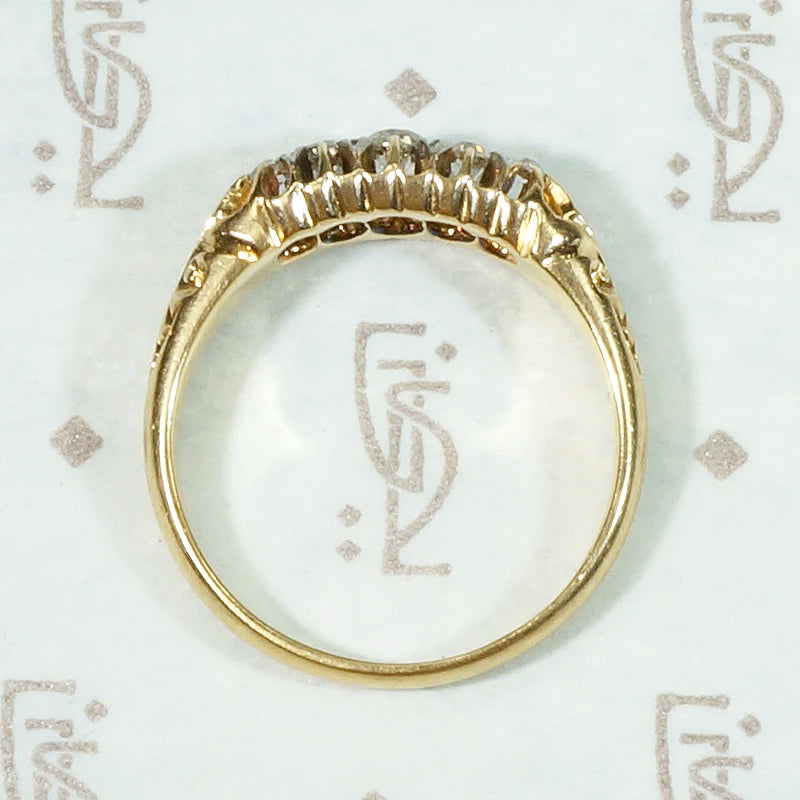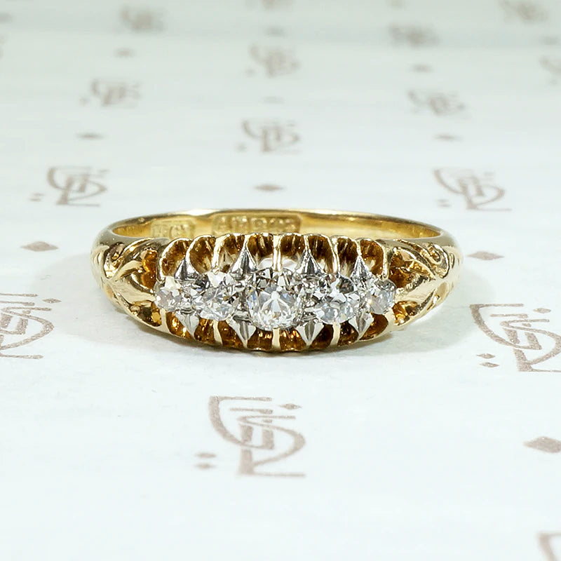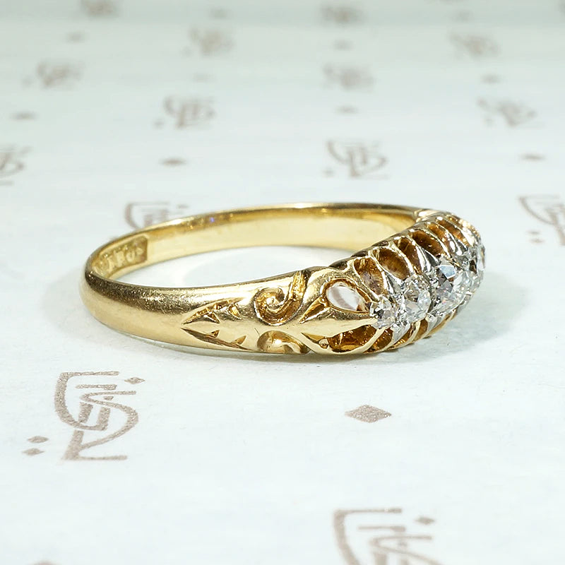 A lovely Edwardian diamond belcher band with finely sculpted details. Five graduated old mine cut diamonds are set across the top of the ring in the classic belcher method, with an unusual feature: alternating prongs are platinum. This creates an interesting effect. The glowing 18ct yellow gold shoulders are sculpted into an acanthus leaf motif. Great in a stack or on its own, a belcher ring is a must have for any antique jewelry collection. Circa 1900.