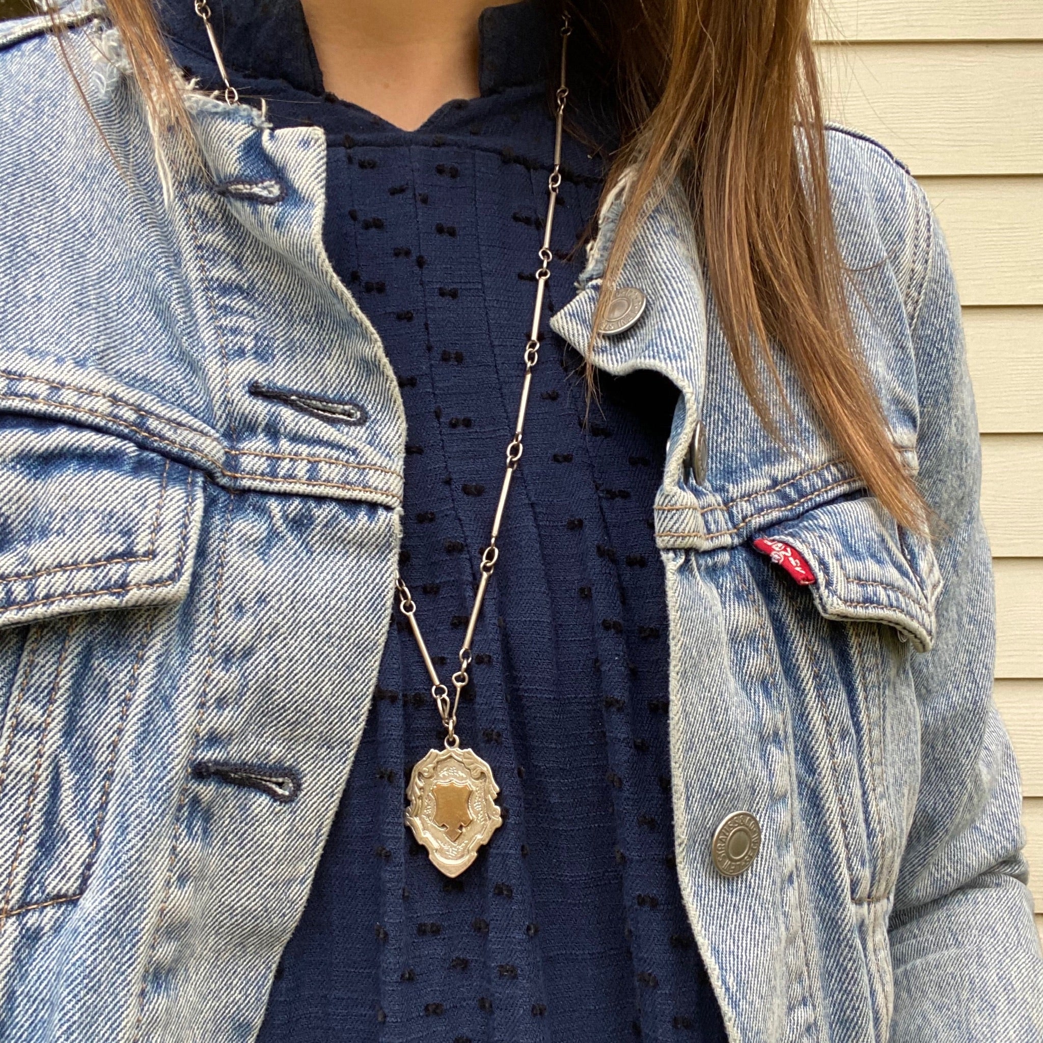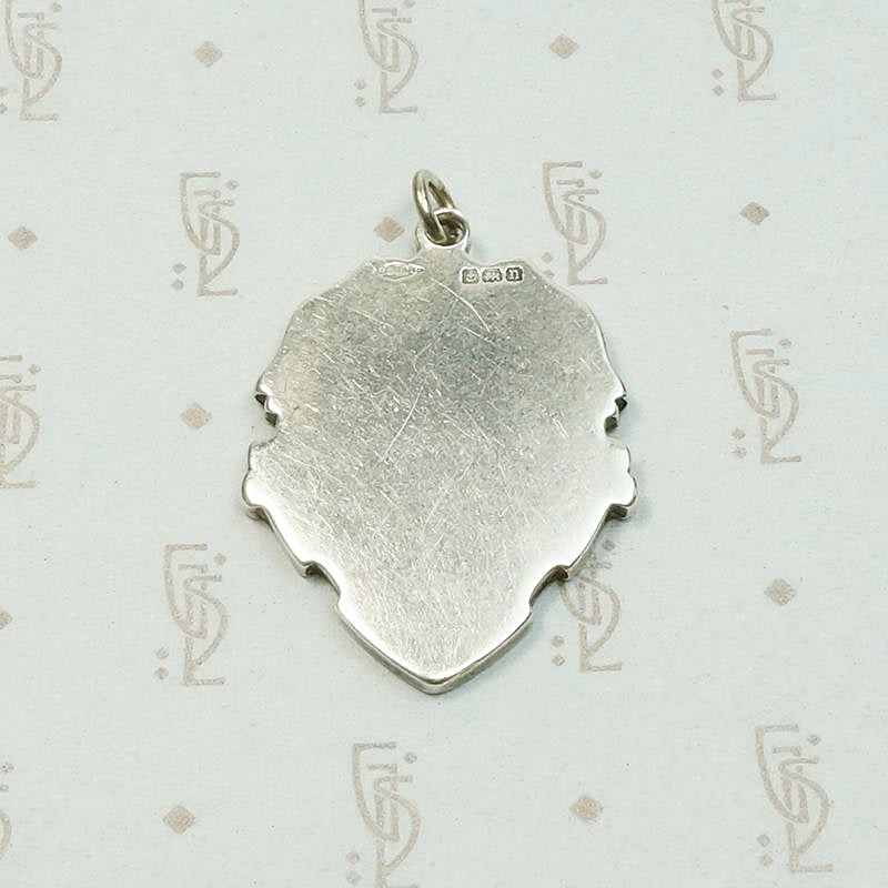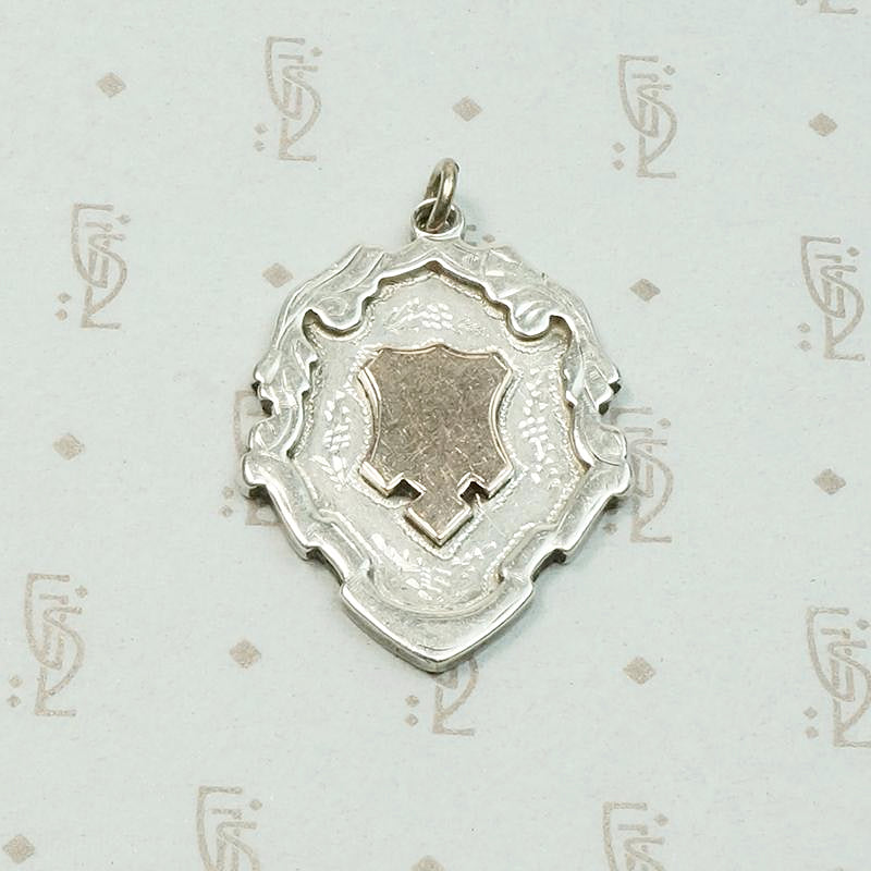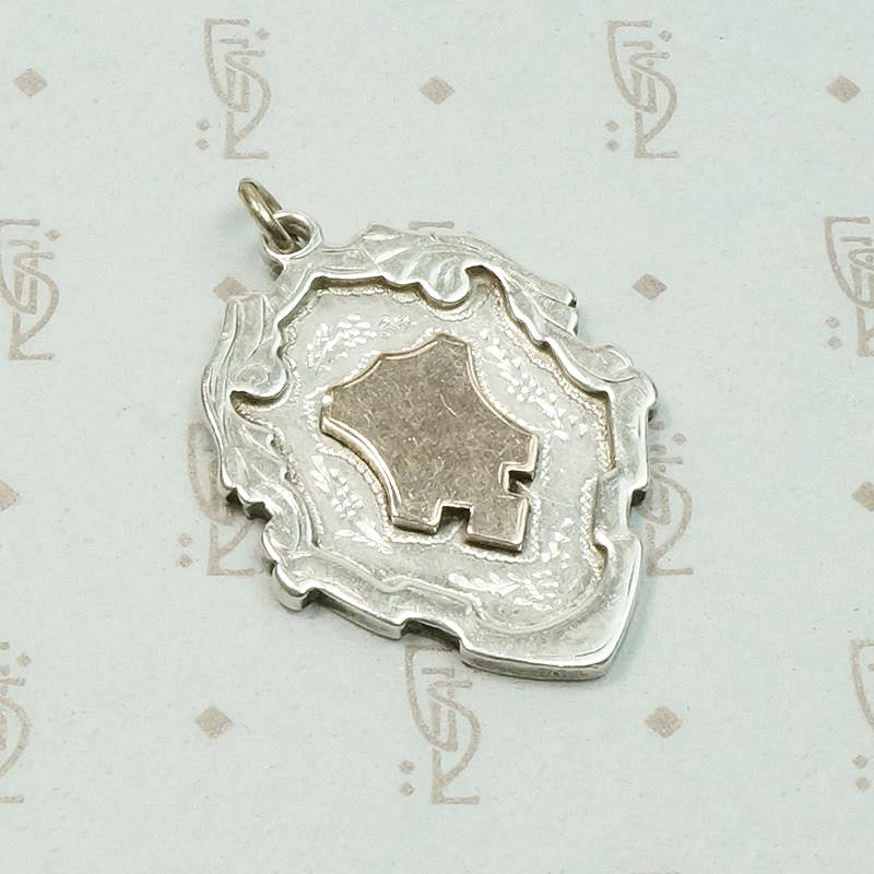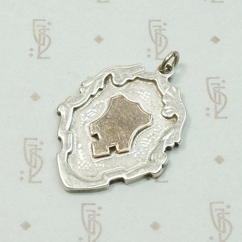 A handsome gold on sterling silver English medal fob. This piece dates to the year before World War I started. The front of the medal has a gold shield on a engraved sterling surround with an ornate frame. The medal has no personal engraving. The piece is hallmarked for Birmingham, sterling silver and the years 1912-13. It is also signed with the maker's mark C&CO. This fob will make a pretty pendant, it has a sterling jump ring attached. It will look fabulous on one of our Ancient Influences married chains.