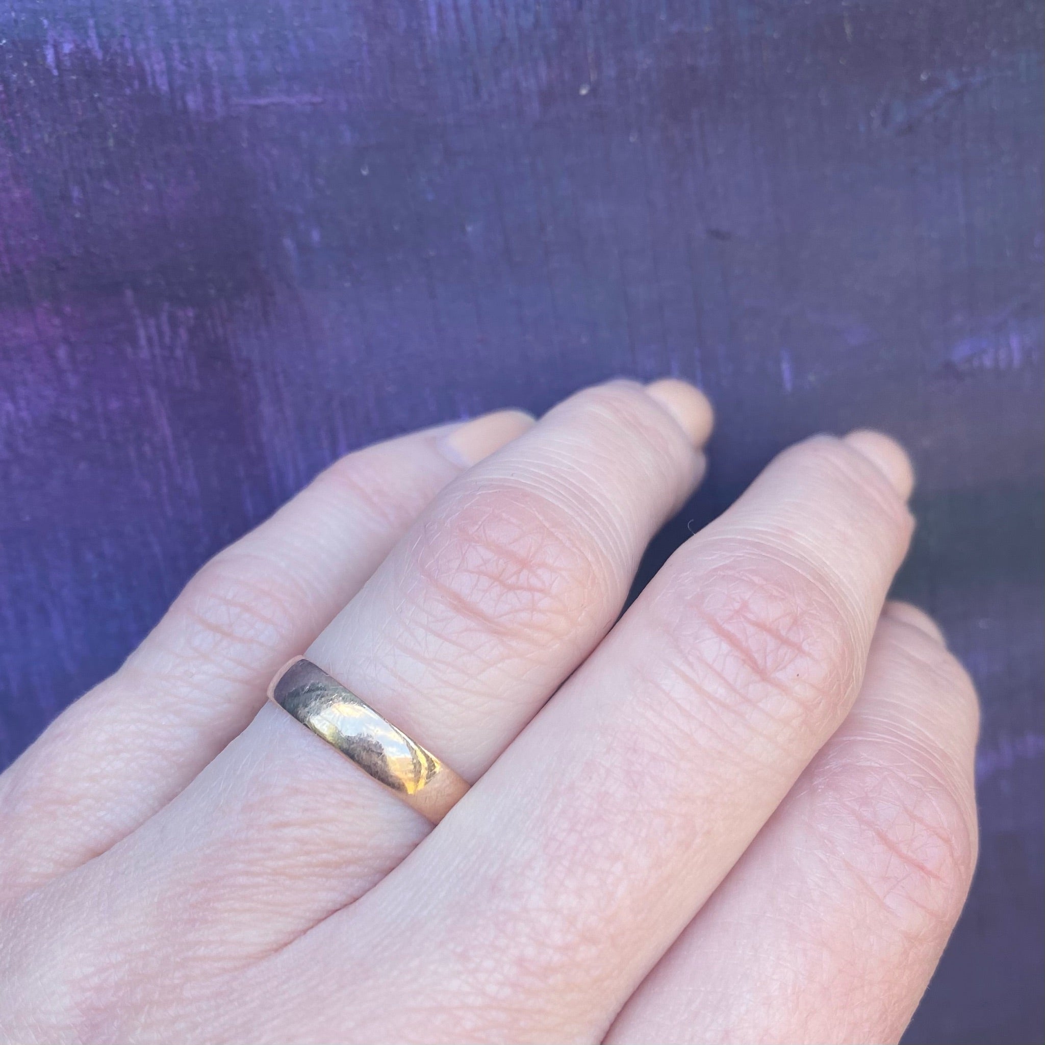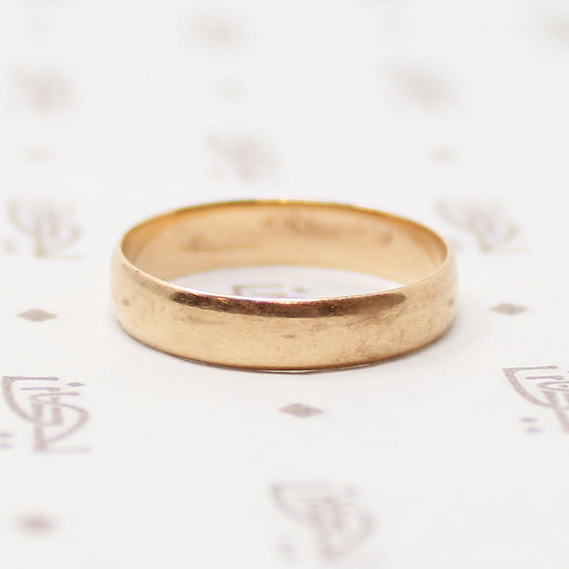 A lovely Edwardian wedding band in mellow, 14k rosy gold. The band is cast with a subtle, shallow half round exterior curve. This sweet ring will look great worn alone or paired with your vintage engagement ring. Circa 1900.