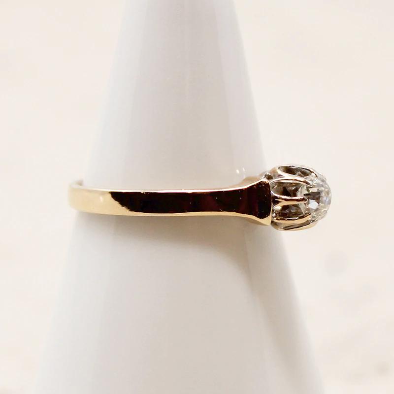 This enchanting Edwardian engagement ring features a wonderful old diamond in a pretty buttercup setting. The 0.25ct diamond solitaire nestles amongst the 18k yellow gold flower petals. The diamond is a sparkly old mine cut, chunky with an open culet and lots of character. Eight delicate prongs secure the stone and display it to maximum advantage. Subtly flared shoulders taper into a narrow band. So pretty, with great antique charm. Circa 1900.