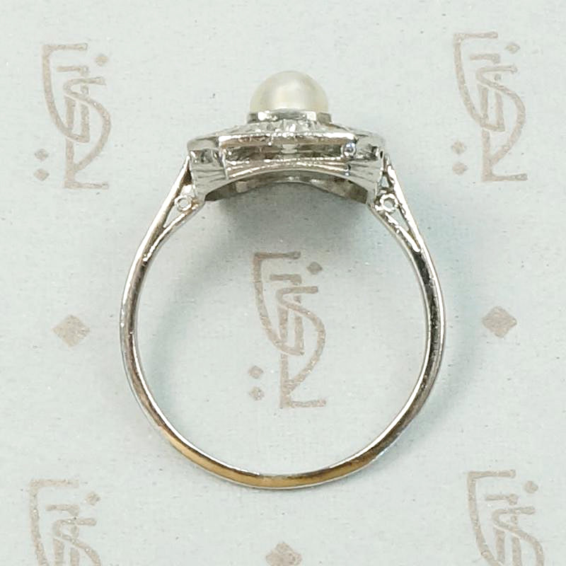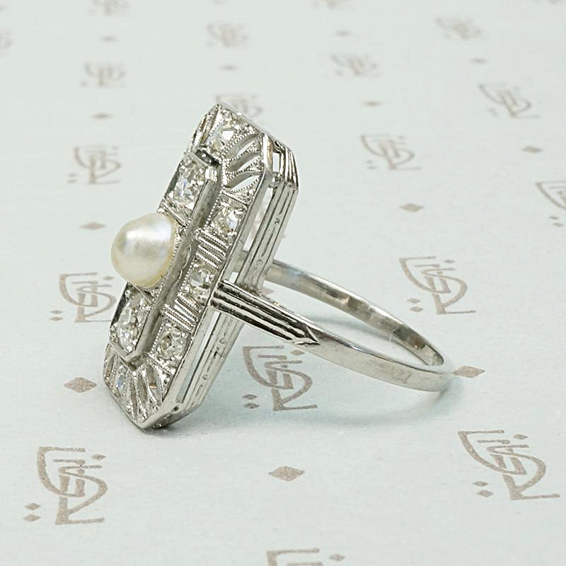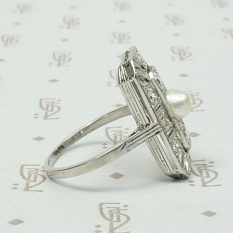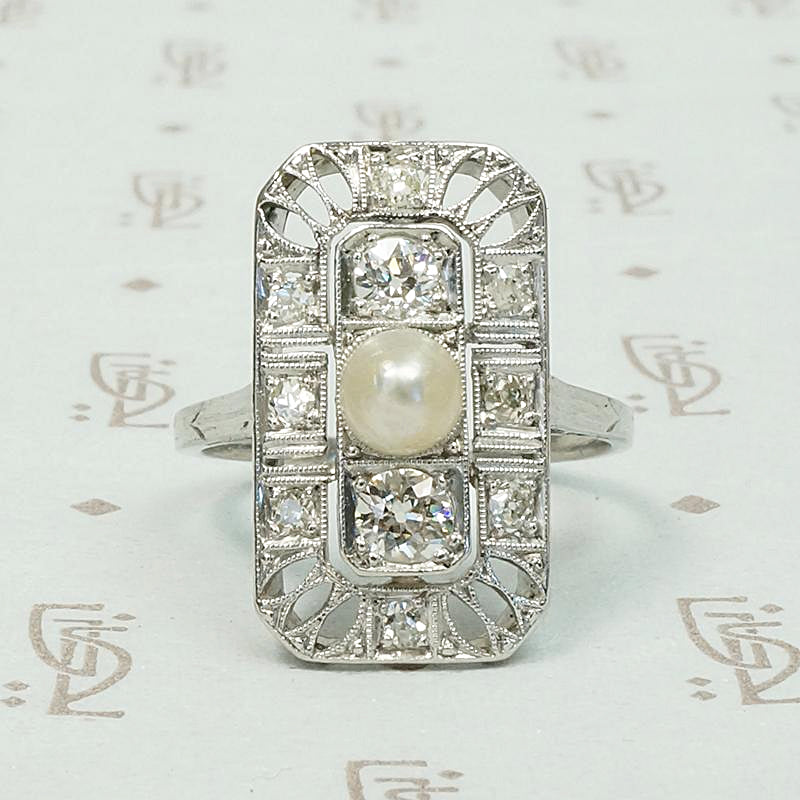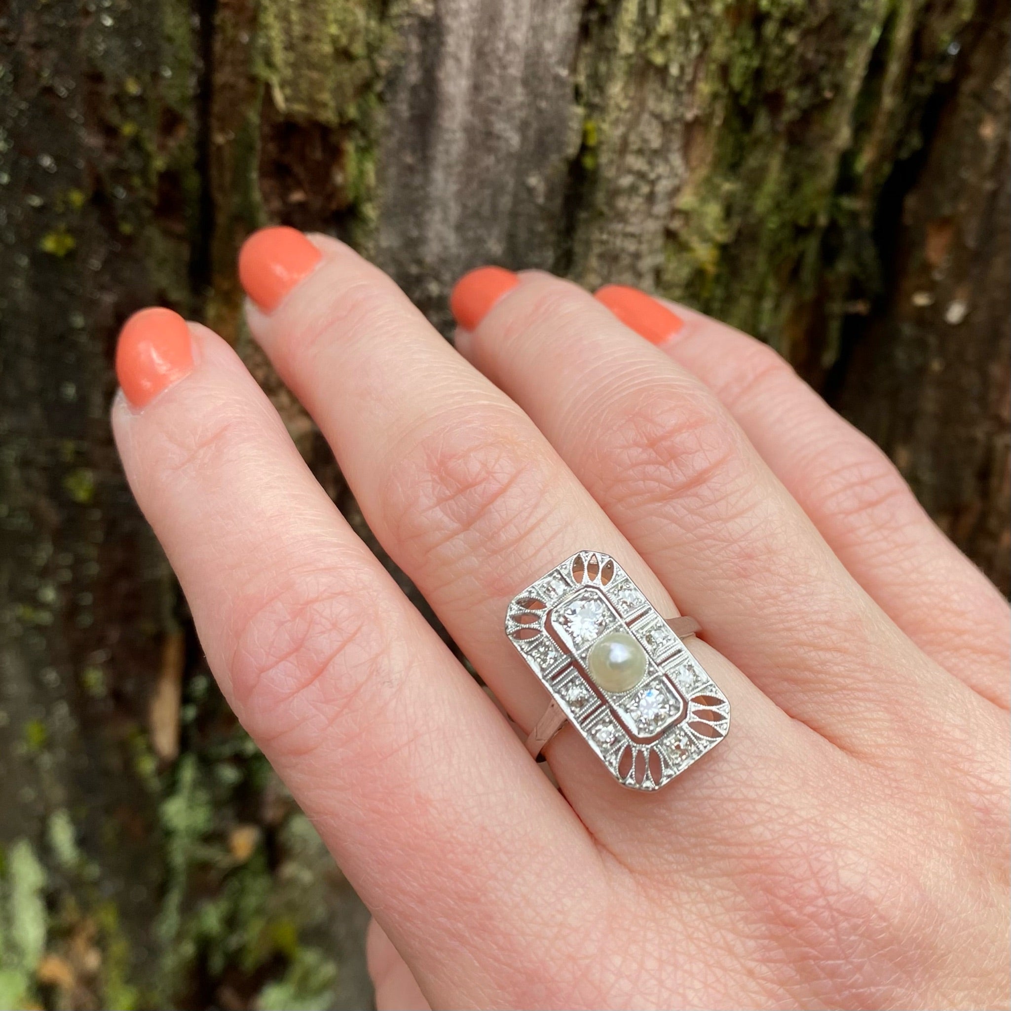 A gorgeous Edwardian panel ring made of lacy platinum studded with diamonds and pearl. A creamy natural pearl is set vertically with two old mine cut diamonds, and the edge of the filigreed panel is set with eight smaller diamonds. The glittering, chunky old mine diamonds have a 0.60tcw. The platinum filigree work is stunning, embellished with fine milgrain and hand engraving. Every detail of this classically Edwardian ring is a dream of romantic architecture. Circa 1900.