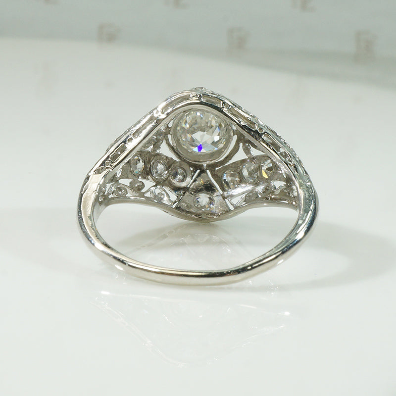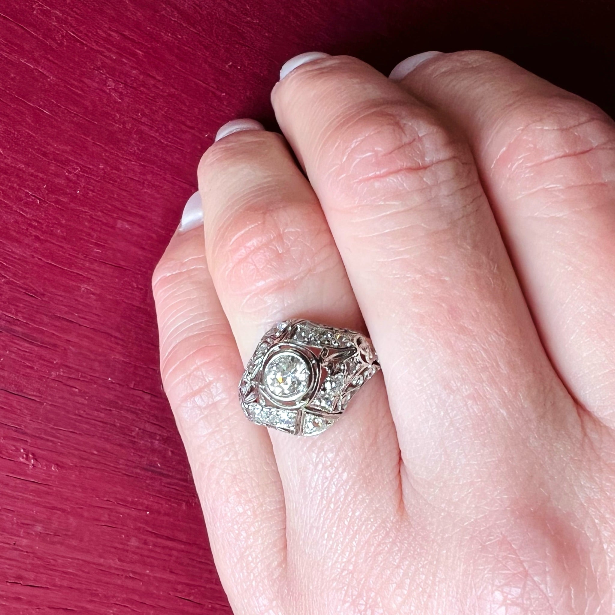 Details.....Currently a size 6.5, one free sizing is included with the purchase. The top of the ring measures 13.3mm by 18.8mm, and the band is 1.8mm wide. The center diamond is a SI/J. In Very Good Vintage Condition. You should always expect some wear on vintage and antique jewels, we consider it part of their charm.