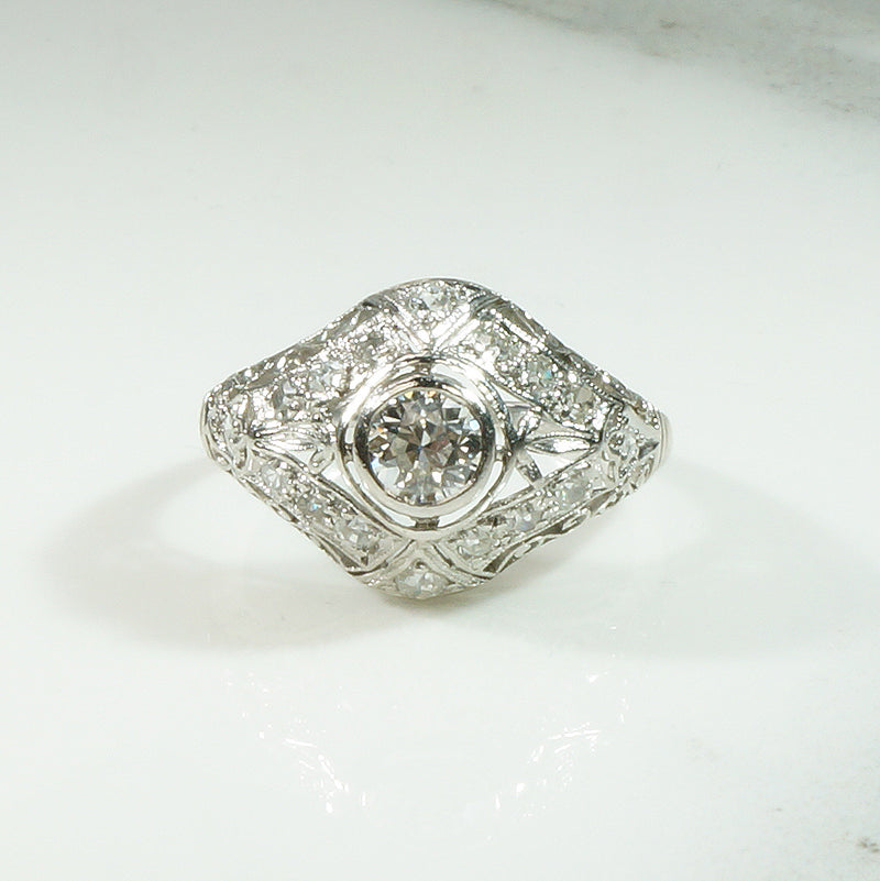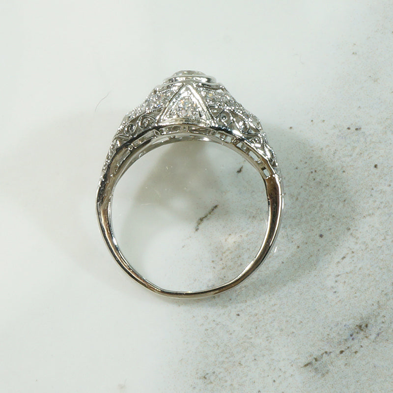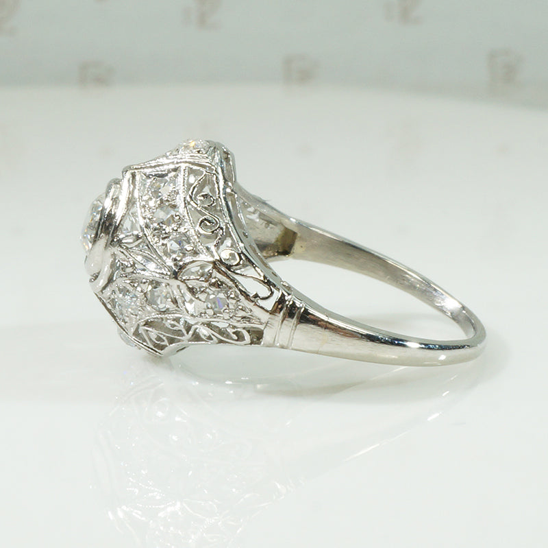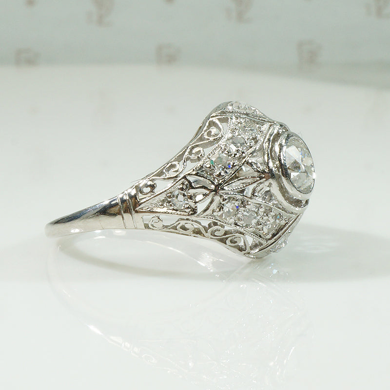 This Pretty Edwardian Bombé ring has a .50ct old European cut diamond bezel set in its center. The platinum dome is covered in beautifully detailed filigree and twinkling old mine and European cut diamonds. This lovely Edwardian beauty would make a gorgeous and unique engagement ring. Platinum, Circa 1910.