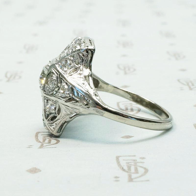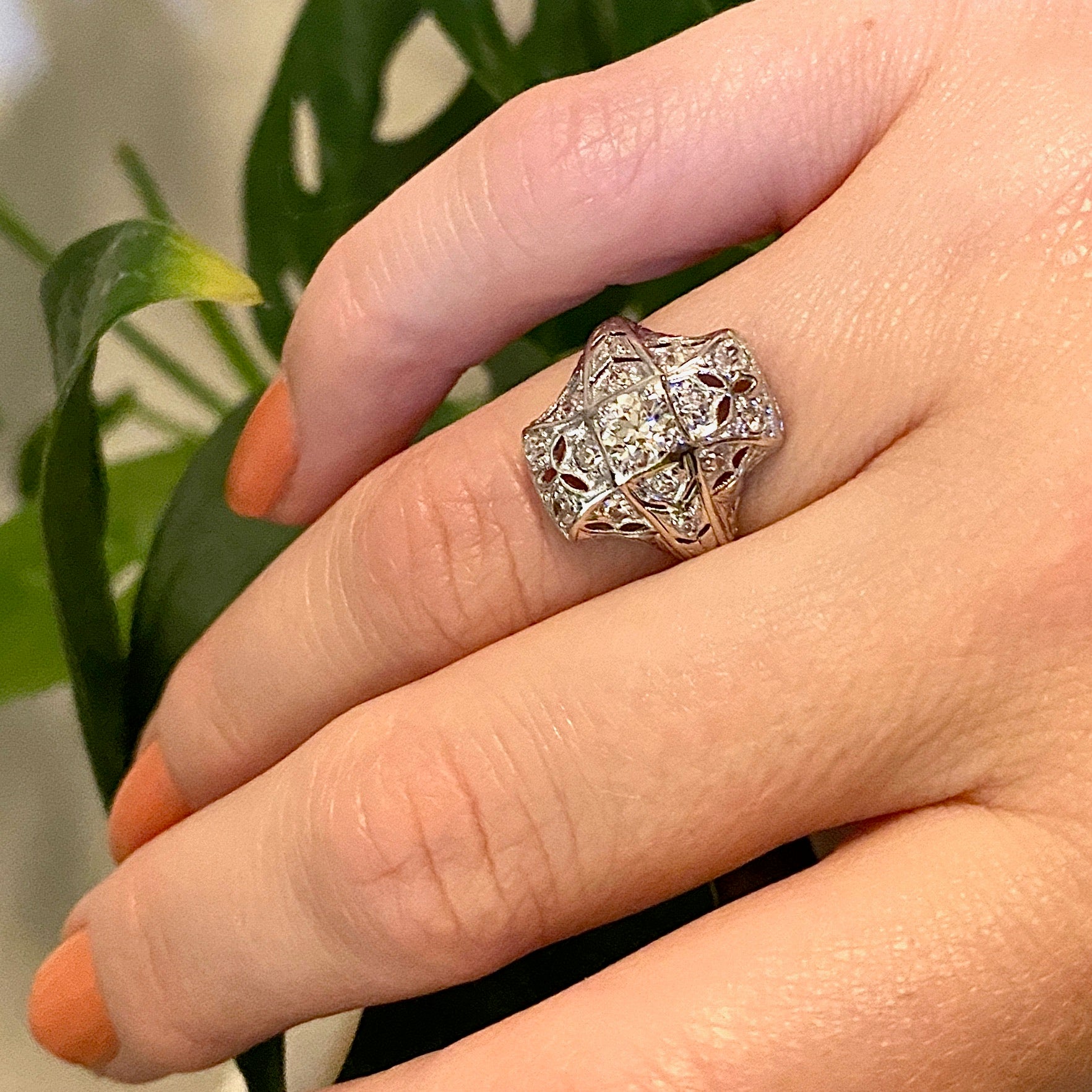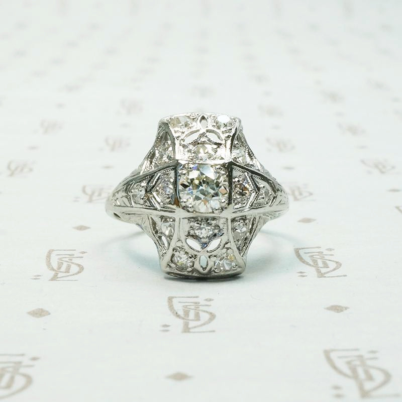 This pretty Edwardian ring is rich with the romantic details we love from the era. Fourteen old cut diamonds surround a 0.40ct old european cut diamond, all set in a rectangular dome. The ring has a 0.65 total carat weight. The platinum top has beautiful metal work, mill grain, filigree and trefoil-shaped openwork, over a 14k white gold band. Circa 1910.