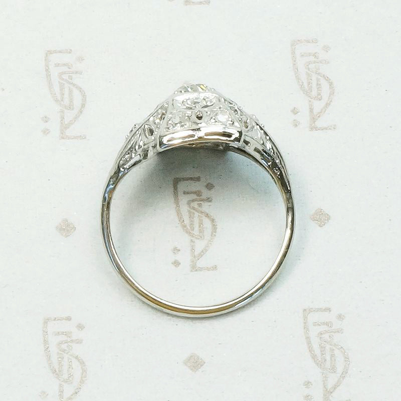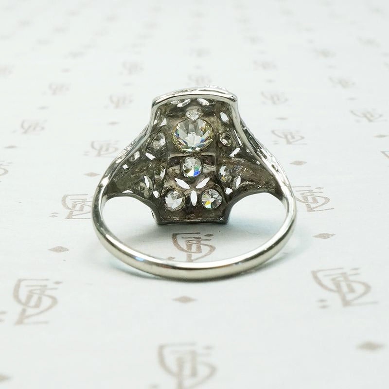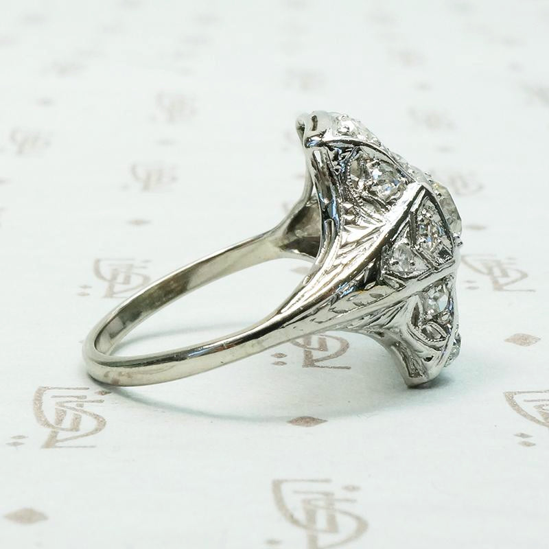Details.....Currently a size 6. The ring may be sized up or down two sizes free of charge. Please contact us if you need this ring sized more than two sizes, it may be possible and will have a small fee. The ring measures 16.2mm by 15.8mm at the diamond set top and the band is 1.6mm wide. In Very Good Vintage Condition. You should always expect some wear on vintage and antique jewels, we consider it part of the charm.