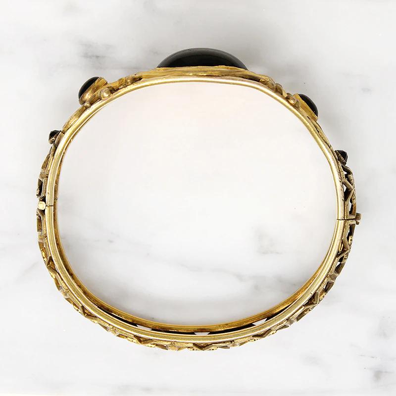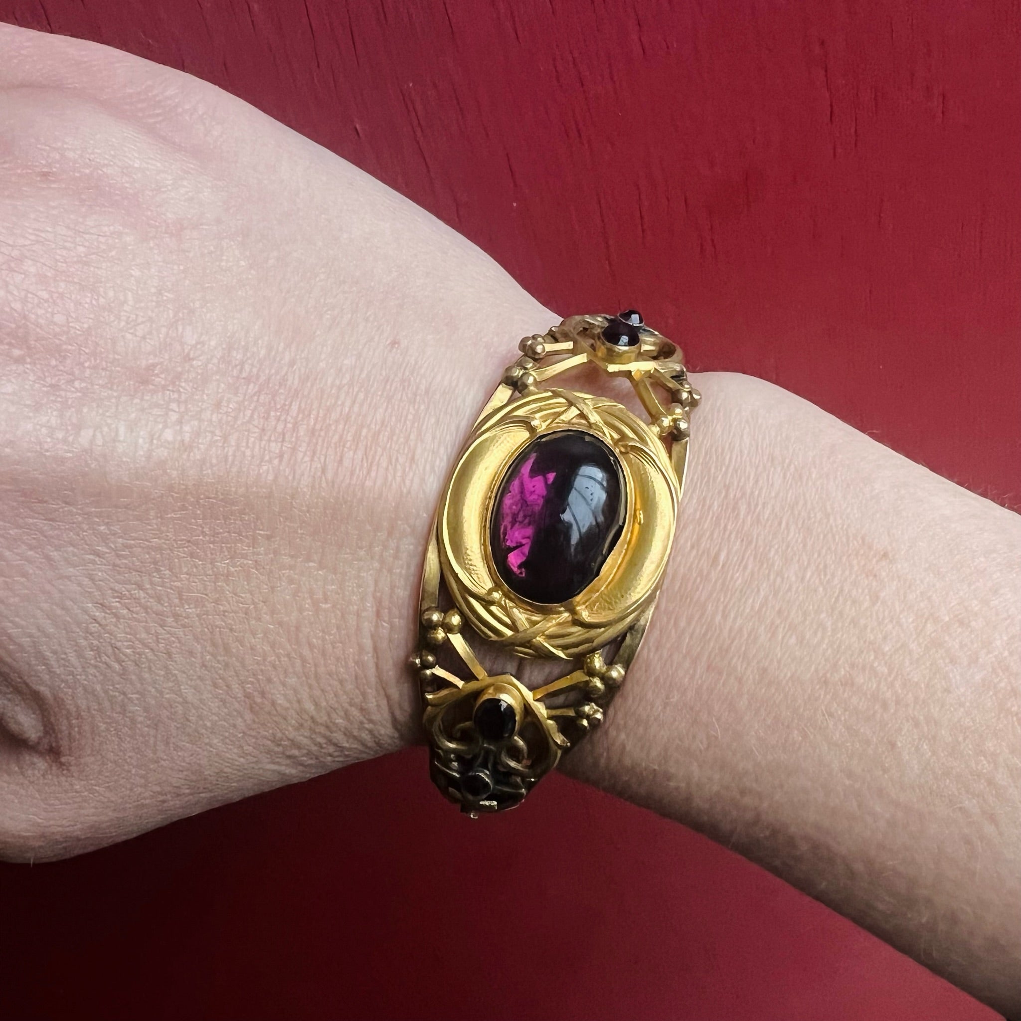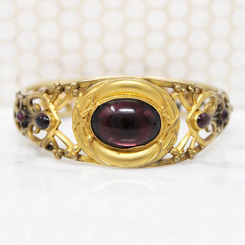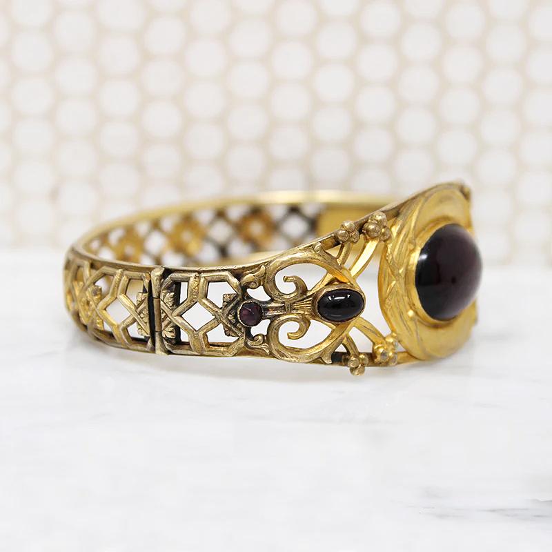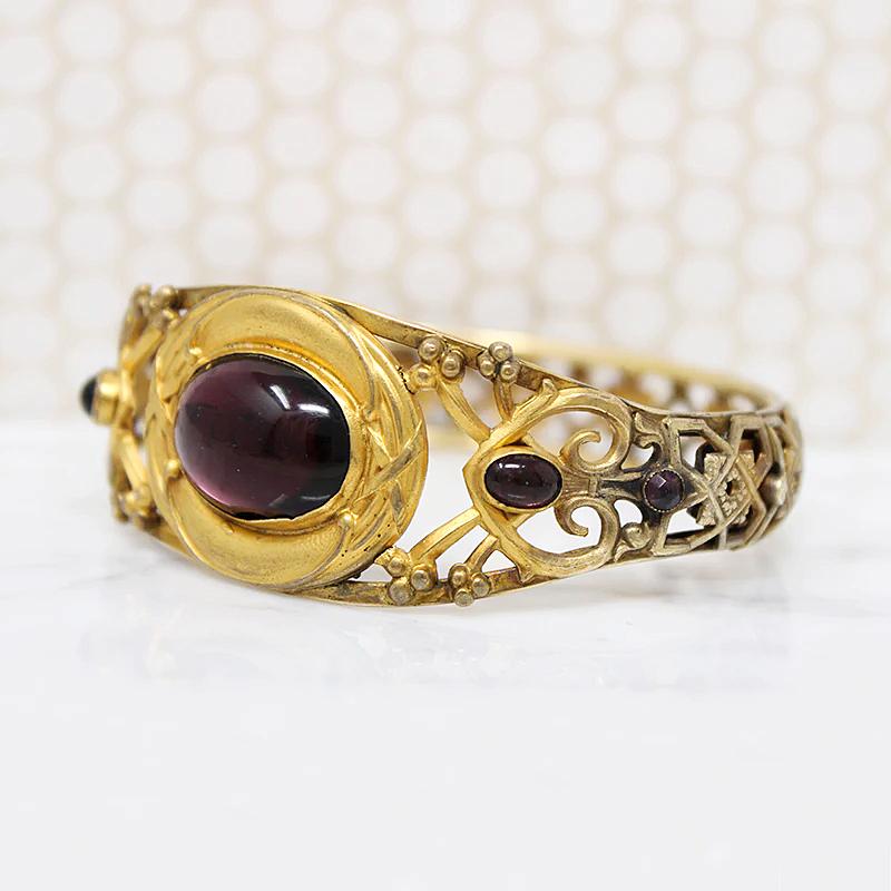 An elaborate Edwardian bangle bracelet with an openwork design and rich purple glass gems. Glossy gold filled metal is pieced with a lattice-like pattern. Art Nouveau engraving frames cabochons of amethyst-colored glass. The bangle is a hinged oval; the clasp and hinge are both in good working order. Affordable antique glamour. Circa 1900.