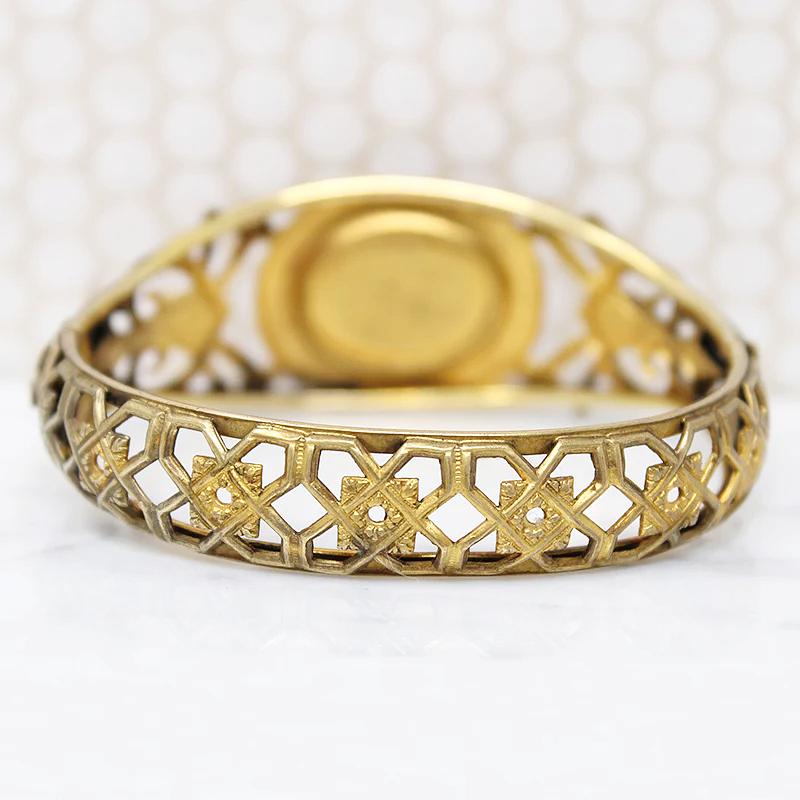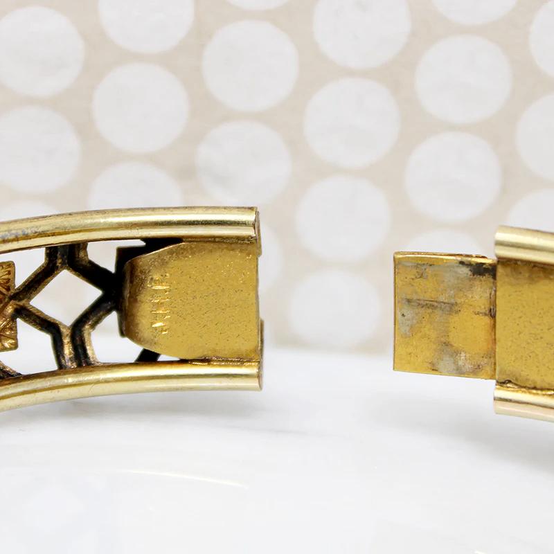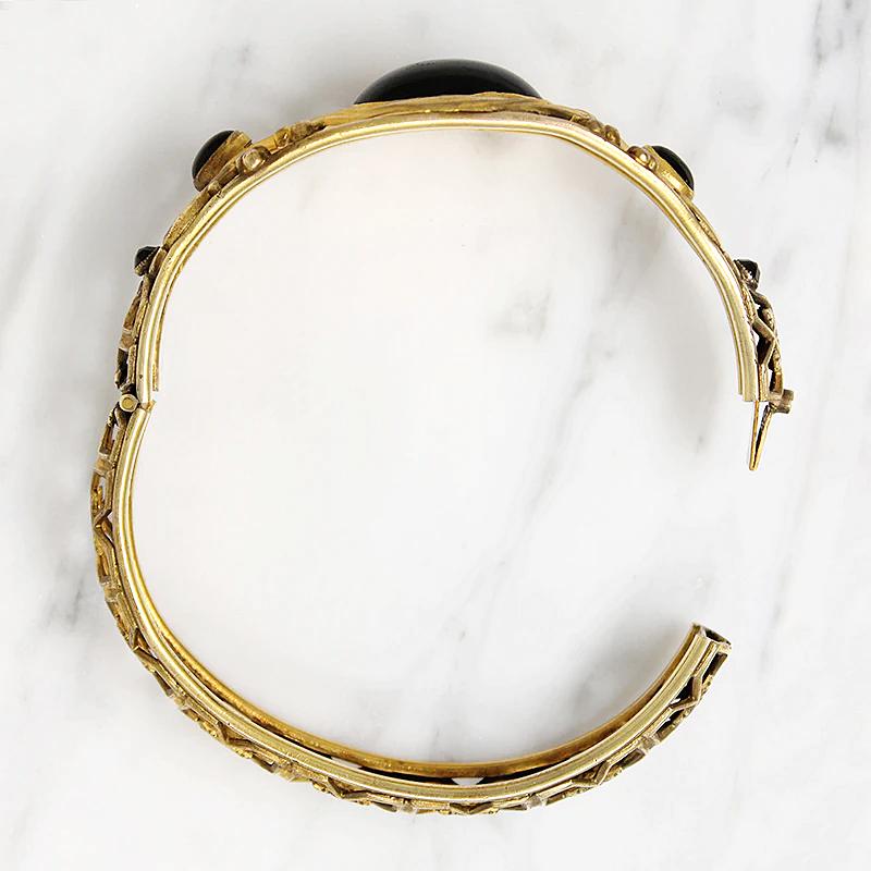 Details.....The bracelet is 1.04" wide at the front and tapers to 0.52" in the back. The exterior measures 2.72" by 2.58", and the interior measures 2.43" by 2.18". In Good Antique Condition, with a chip in the center glass cabochon. You should always expect some wear on vintage and antique jewels; we consider it part of the charm.