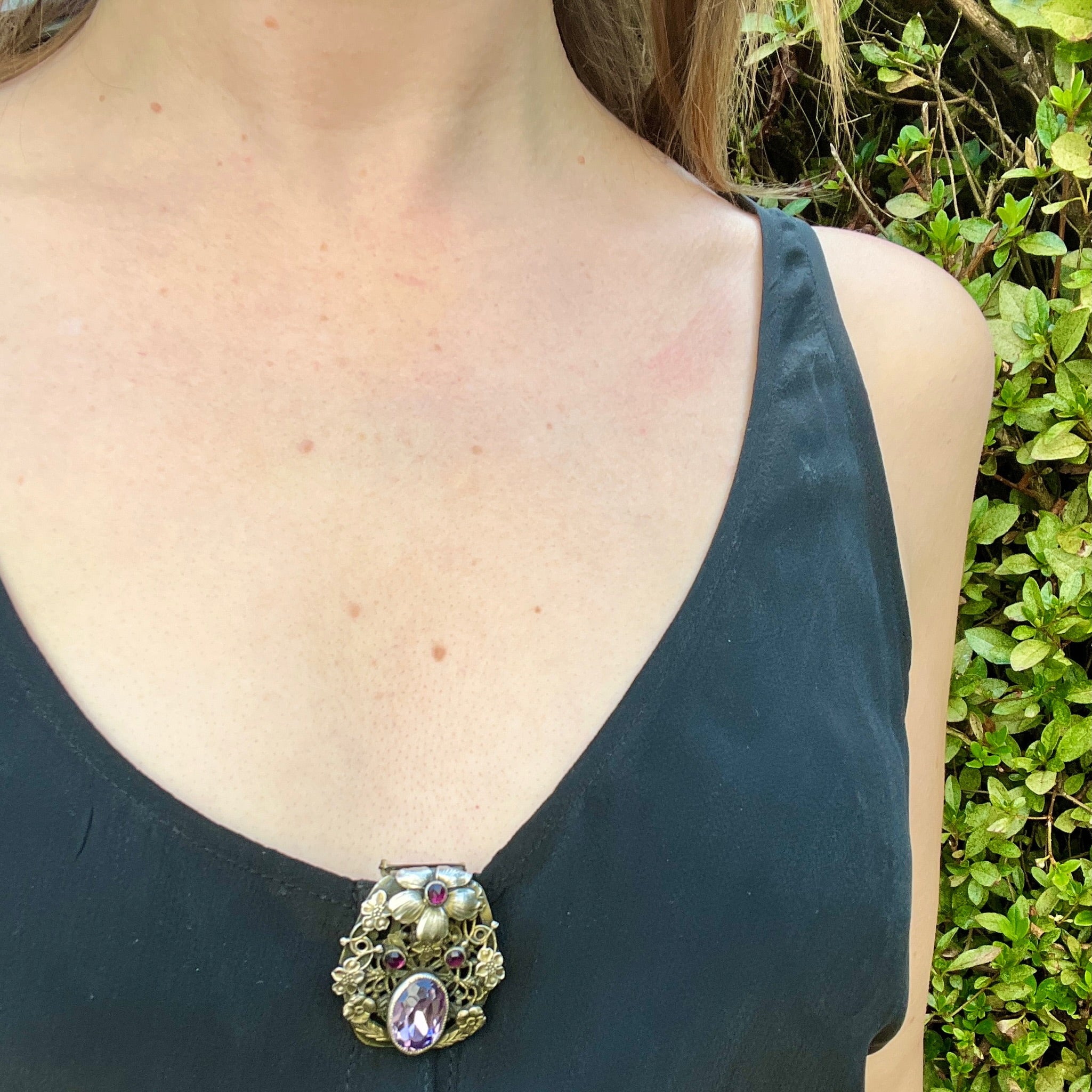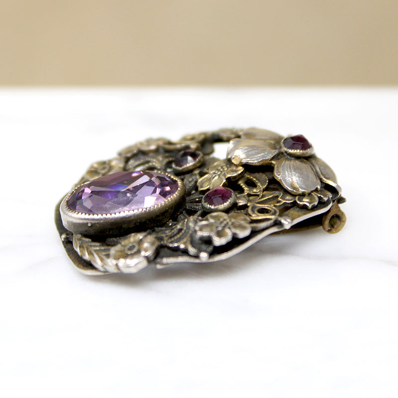 Elaborate brass violets and faceted glass gems in shades of purple and lavender adorn this Edwardian dress clip. Applied flowers and filigree are layered over the hinged clip. A faceted oval glass gem sits in a sawtooth bezel, and small purple stones accent the metalwork. Thoughtful sculpting and engraving give the sweet violets a very naturalistic appearance. Wear this versatile clip on your scarf, lapel, belt, etc., to add a pop of color and romance. Circa 1915.