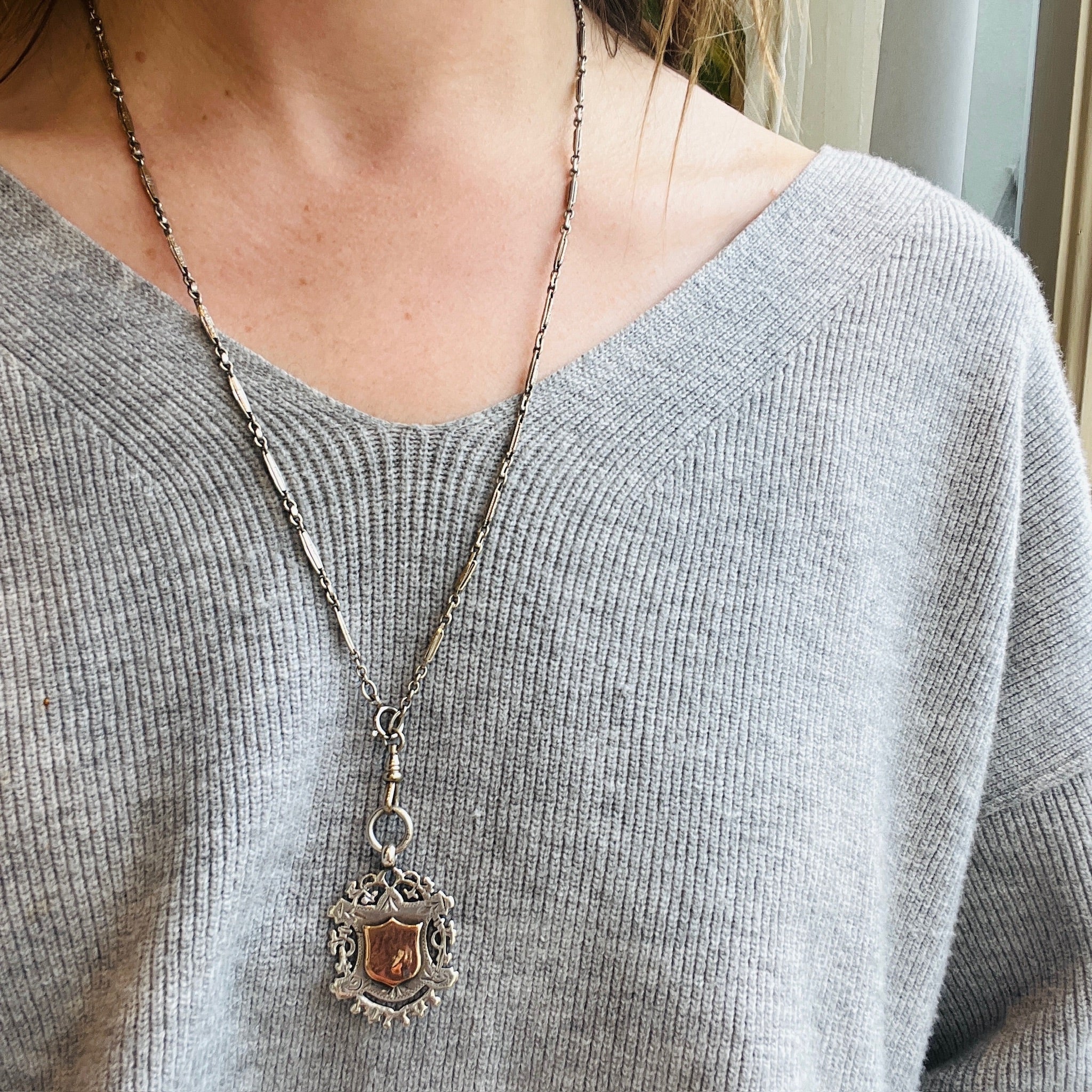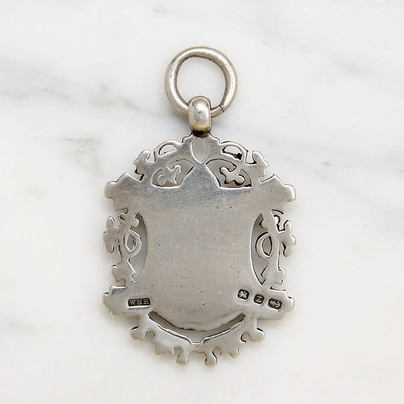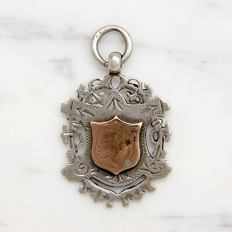 An elaborate late Victorian medal fob made in Birmingham, England. The openwork sterling silver medal is wedding cake-ornate with curling leaves, flourishes, and engraving. A rosy gold shield is applied to the front of the fob. The medal's back bears no personal inscriptions; it's ready to be engraved with anything you like. This fob will look a treat worn on one of our Ancient Influences married chains.