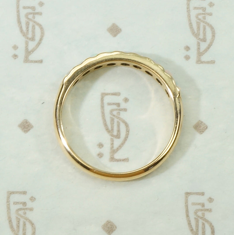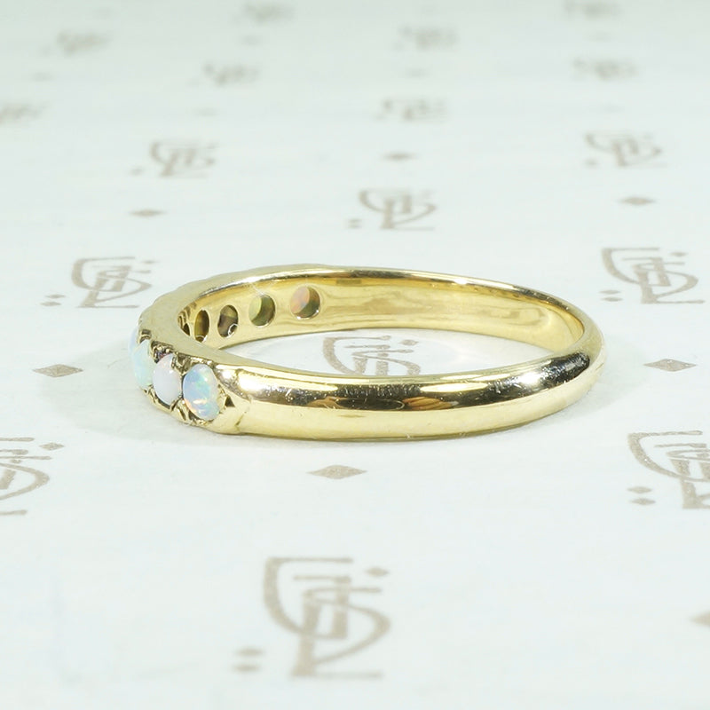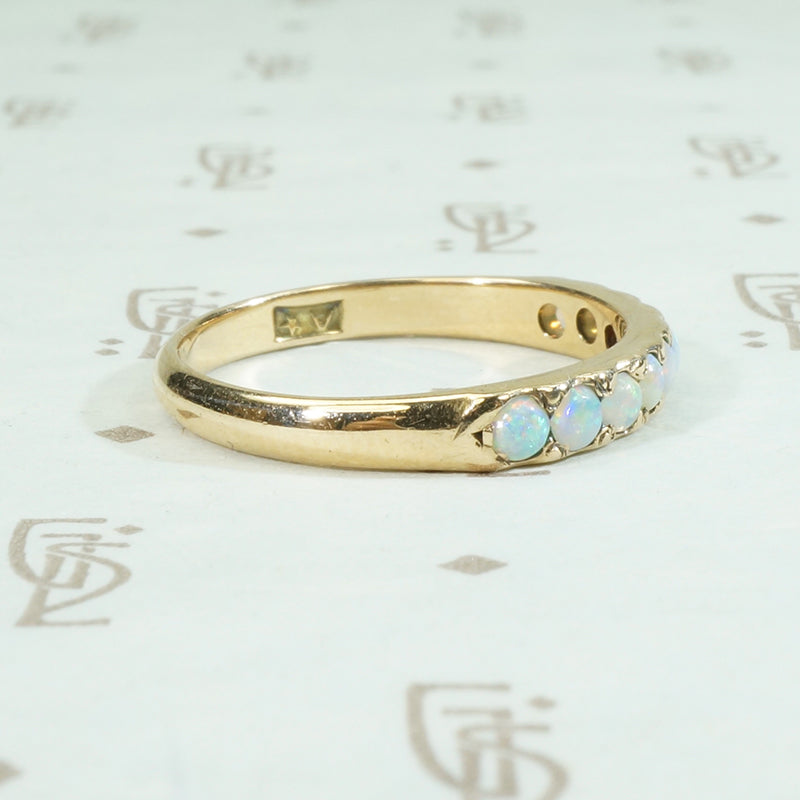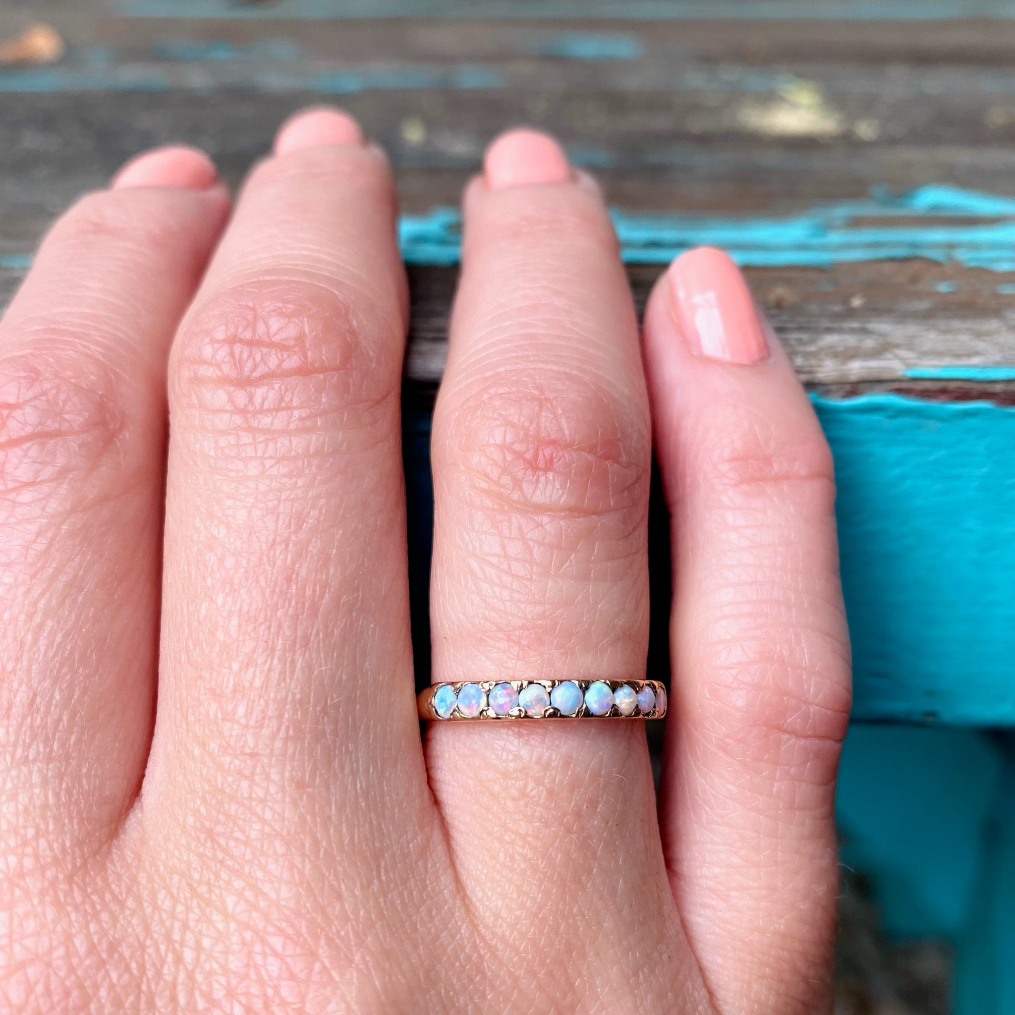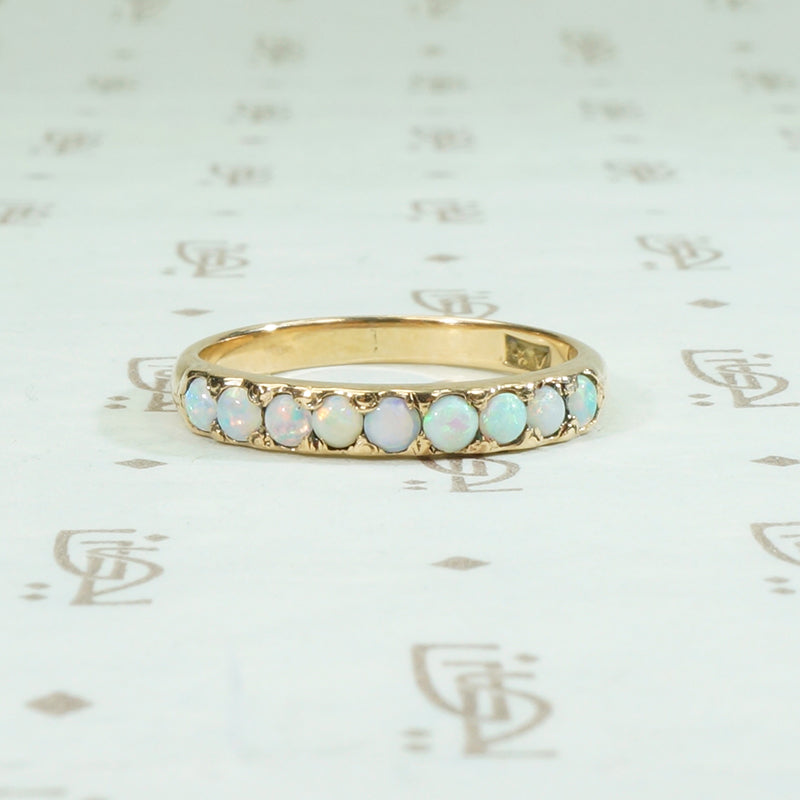 This Edwardian opal band is so elegantly simple, perfect for showcasing the natural beauty of the iridescent gems. Nine fiery round opals are set into a 10k yellow gold ring. A shapely half round band tapers gently into the shank. It's really just perfect. The interior of the band is stamped with an "A" and a five pointed star, the maker's mark for Allsop Brothers. Circa 1900.