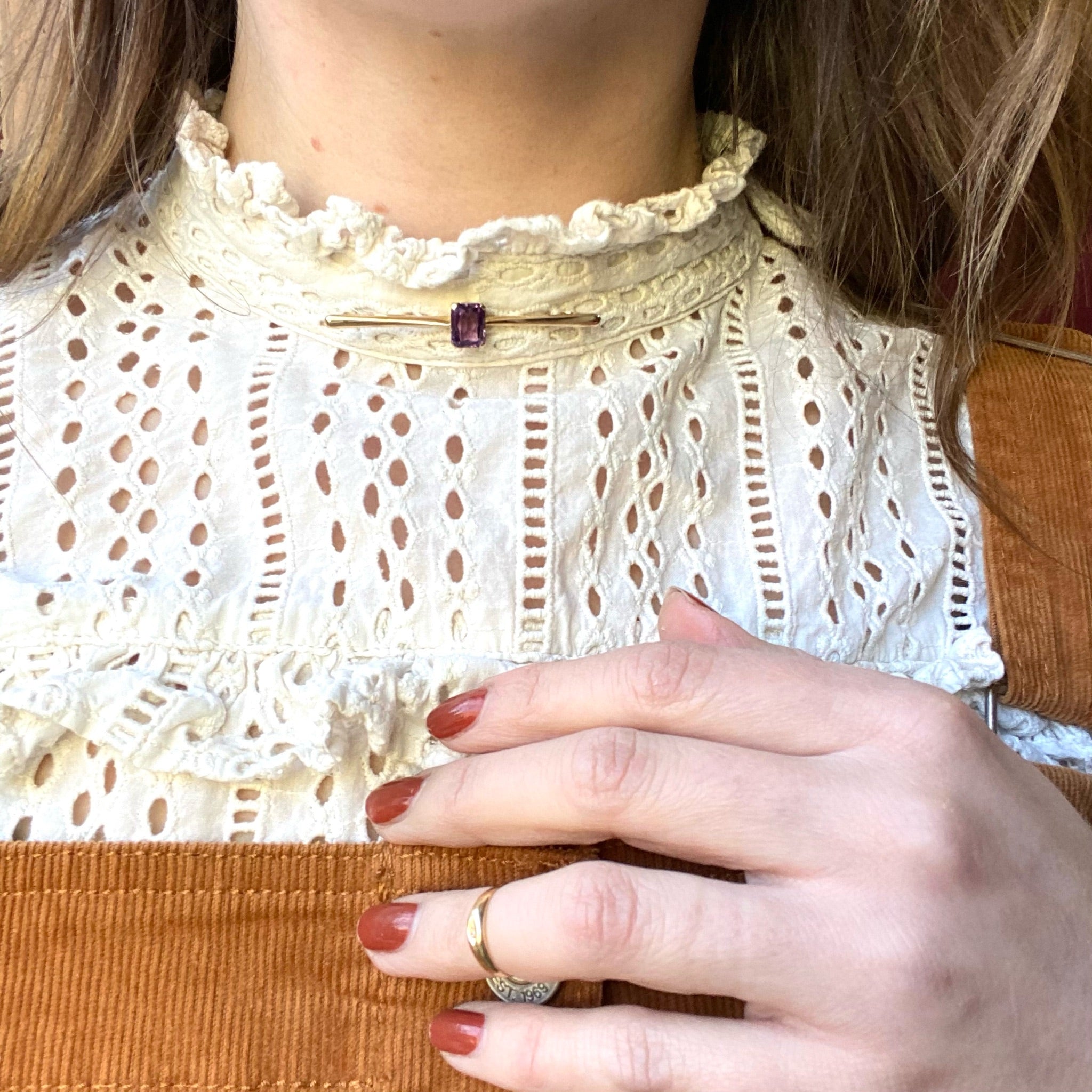 This elegant English bar pin is a timeless beauty. A 2 carat emerald cut amethyst is set at the center of a tapered bar of glossy 9ct gold. The band has English hallmarks for Birmingham. Circa 1960.