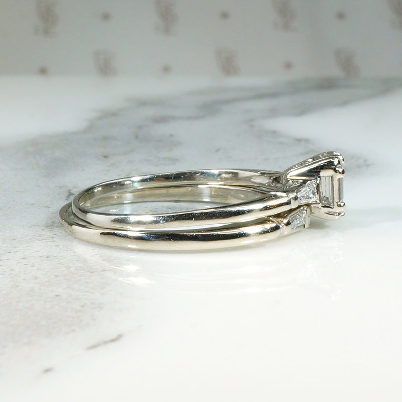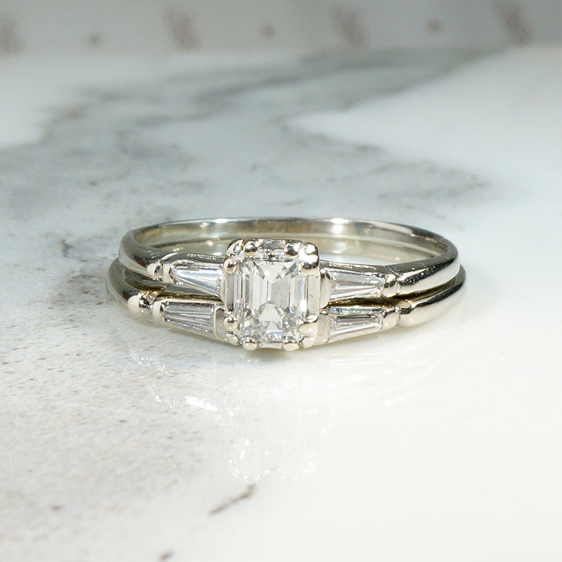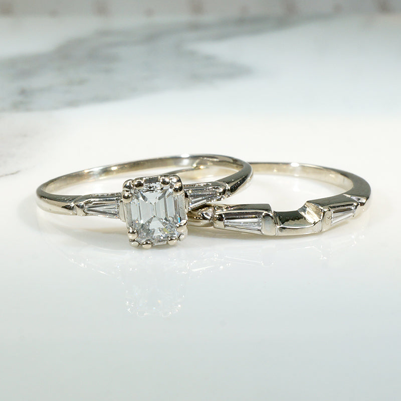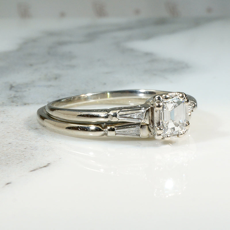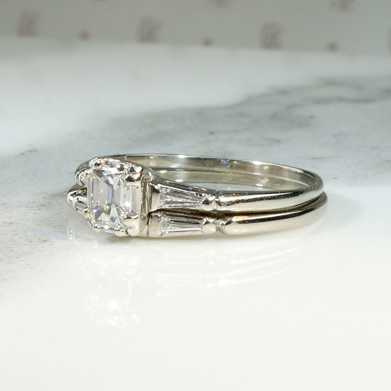 A gorgeous step-cut diamond stars in this timeless 1950s wedding set. The bright 0.45ct emerald step-cut diamond has an SI clarity and H-I color. This stone is displayed in a clean-lined 14k white gold setting, set between a pair of tapered baguette diamonds. The matching band was made especially to fit the engagement ring, with a little notch for the diamond to slide into between two more baguettes. This elegant design is a Mid-Century classic, it transcends trends so you can enjoy it forever. Circa 1950.