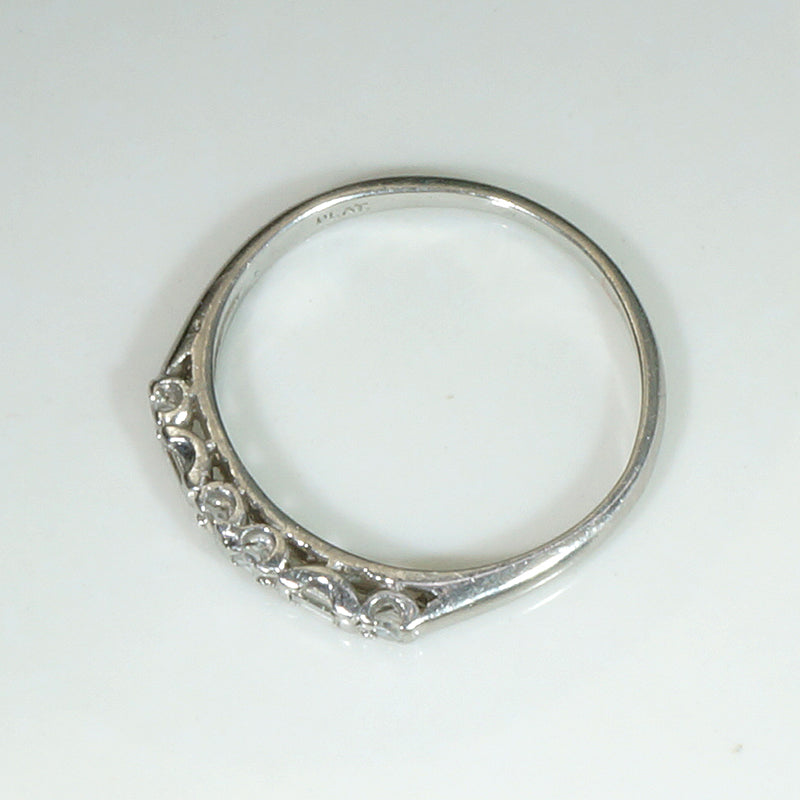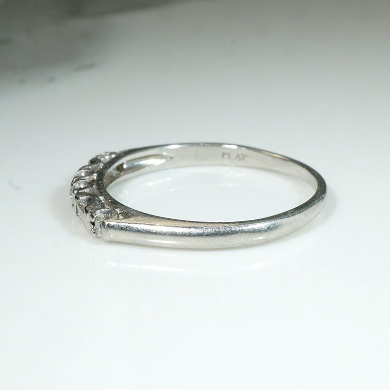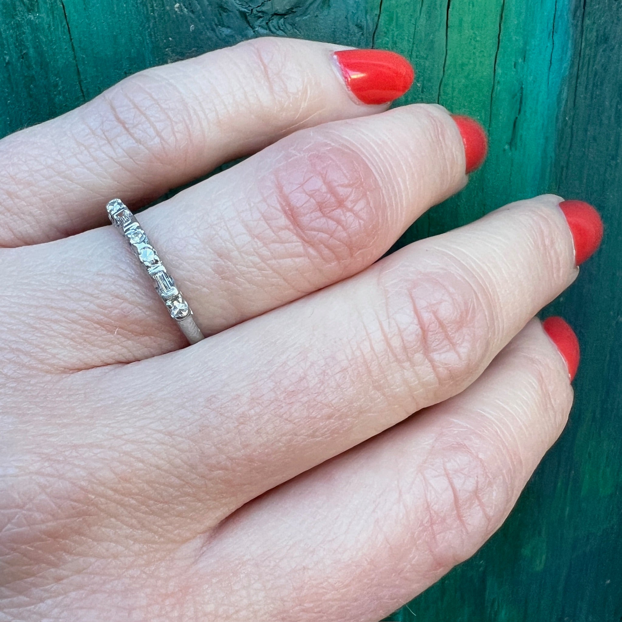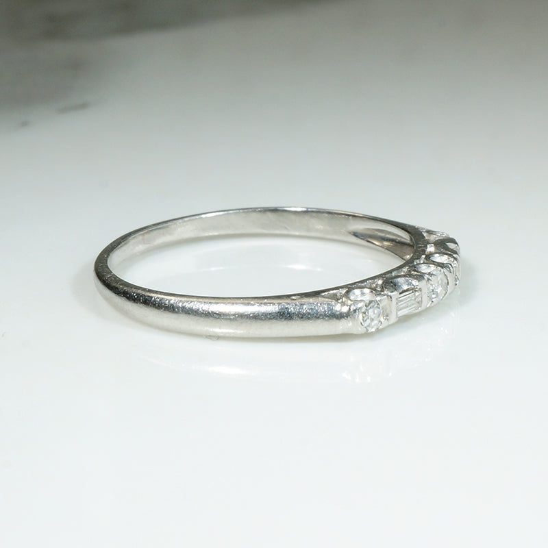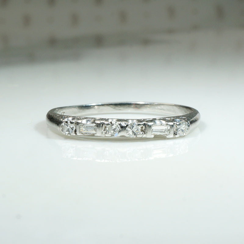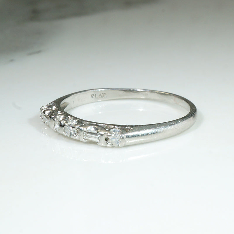 An elevated vintage wedding band with round and baguette diamonds curved over the top of the platinum ring. Two bright round diamonds are center set, flanked by two bar-set baguettes. A round diamond sparkles at each end. The piece finishes with a slender half-round band. This refined ring is both elegant and versatile. It's always exciting to find a vintage wedding band that pairs baguettes and rounds. Circa 1940.