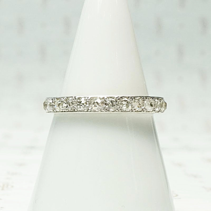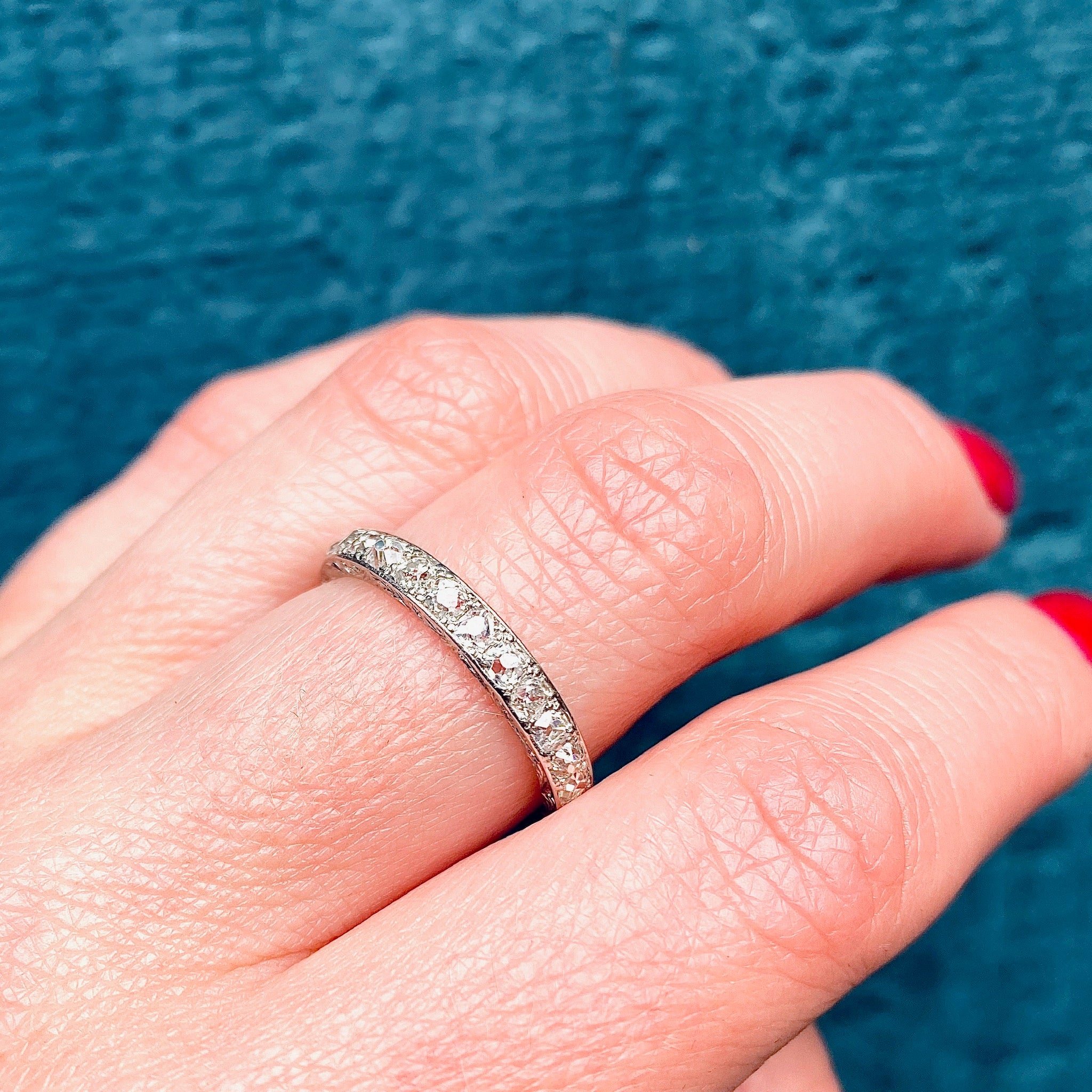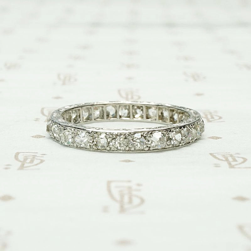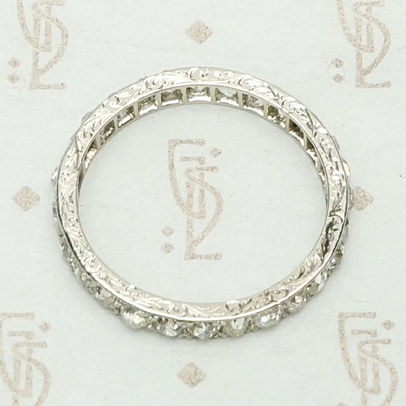 This is one of the loveliest eternity bands we have ever laid eyes upon. Twenty seven fat, sparkling old mine cut diamonds with a total weight of 1.75cts encircle this band. These delicious diamonds are set in exquisitely engraved platinum. The engraving is exquisite. Crisp feathery fronds gird the edges. A classic. Wear on its own, in a stack or pair it with your vintage engagement ring. This style of band is especially effective in a stack because the width is regular all of the way around. Circa 1920.