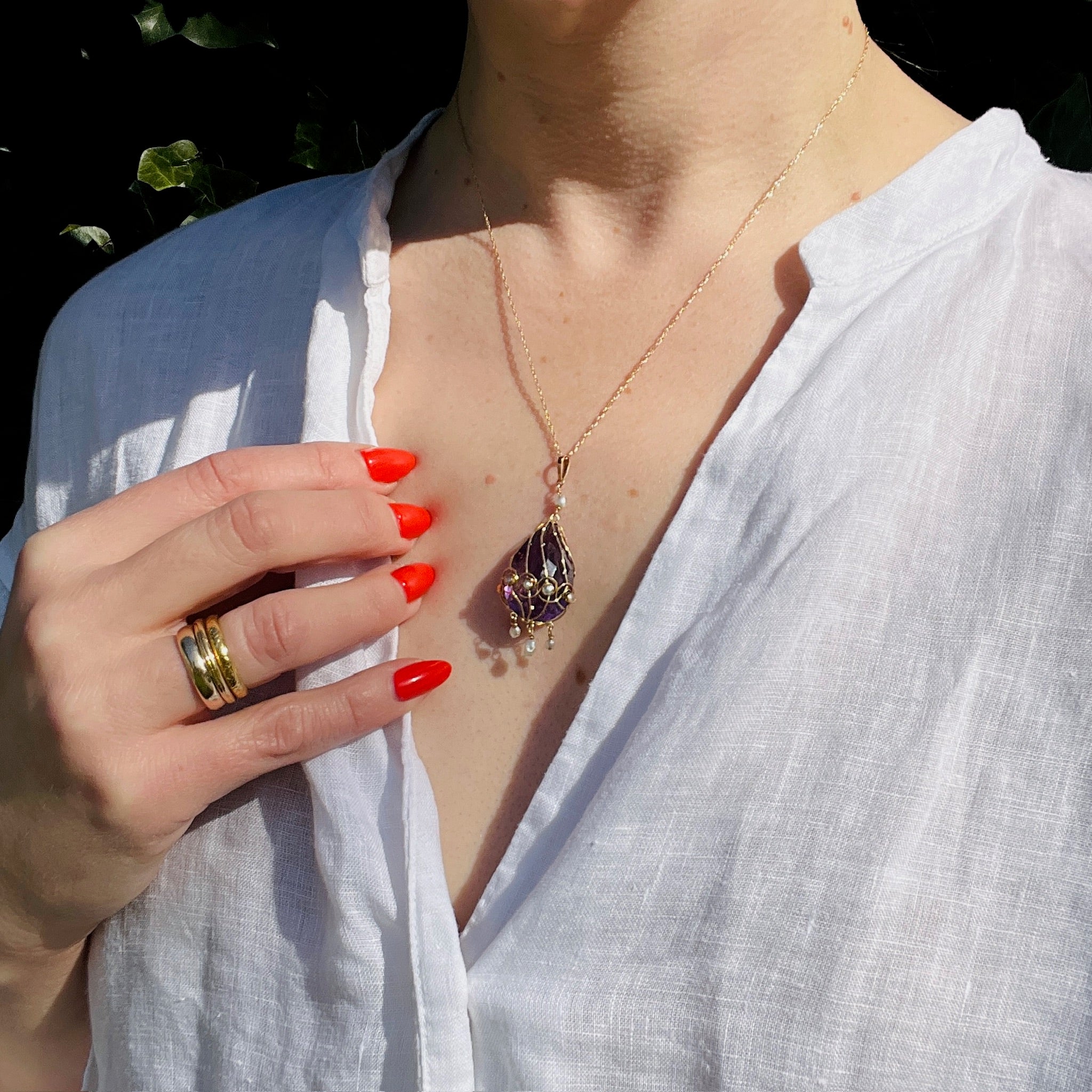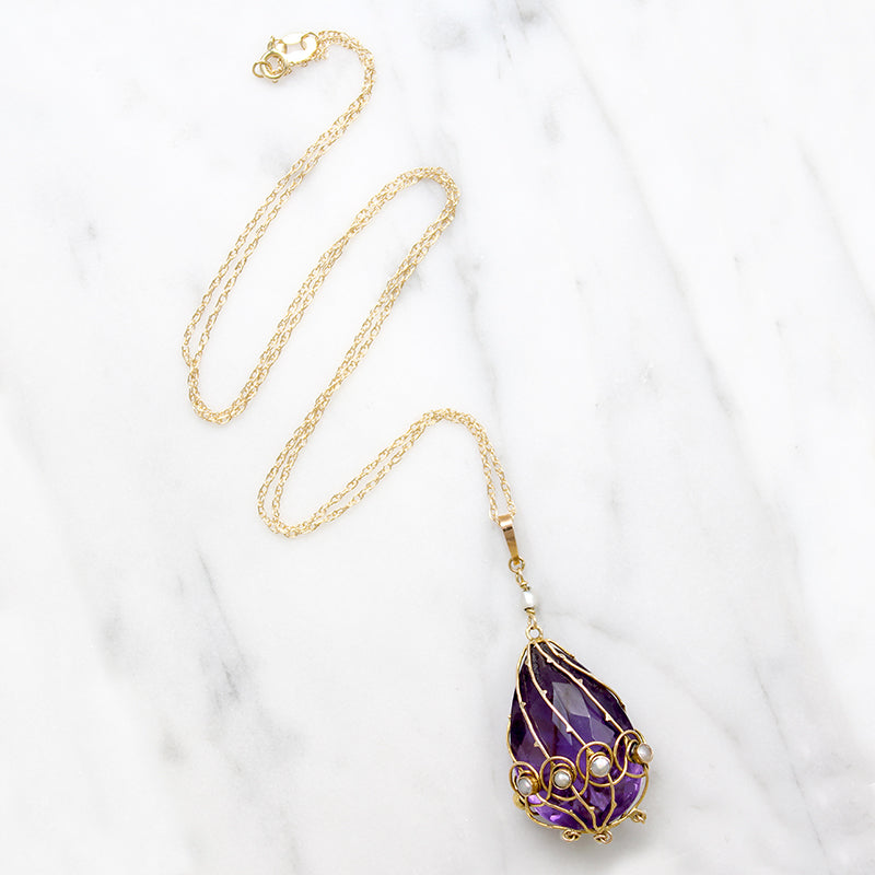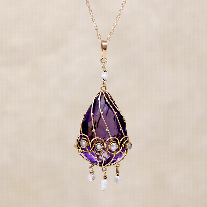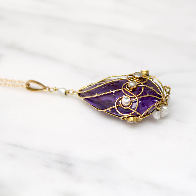 Wondering what to wear on your upcoming visit to Rivendale? Worry no more; this Art Nouveau amethyst and pearl pendant is sure to catch Elrond's exacting eye. A generous faceted amethyst drop is wrapped in a cage of curling gold wire. Glossy white pearls gird the gemstone, bezel set within swirls of 14k gold wire. A delicate fringe of small river pearls dangles from the bottom of the jewel. A gold-wrapped pearl links the amethyst to its bale. This enchanting pendant hangs on a modern 14k gold rope chain. Circa 1900.