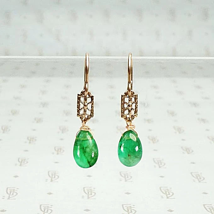The perfect shade of green. These emerald earrings are like sunshine in a lush garden. The emerald drops are suspended from tiny recycled 14k rose gold filigree panels. The ear wires are 14k white gold lever backs for extra security. This unique pair of earrings was hand crafted exclusively for GSL by brunet.