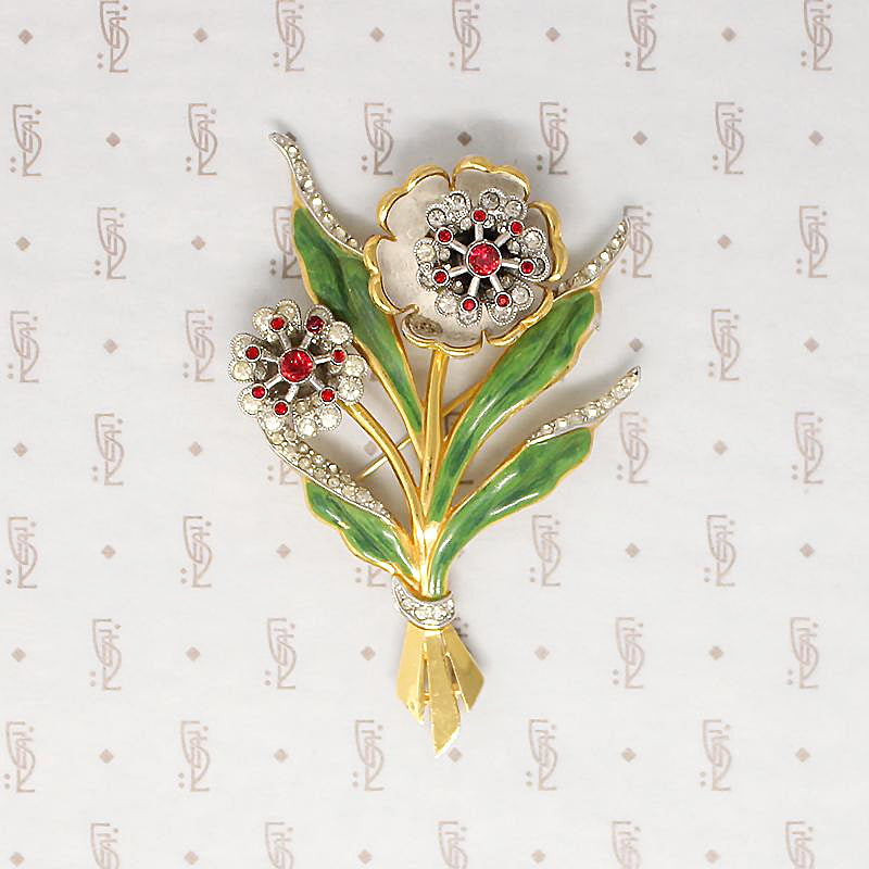 A spray of bright, whimsical flowers grace this en tremblant brooch. The generously sized gold tone pin is cold enameled in green and white and set with vivid red and sparkling white rhinestones. The flower's centers are attached to small springs that make the blossoms tremble and sparkle when you move. So charming and unusual. Circa 1940.
