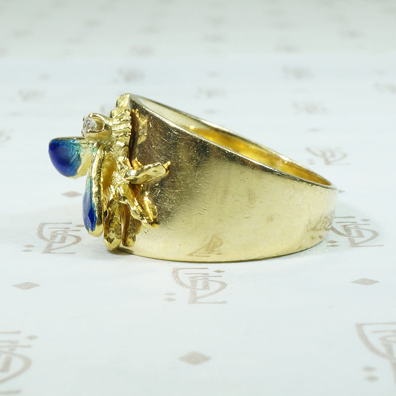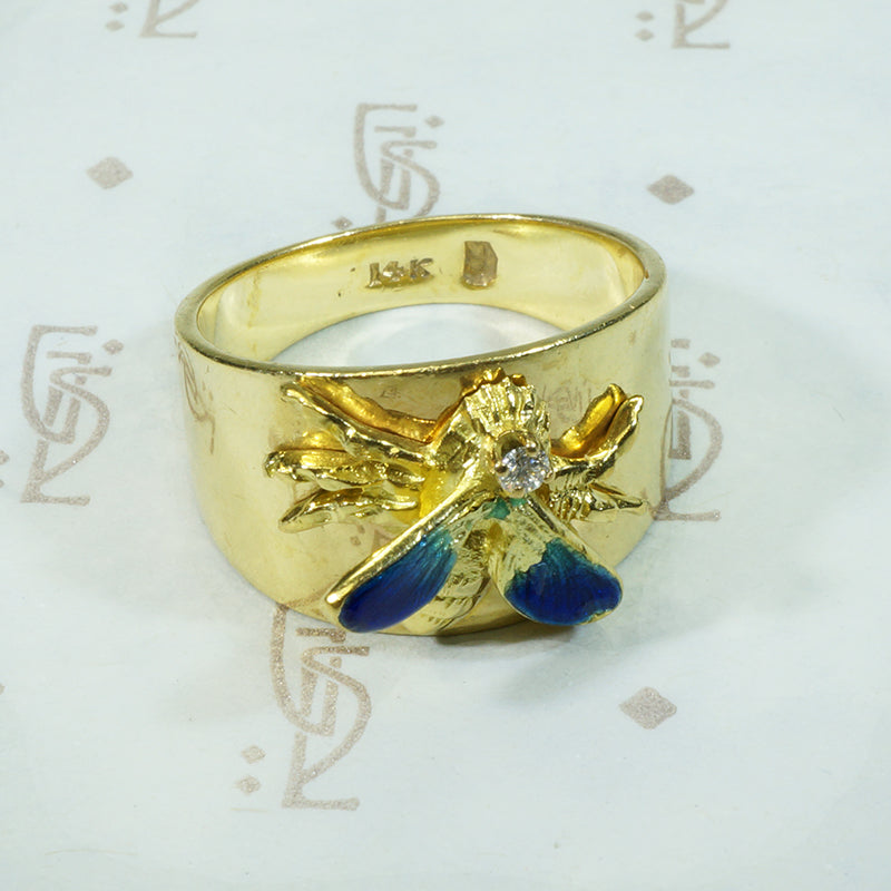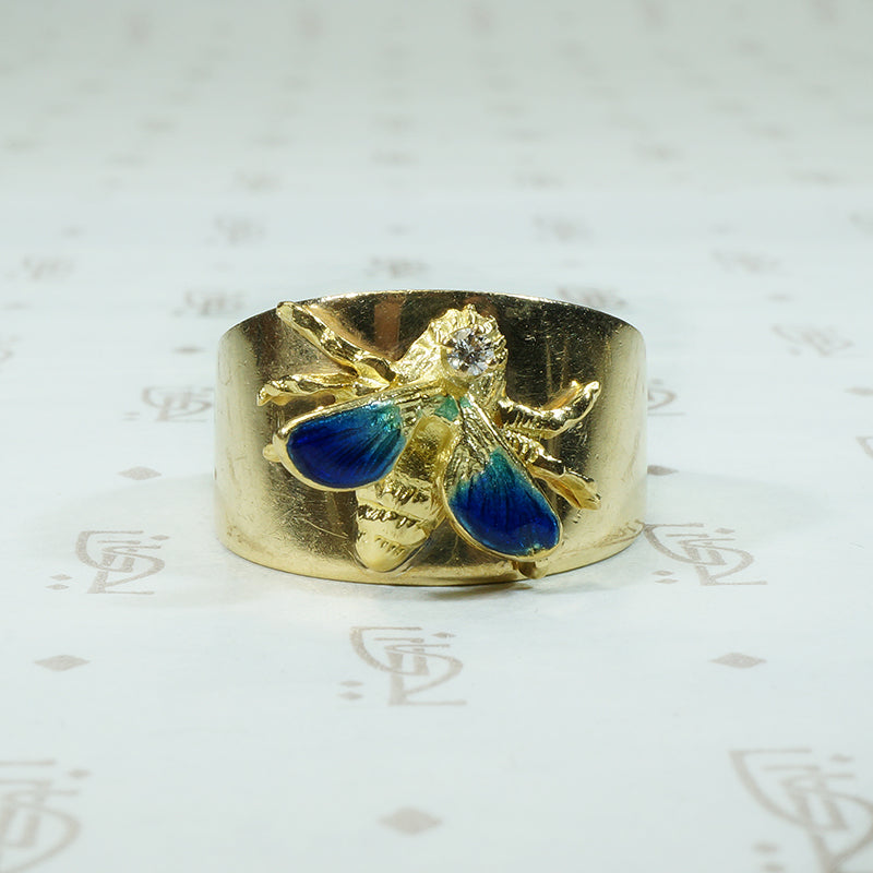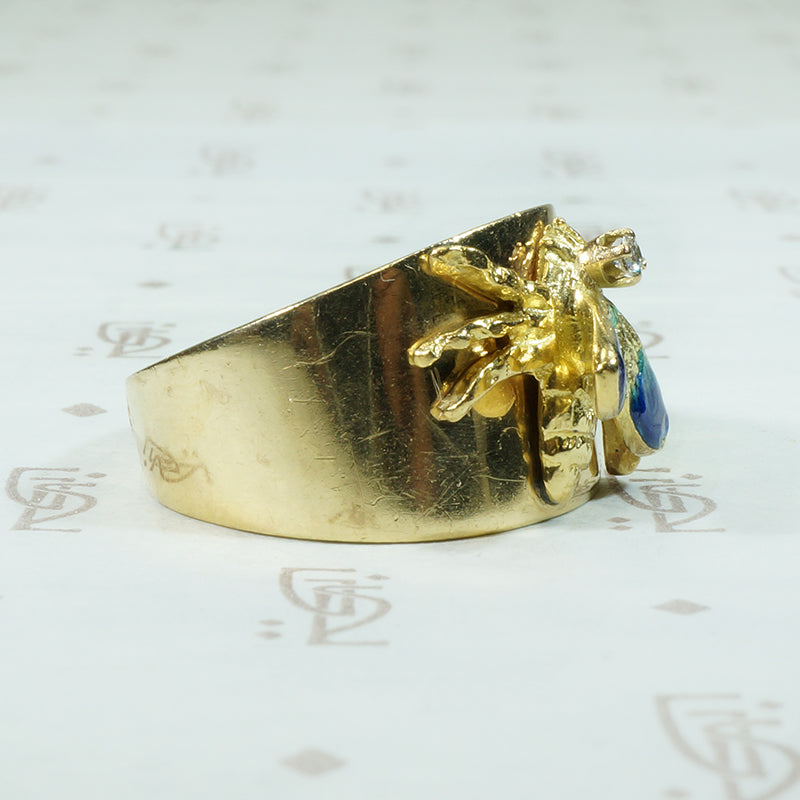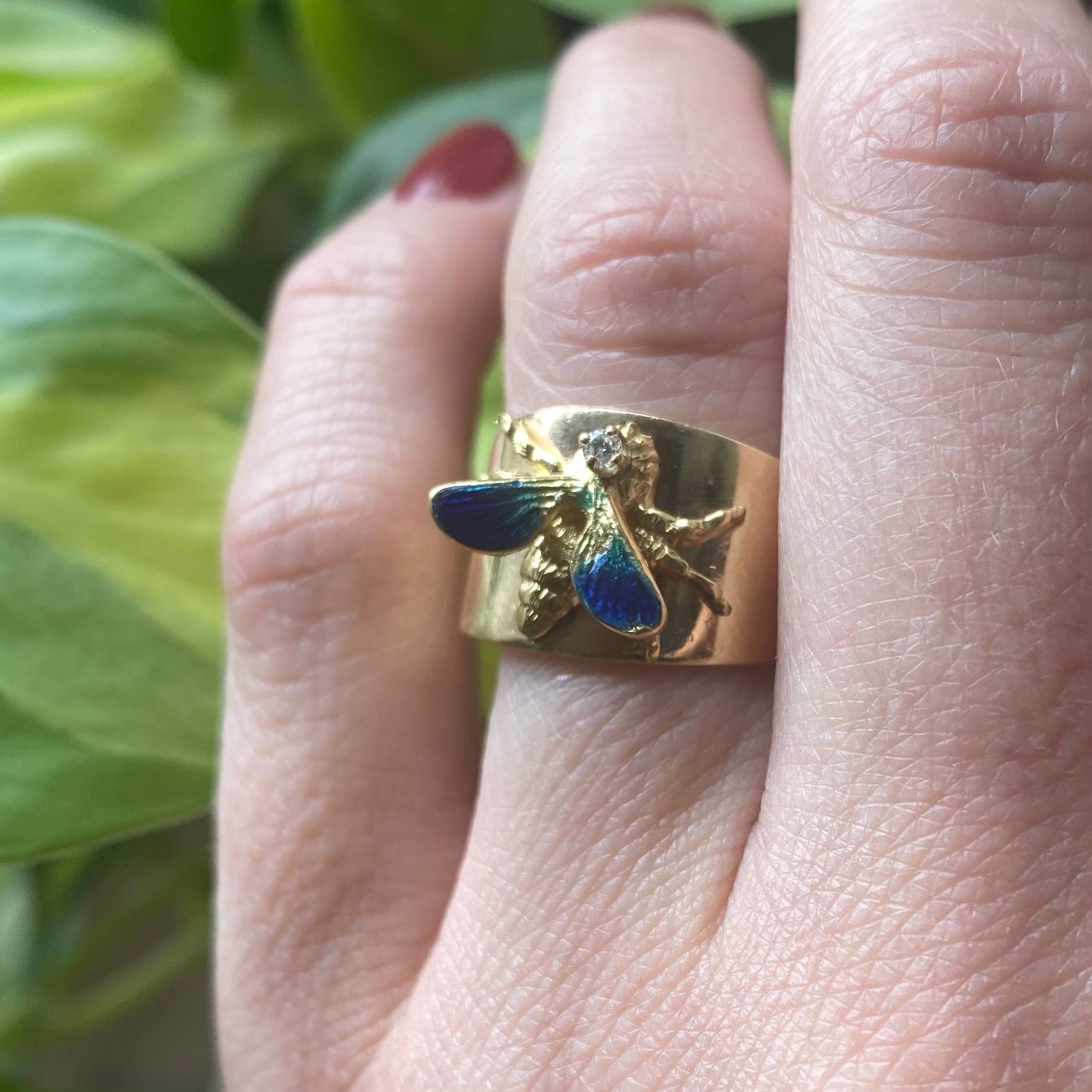 So many fabulous gold Estate pieces coming! A wonderful whimsical bee with enameled wings and a diamond set head adorns the front of this wide 14k yellow gold band. The way the bee sits on the tapered cigar band is delightful, the band dates from the 1970's.