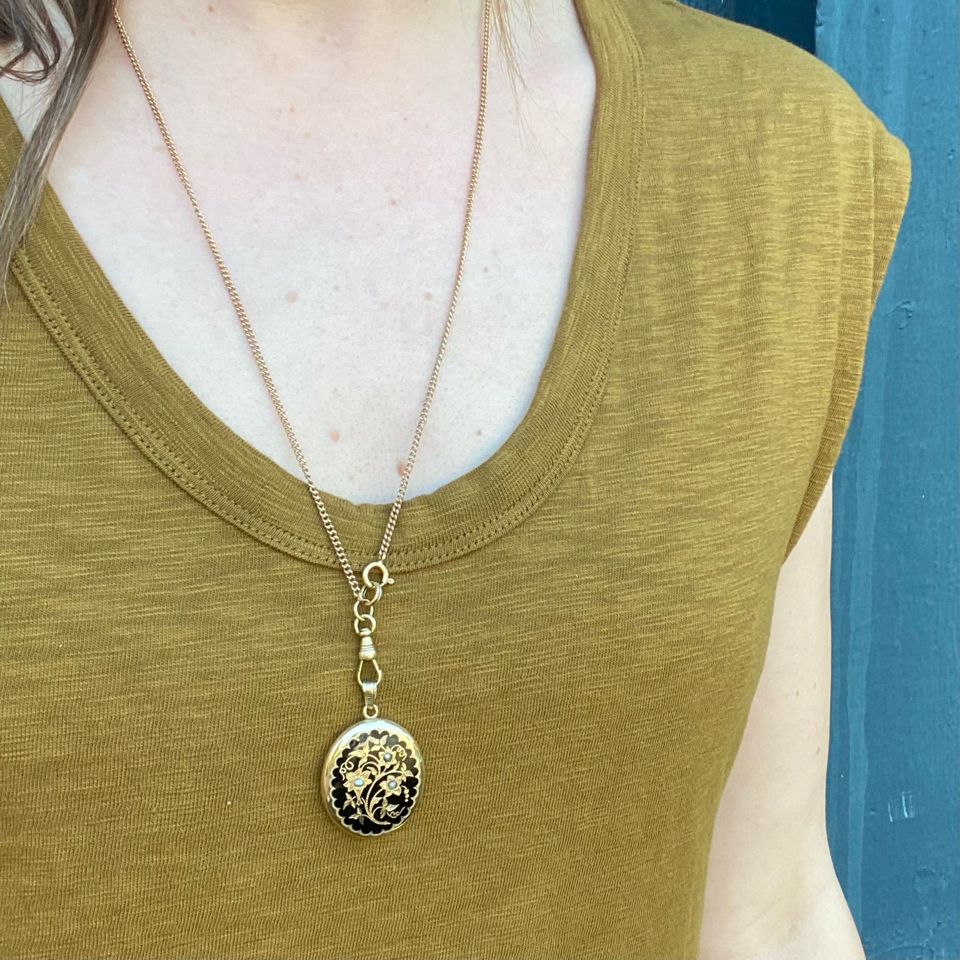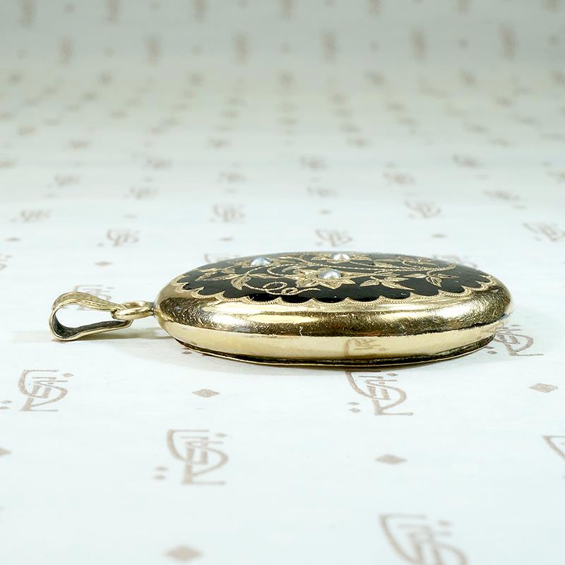 A fine Victorian locket with a beautiful floral motif. The body of this oval locket is made of 15ct gold; the front is enameled in black and engraved with flowers, leaves, tendrils and berries. Three flowers, morning glory perhaps, are set with tiny natural pearls. The decorative front of the locket is framed by a graceful scalloped pattern and the back is engraved with a geometric pattern that resembles scales or petals. The locket hangs from a decorative engraved bale. The interior is clean with intact frame and glass on one side and the piece snaps shut securely. Circa 1870.