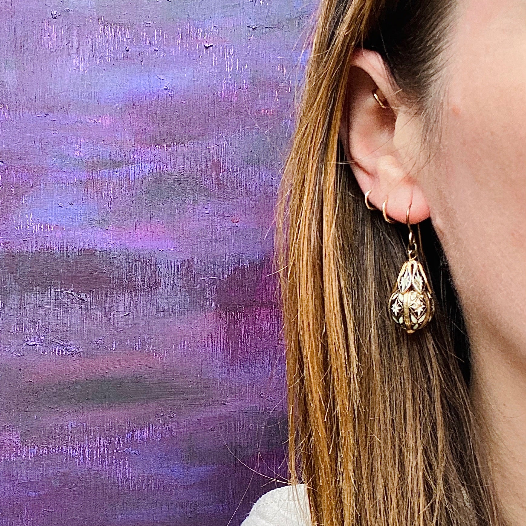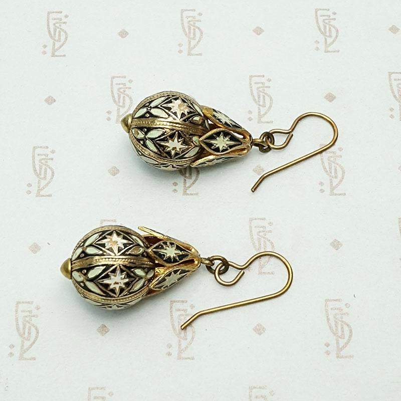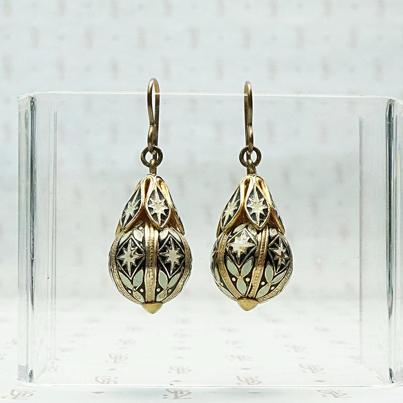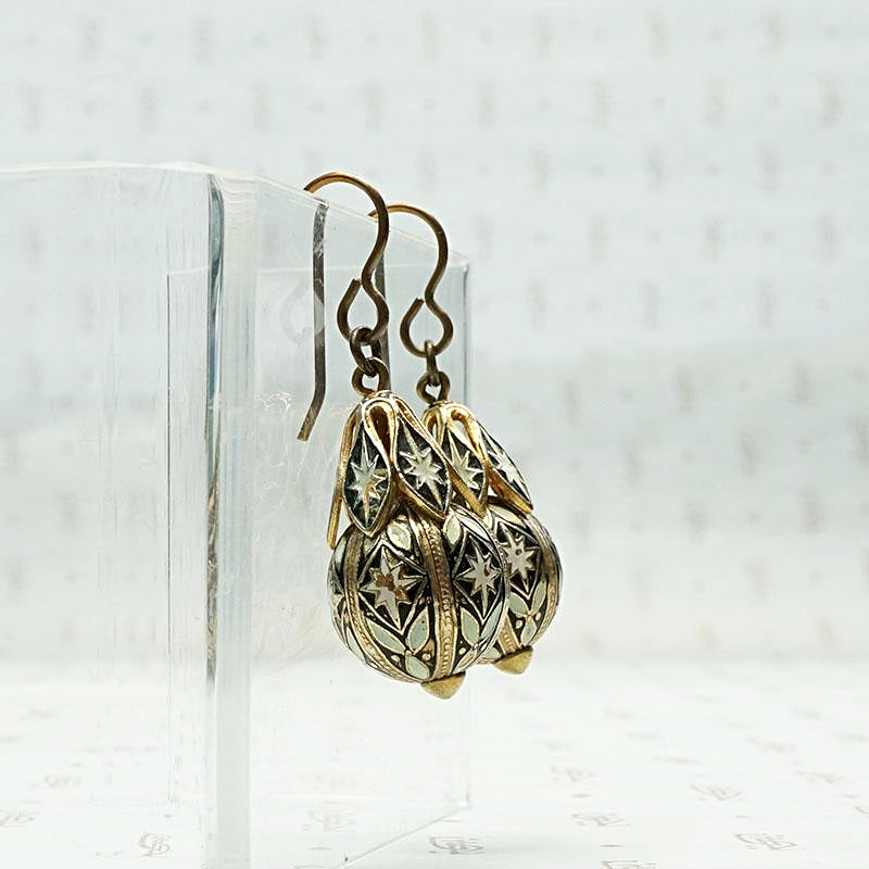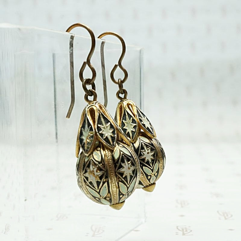 Ornate Victorian Revival drop earrings. The brass earrings are a graceful ball and cap design with copper ear wires. Elaborate designs are cold enameled in black, white and pale blue over the brass. These are very attractive, really eye catching and unusual. Circa 1950.