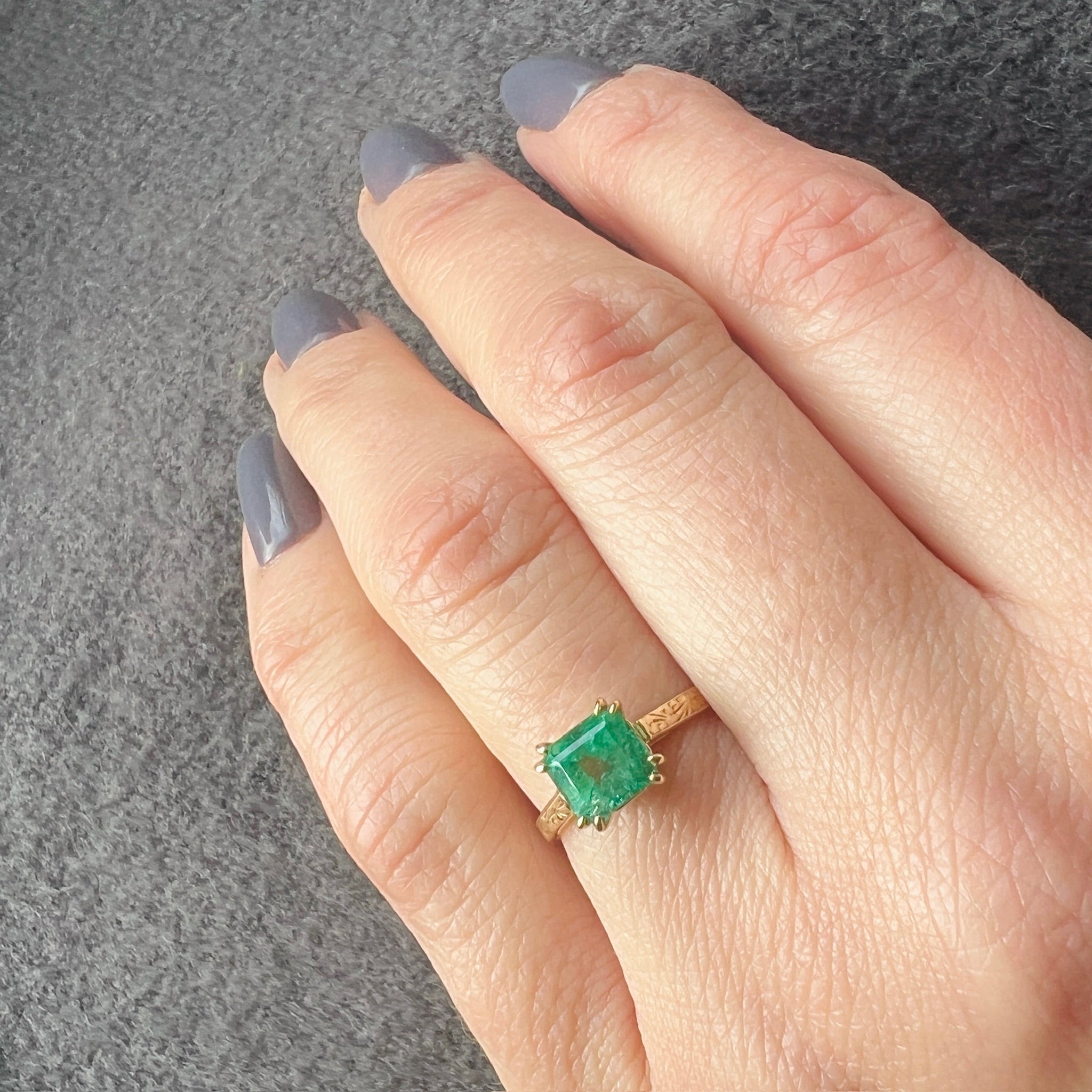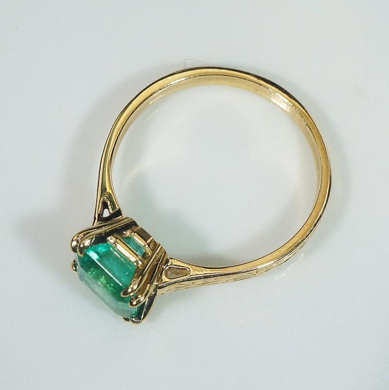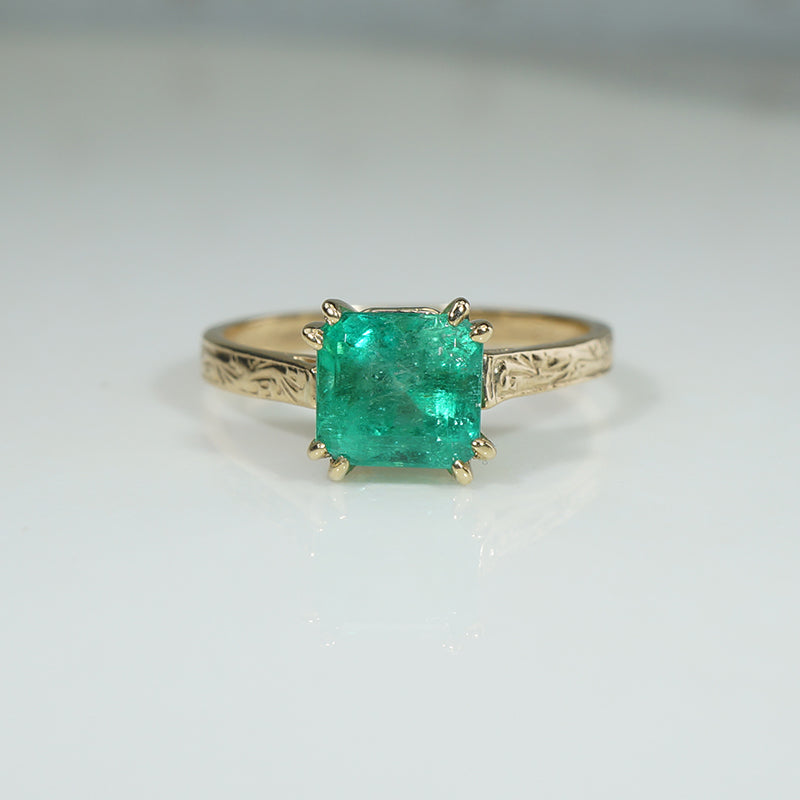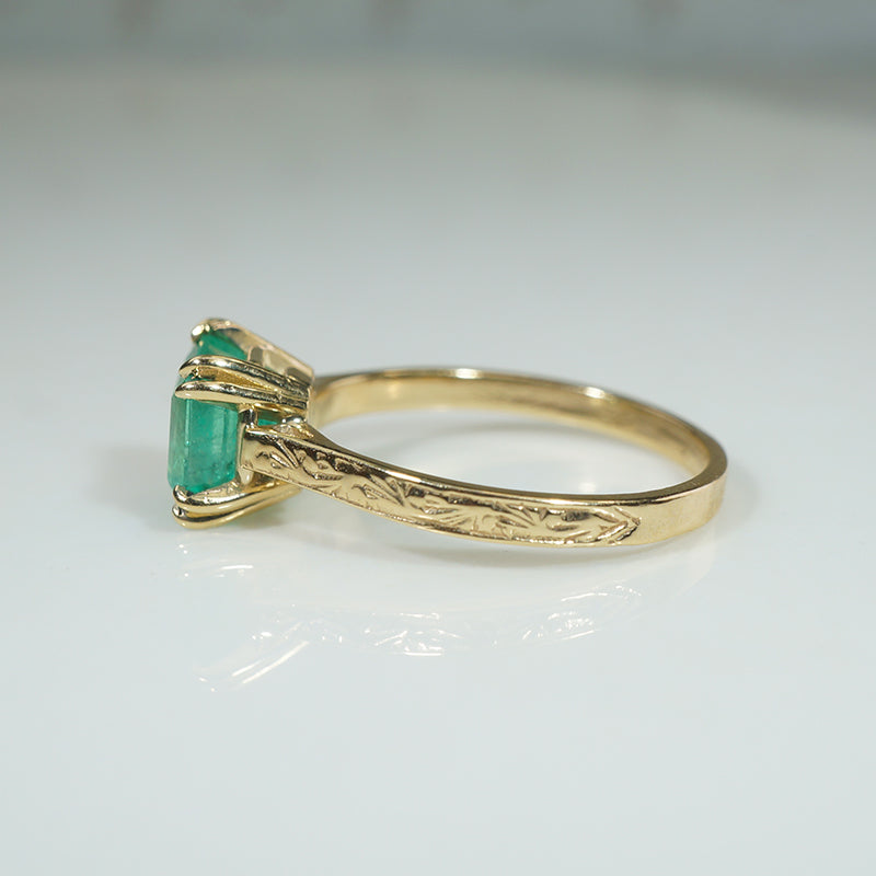 Enchanting Emerald in Engraved Gold Solitaire Ring