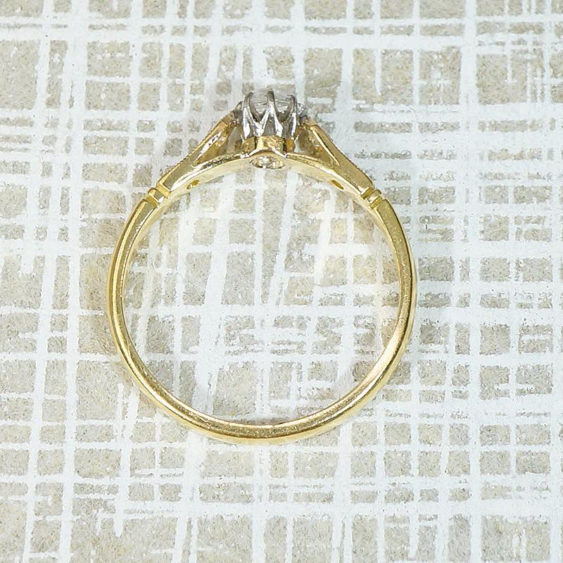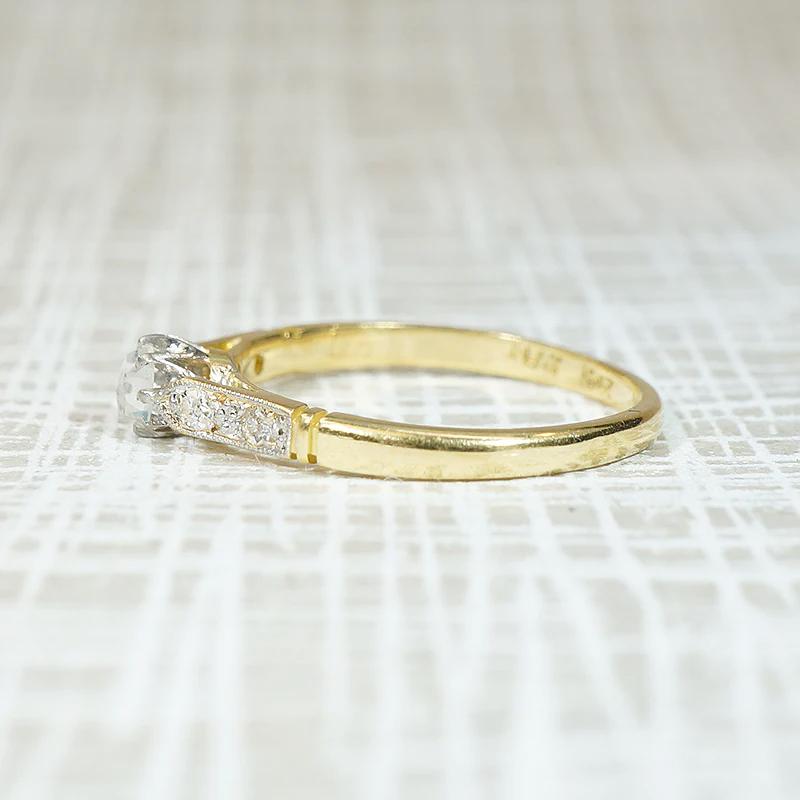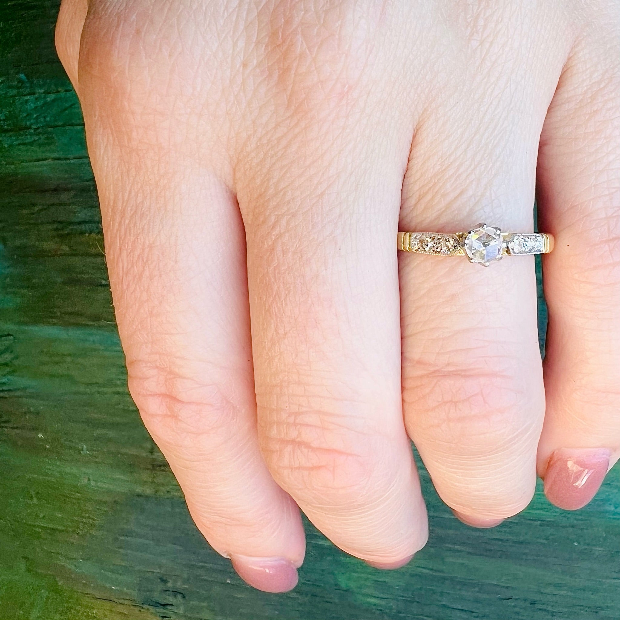 This enchanting engagement ring holds unexpected details that will steal your heart. The center stone is a glittering rose cut diamond, held prettily in an eight-prong platinum head. The prongs' delicacy showcases this unusual stone to its best advantage. The platinum head sits above an 18ct yellow gold ring. Two sparkling accent diamonds grace each milgrain engraved, cathedral shoulder. This is a special piece, with the vintage romance we all love. Circa 1930.