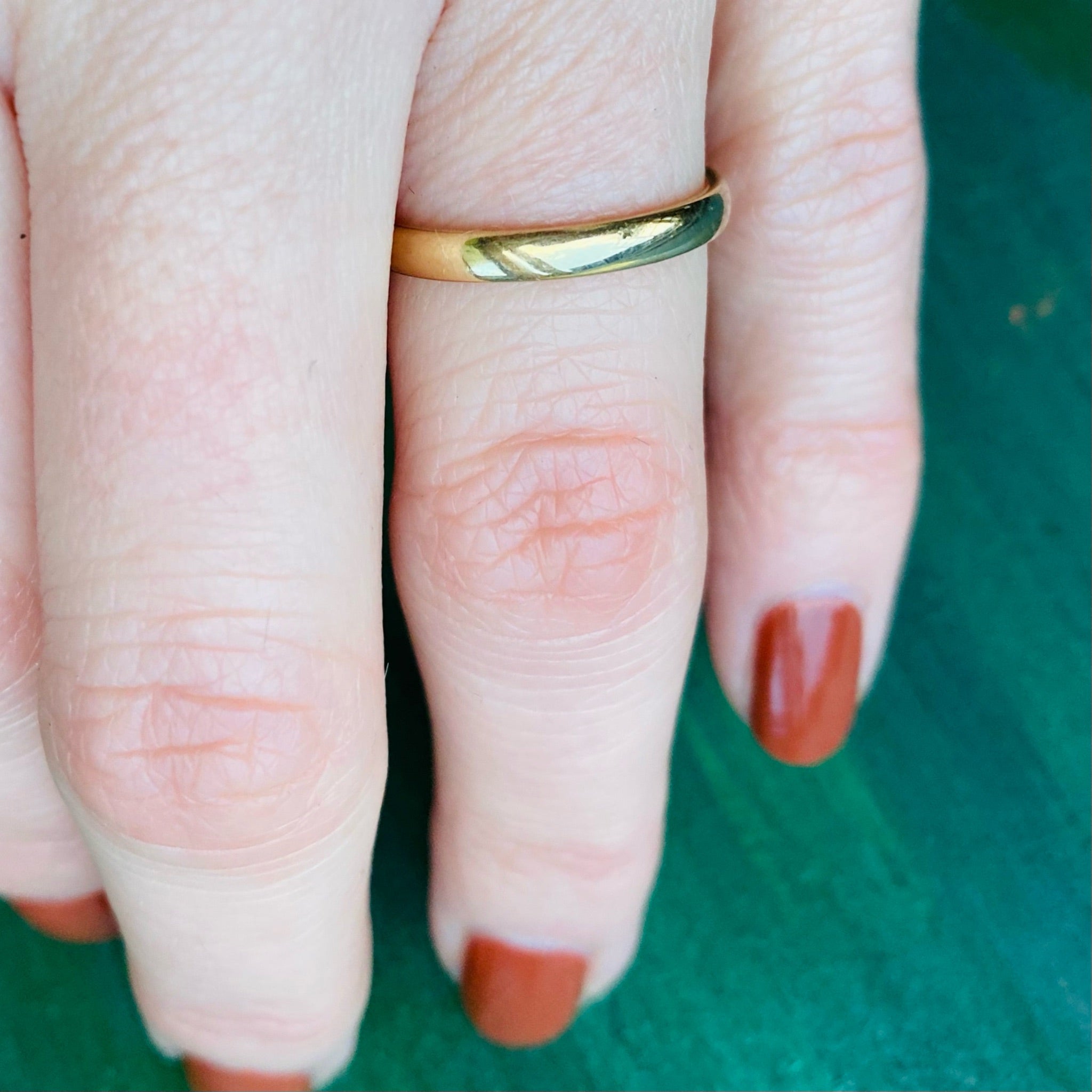 An English 18ct gold band with a curved interior, also known as comfort fit. This early WWII wedding band from the late 1930s has a pleasing weight, it feels smooth and comfortable on the hand. This lovely band is hallmarked for Birmingham, 18ct gold and the year 1939.