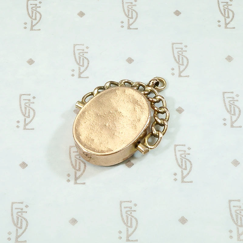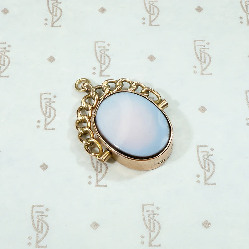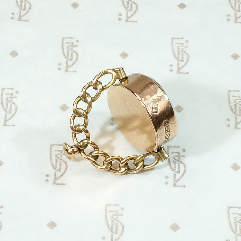 A mesmerizing banded agate is set in this lovely English swivel fob. The highly polished agate has a mysterious lucent quality. The stone is set in a sleek bezel of rosy 9ct gold that swivels in a frame of stationary chain link. A jump ring has been added to the integrated bale, making it easy to wear this fob on the chain of your choice. Hallmarked at the bottom for 9ct, Chester, England and the year 1909.