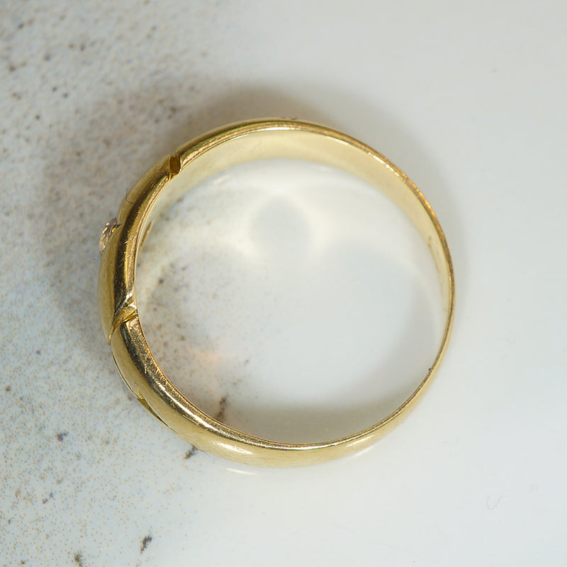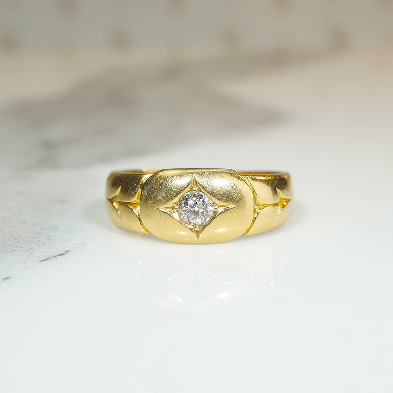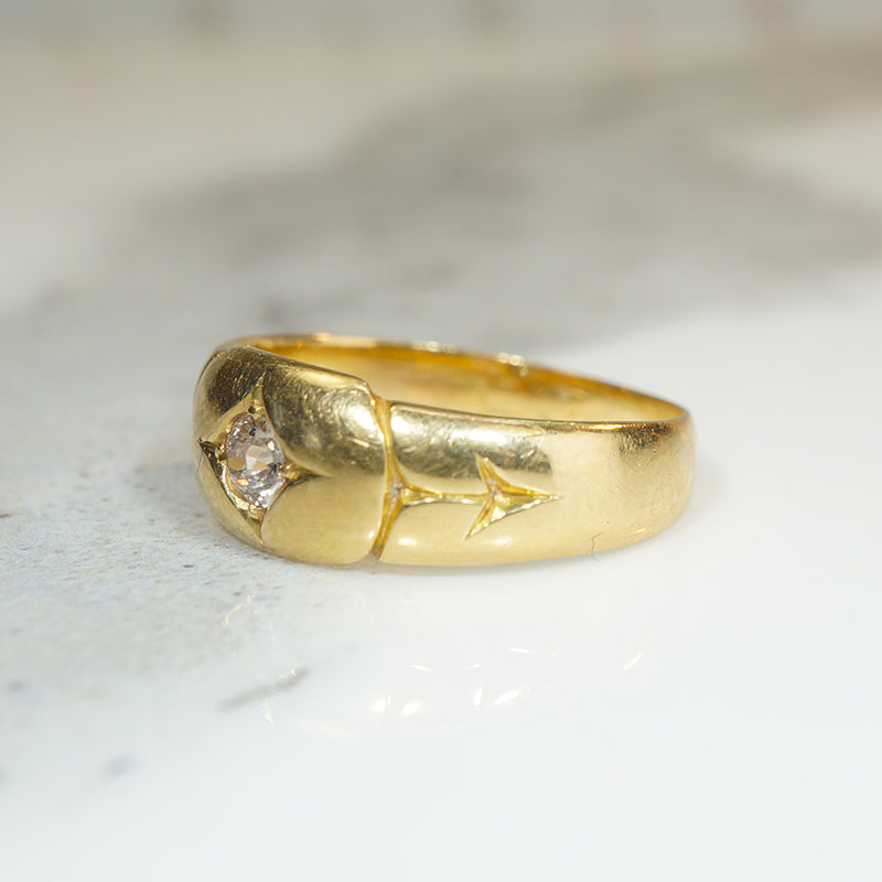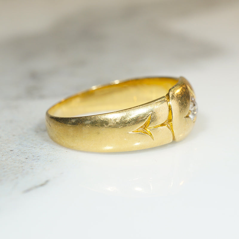 A Victorian-era English ring with unexpected details. The gently tapered 18ct gold band is center-set with a bright old mine-cut diamond; the .15ct stone is bead-set in an incised diamond shape. A soft oval is engraved around the top of the ring, creating the "eye" effect that was so popular at the turn of the 20th Century. Crisp arrows extend away from the oval, deeply engraved down the sides of the ring. It's a very subtle and interesting design. Circa 1890.