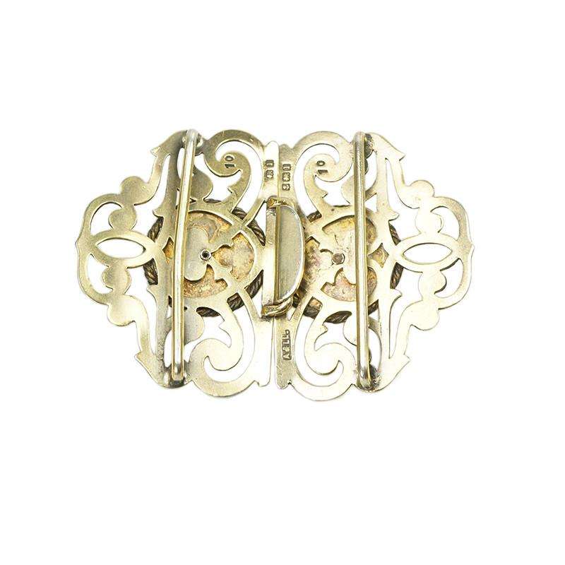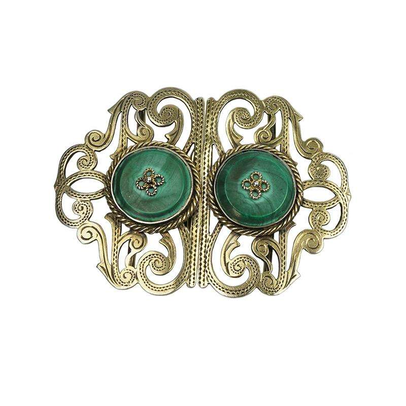 A very nice example of Edwardian English Silver. This buckle has wonderful hand engraving on its open cutwork surface. The center of each side of the buckle is bezel set with a deep green malachite, there is a twisted rope design surrounding each bezel and a twisted flower decoration atop each. The Buckle is English and Hallmarked on each side with the marks for Birmingham, Sterling, and the date letter for 1910-11. The silver is gilded with Gold.