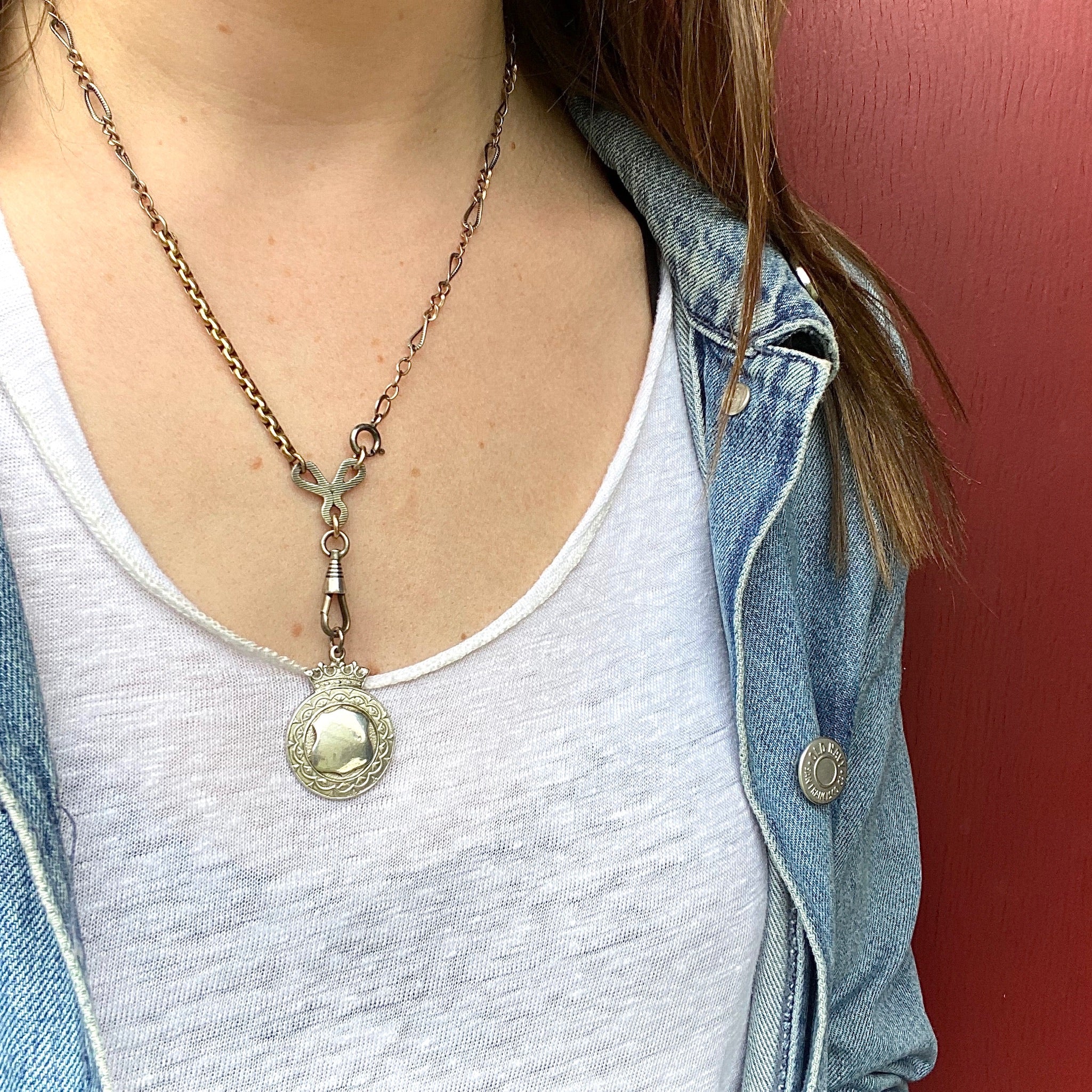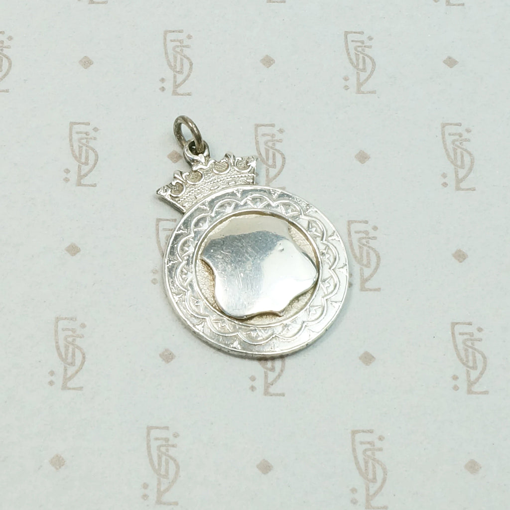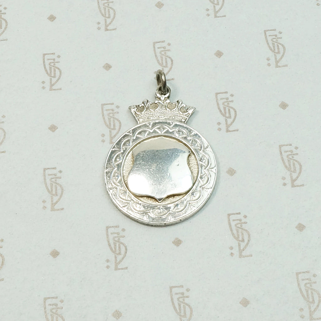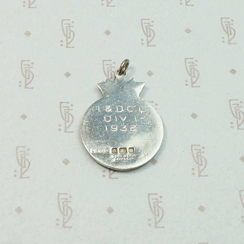 This English sterling silver fob features a shield framed by a ring of scalloped silver and topped with a crown. The front of the medal has no personal engraving. The back of the medal is engraved: I & D.C.L. DIV. 1 1938. This most likely refers to the Ipswich & District Cricket League. The back of the piece is hallmarked for London, sterling silver and the years 1936-37. It is also signed with the maker's mark for Toye & Co. Located in Covent Garden, London, Toye & Co. was founded in 1685. The company is still in existence and retains Toye family members. This lovely fob makes a great pendant, it has a sterling jump ring attached. Wear it on one of our Ancient Influences married chains to raise your Chain Game to the next level.