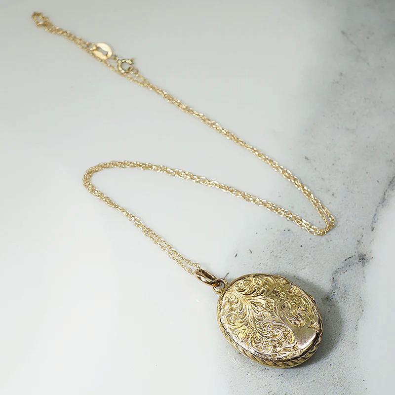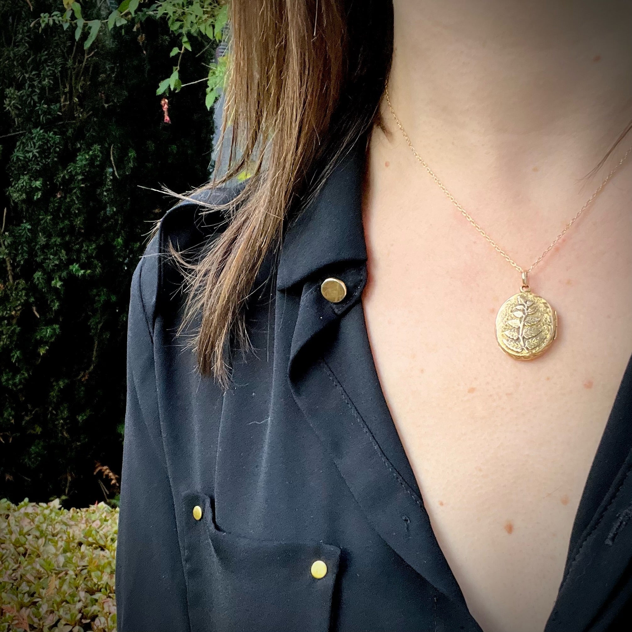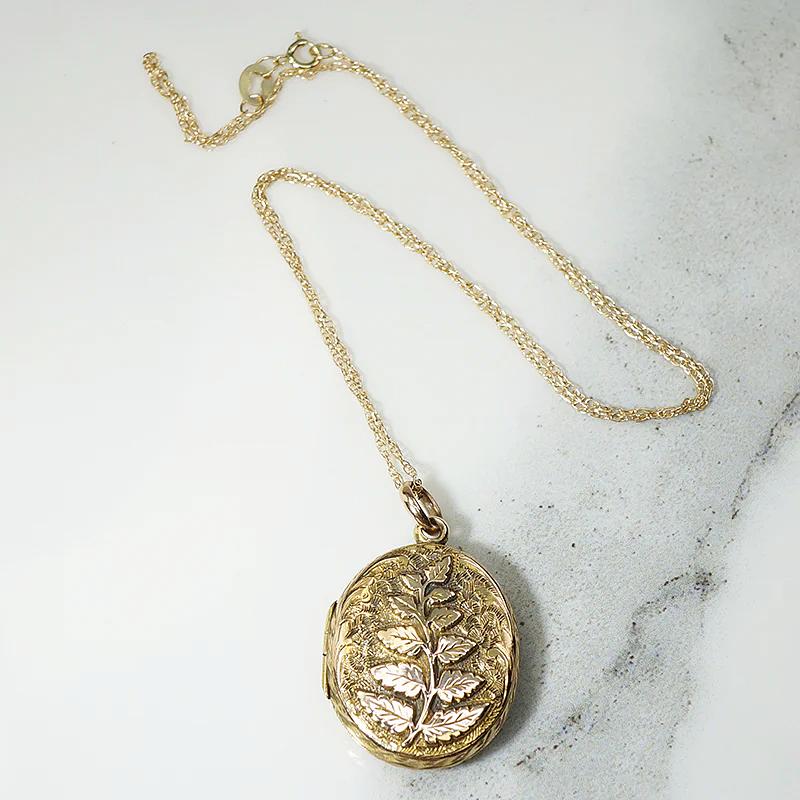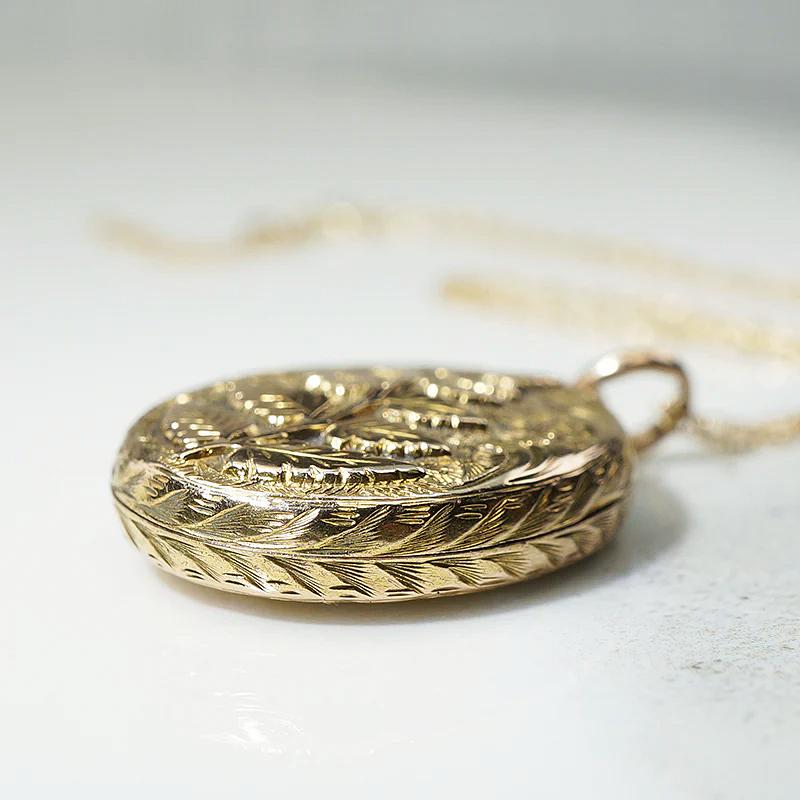 This charming antique 9ct gold locket is engraved front and back and adorned with a laurel frond overleaf. Elaborate engraved scrollwork covers both sides of the locket, and a feather-like pattern is engraved around its edges. Laurel leaves are applied to the front of the locket, with engraved detail. The interior of the locket is clean, with glass and frames on both sides. A jump ring bale suspends the piece from a modern 10k gold rope chain. Laurel is a symbol of victory and achievement making this locket a thoughtful graduation gift. Circa 1880.