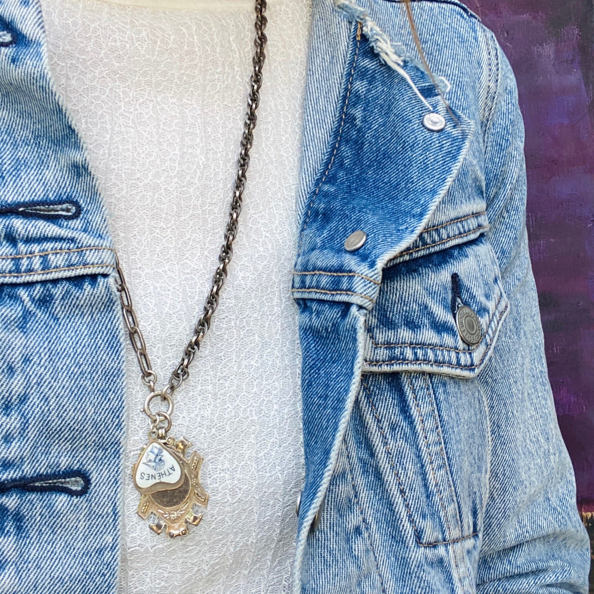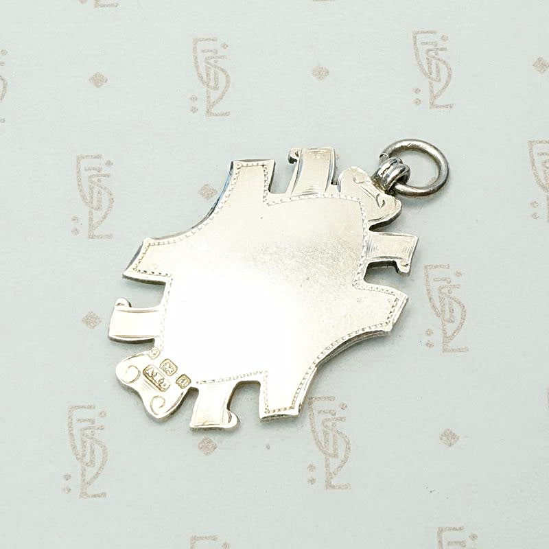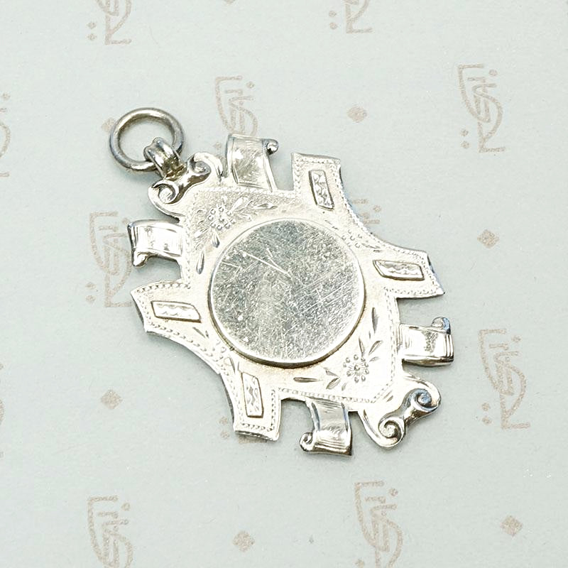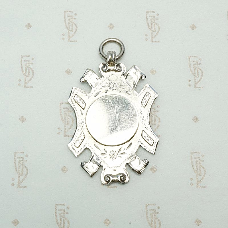 A pretty sterling silver fob pendant engraved with a scrolled floral design. This English fob is not engraved, and has a generously-sized jump ring for easy attachment to hooks and chains. This piece is hallmarked for Birmingham, sterling silver and 1900-1901. This fun and interesting fob will make a very handsome pendant, wear it on a ribbon or one of our Ancient Influences married chains.