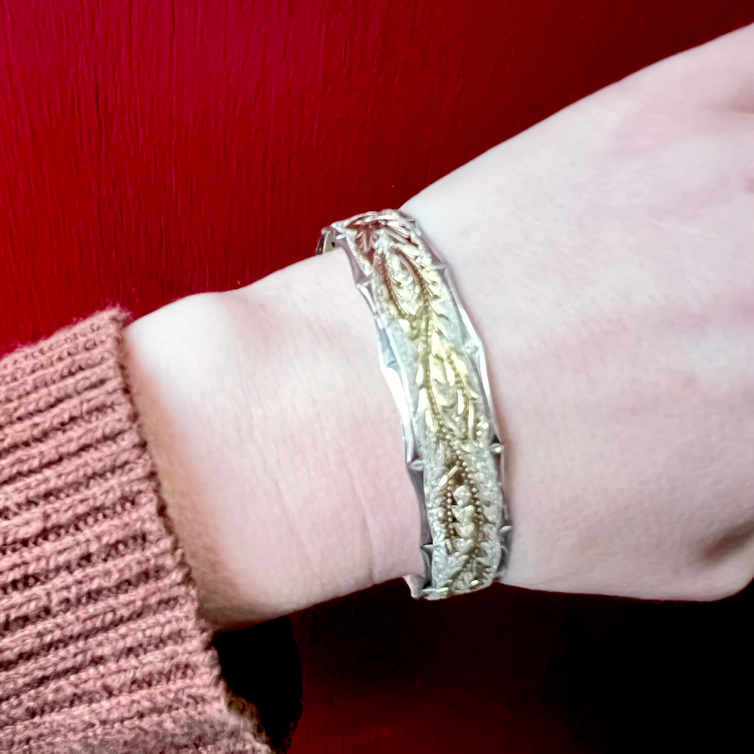This heavily engraved Hawaiian bangle evokes the natural beauty of that island paradise. Golden leaves and luxurious blossoms wreath the sterling silver bracelet, depicting an anthurium flower blooming on a bed of vines. The gold is layered over glittering silver with sculpted bamboo edges. This bracelet is New Old Stock, true vintage that has never been worn. Wear this lush bangle with your favorite summer dress for a little tropical romance. Circa 1980.