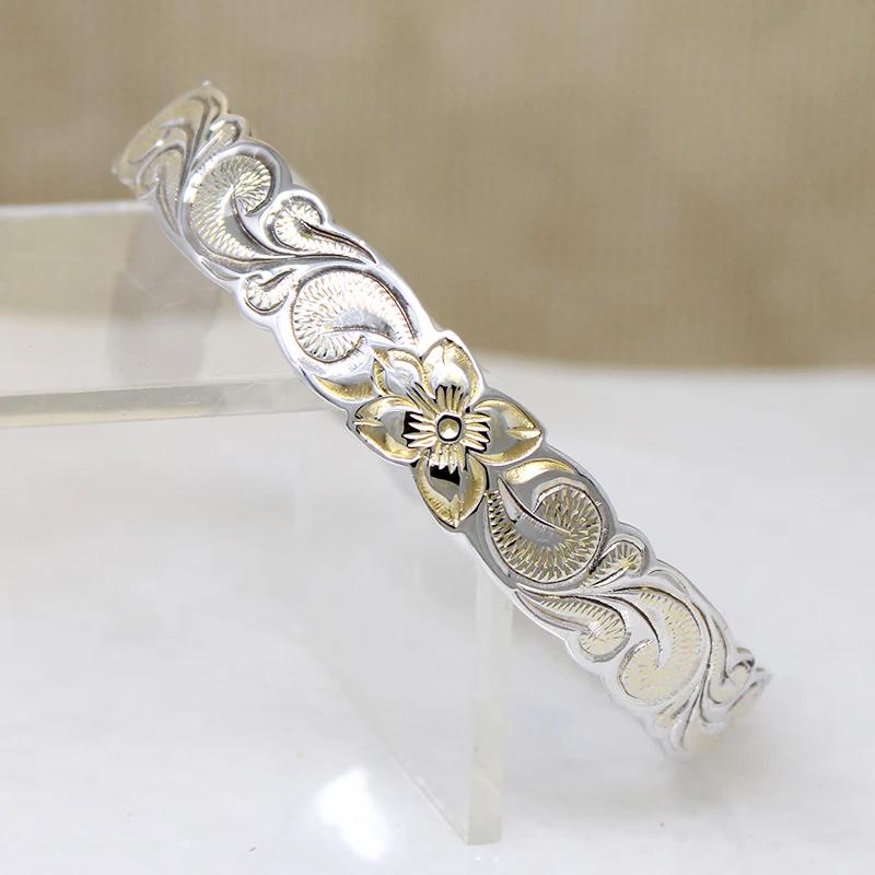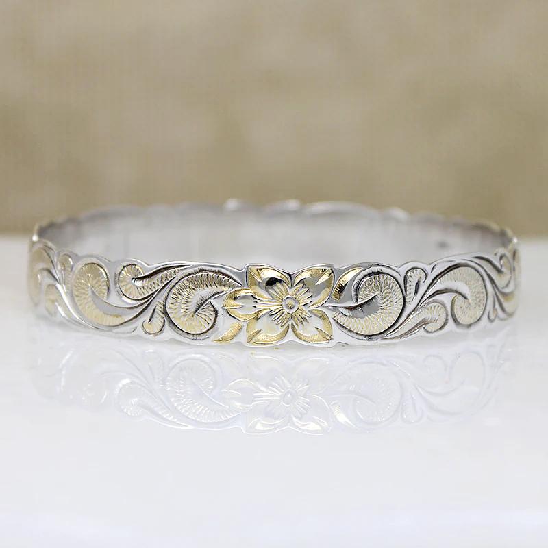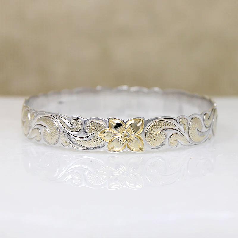 This sterling silver bangle is engraved with Hawaiian Pua Kala flowers, enhanced with a golden patina. Lush blossoms and chubby leaves curl around the silver bracelet. This piece is New Old Stock, true vintage that has never been worn. Add some island romance to any outfit with this tropical bangle. Circa 1980.